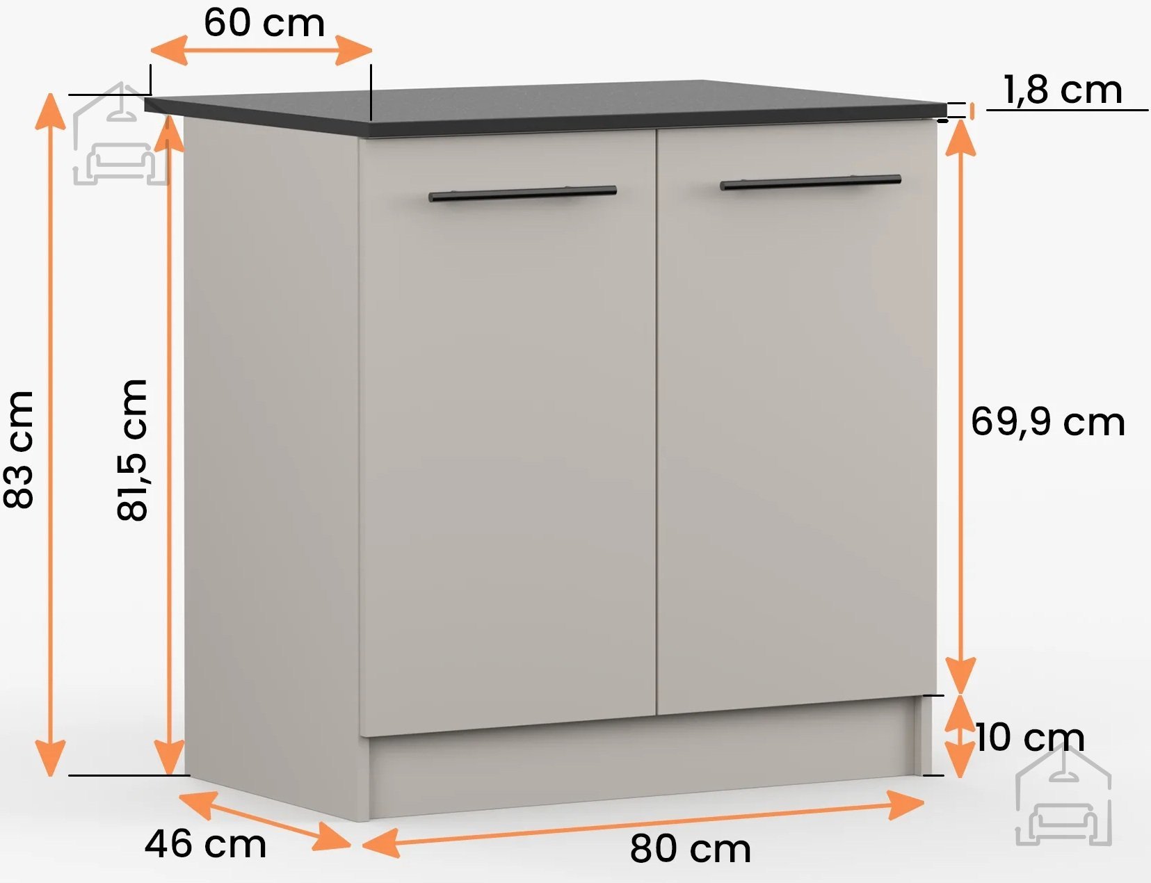 Dimenzije 80x46x85 cm omogočajo, da se omara Inez V popolnoma prilega manjšim ali večjim kuhinjam. Kljub kompaktni širini ponuja dovolj prostora za shranjevanje osnovnih kuhinjskih pripomočkov, posode ali živil. V notranjosti je prostor razporejen premišljeno, tako da lahko vsak centimeter uporabite kar najbolj učinkovito. Zaradi svoje višine se lepo poravna z drugimi spodnjimi elementi kuhinje in omogoča enotno delovno površino.