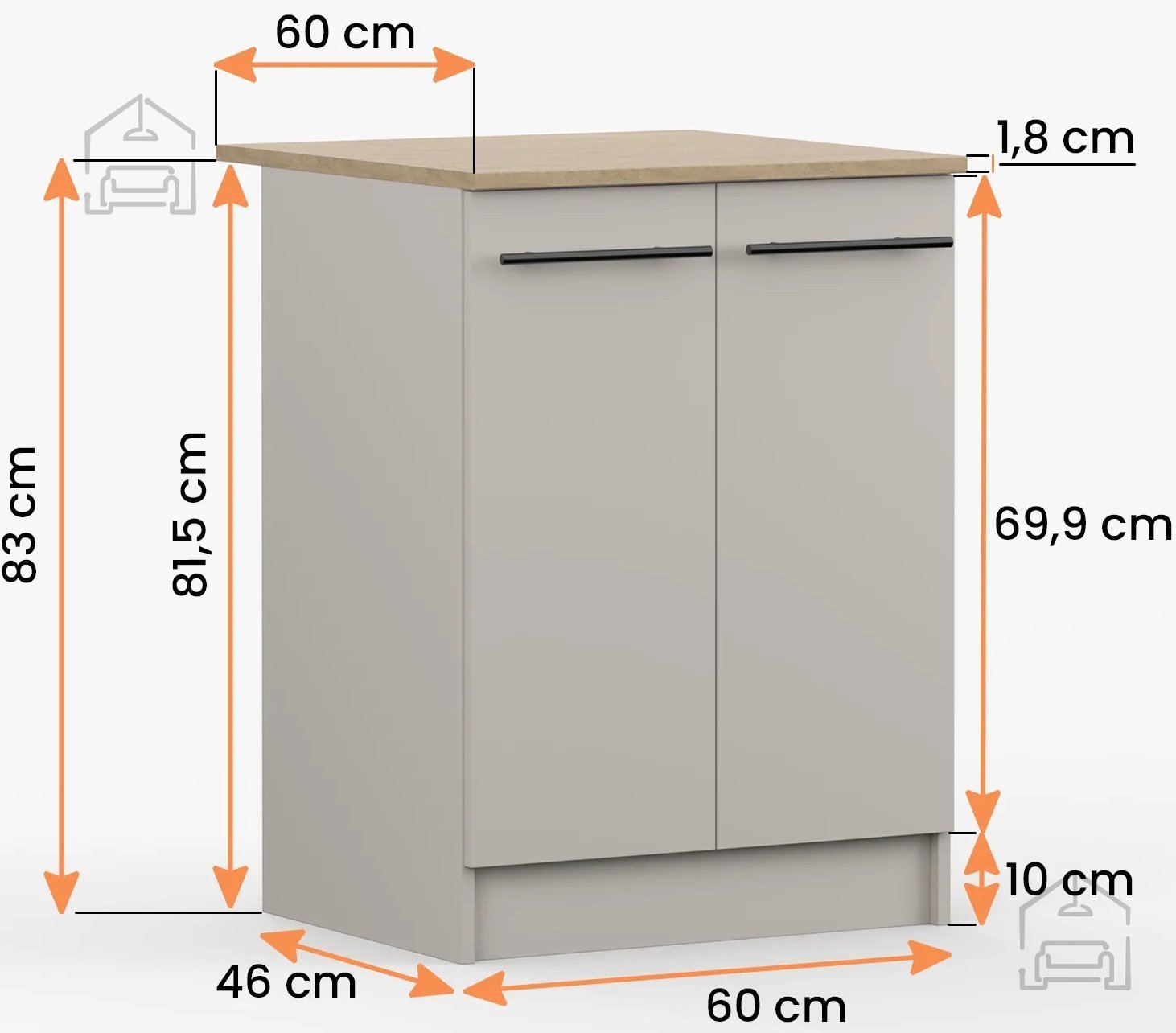 Te mere omogočajo prilagodljivo postavitev omare v skoraj vsak kuhinjski prostor. Višina 85 cm je skladna s standardno višino kuhinjskih pultov, kar pomeni, da se element lahko brez težav vključi v obstoječo linijo spodnjih omaric. Zaradi enostavnih linij in nevtralne barve se omara lepo ujema z različnimi dekorji, kar omogoča harmonično celoto tudi pri kombiniranju z elementi drugih serij.