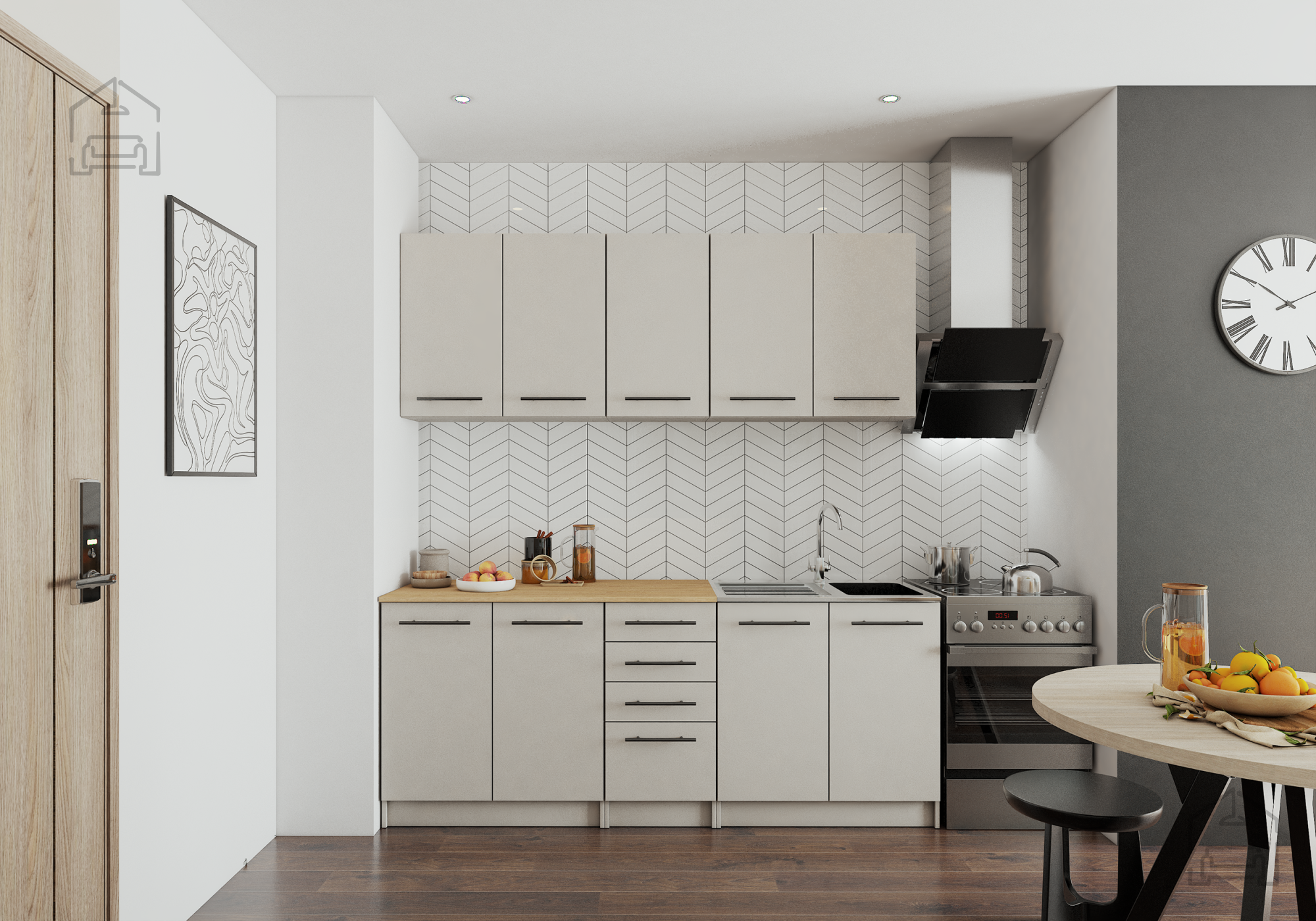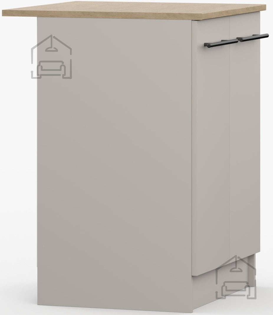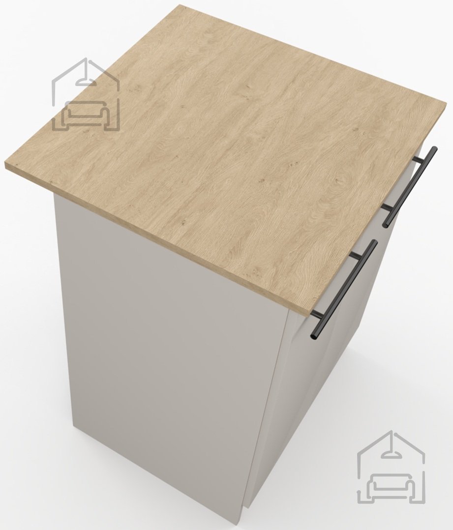 Izdelek je zaključen v topli barvi kašmir, ki v prostor vnese občutek mirnosti in prefinjenosti. Gre za univerzalno barvno rešitev, ki se lepo dopolnjuje tako s svetlimi kot temnejšimi kuhinjskimi elementi. Pult iz dekorja kamniti hrast doda naravni značaj in rahlo rustikalno noto, kar ustvarja uravnoteženo kombinacijo med modernim in klasičnim slogom. Takšna barvna kombinacija omogoča preprosto vključitev omare v različne notranje stile – od minimalističnih do tradicionalnih kuhinj.