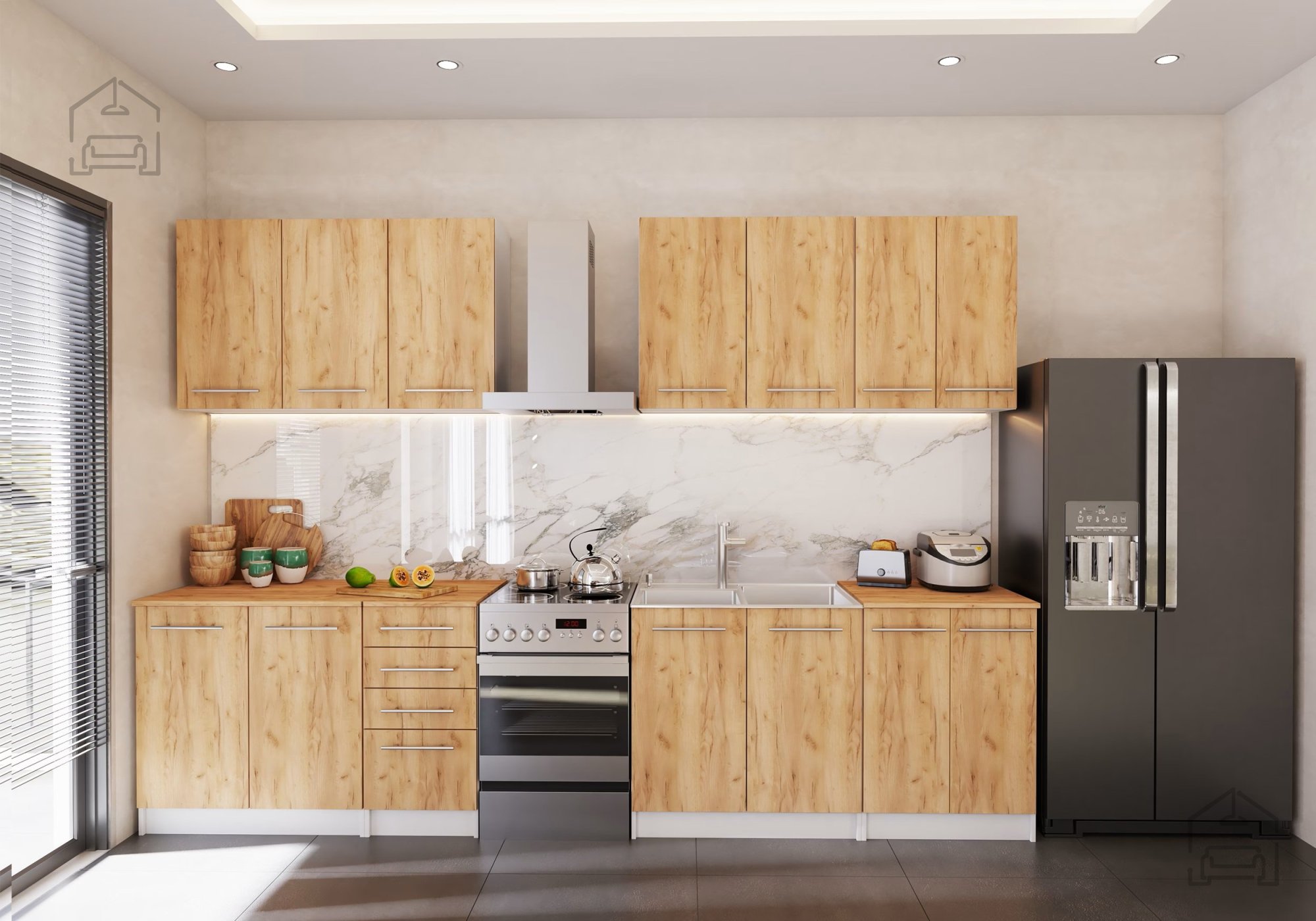 Elementi sestava so zasnovani tako, da omogočajo preprosto montažo. Površine je mogoče hitro očistiti z vlažno krpo in blagim čistilom, brez potrebe po posebnih sredstvih za nego. Laminirana plošča ohrani svoj videz tudi po večletni uporabi, kar pomeni, da bo vaša kuhinja dolgo ostala privlačna in funkcionalna.