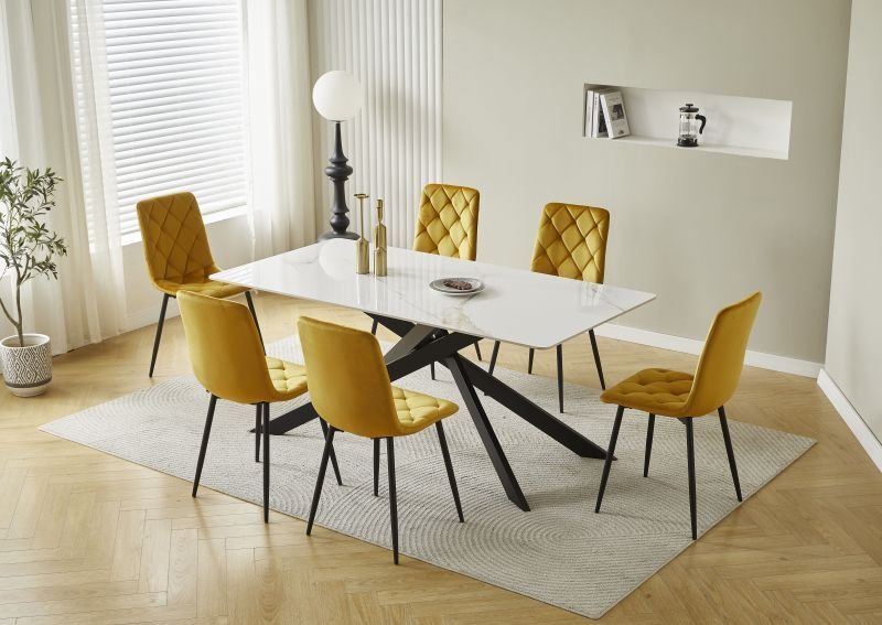 Predstavljamo vam jedilno mizo Marigold 2, popolno izbiro za tiste, ki cenijo prefinjenost in udobje v svojih bivalnih prostorih. Ta miza, z dimenzijami 180x90x75 cm, združuje sodoben stil s klasičnim videzom, ki spominja na brezčasno lepoto belega marmorja obogatenega z zlatimi detajli.