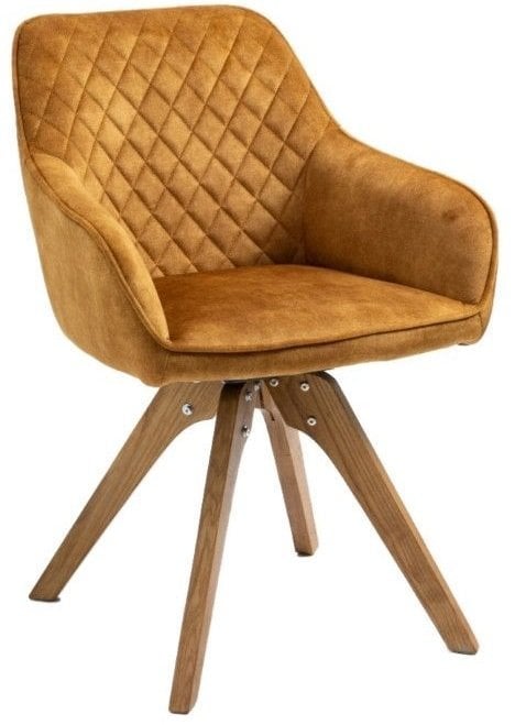 Zadnji del hrbtišča je okrašen z dekorativnim prešitjem v rombastem vzorcu, ki daje stolu prepoznaven značaj in dodatno teksturno globino. Curcuma tkanina se lepo ujema z naravno barvo jesenovega lesa, kar ustvarja harmonično in umirjeno barvno kombinacijo, primerno za različne notranje stile – od skandinavskega minimalizma do sodobne elegance. Kljub mehki površini je material trpežen in enostaven za vzdrževanje, zato bo stol ohranil svež videz tudi po večletni uporabi.