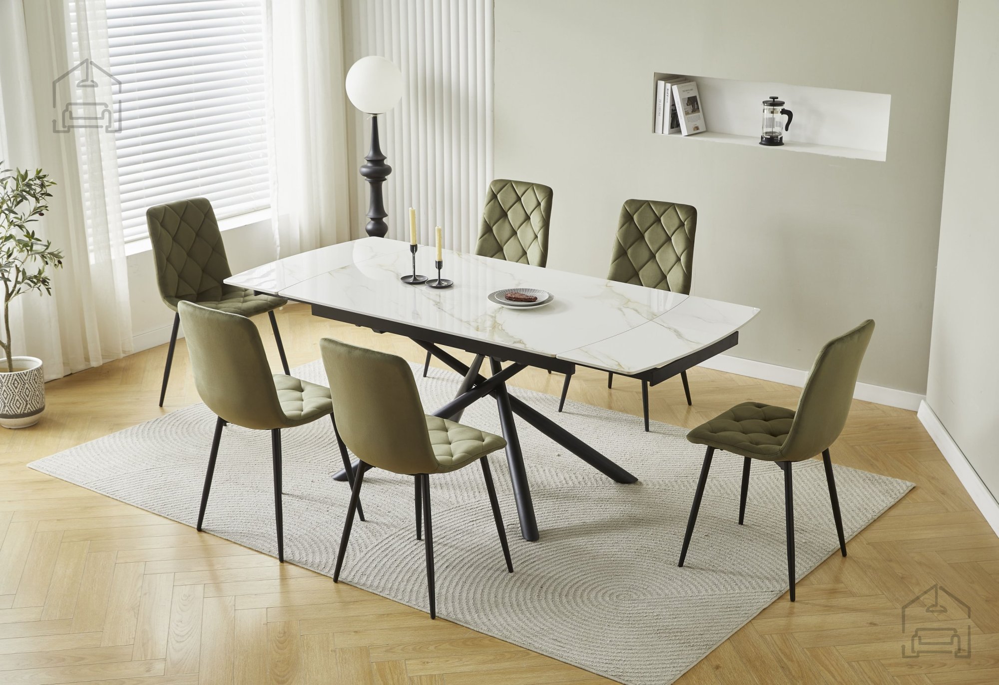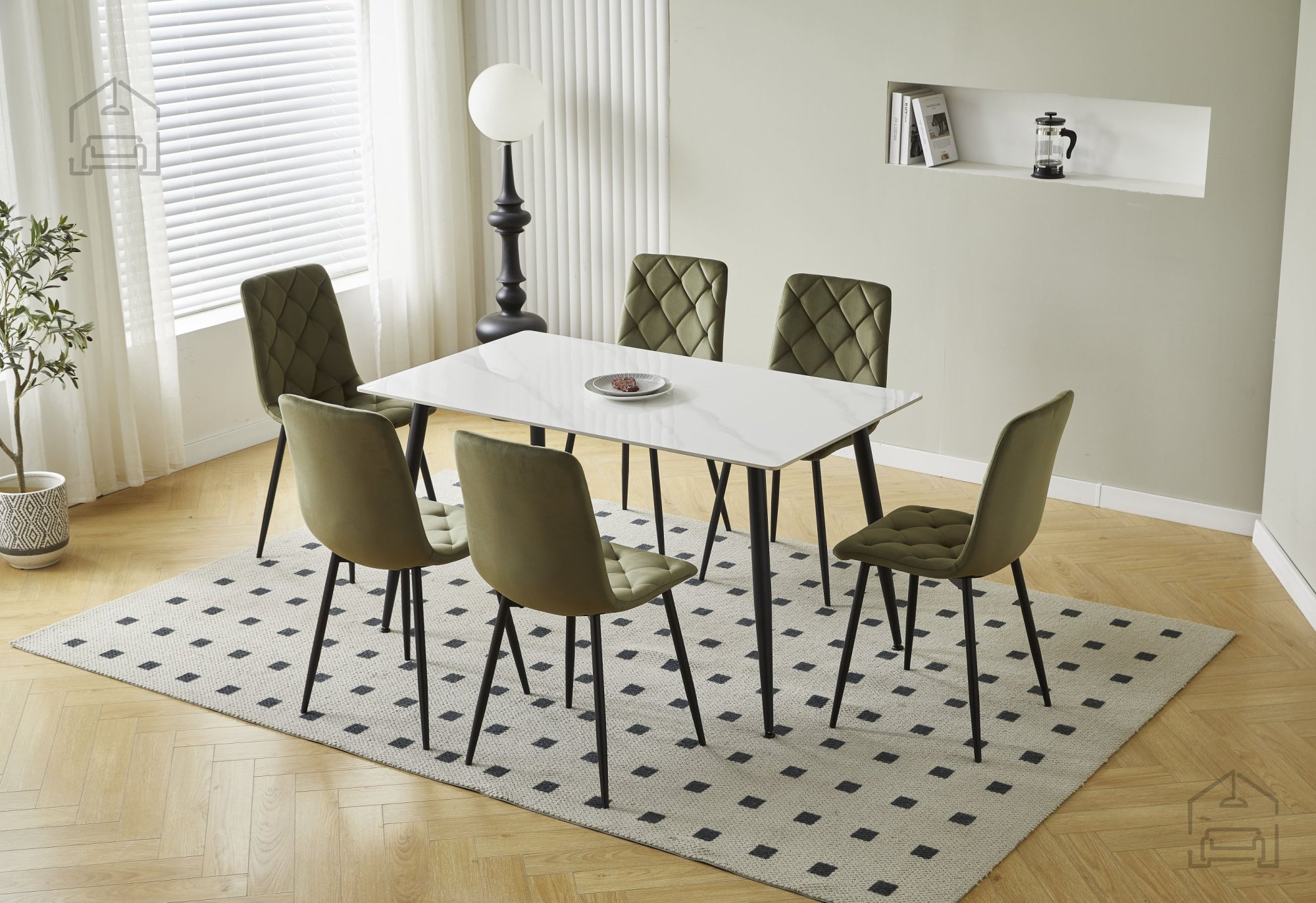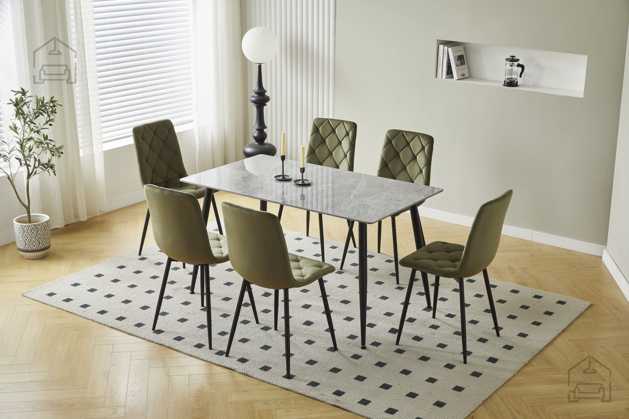 Jedilniški stol Larry v zeleni barvi združuje sodoben videz, funkcionalnost in udobje, ki ga pričakujemo pri vsakodnevni uporabi. Njegova elegantna silhueta in uravnotežen kontrast med mehko tkanino ter črnim kovinskim ogrodjem ustvarjata prefinjen vtis, primeren za različne tipe notranje opreme – od modernih do klasičnih jedilnic. Izdelek prihaja iz tovarne Fola, izdelan pa je na Kitajskem, kar zagotavlja preverjeno kakovost in skrbno izdelavo vsakega detajla.