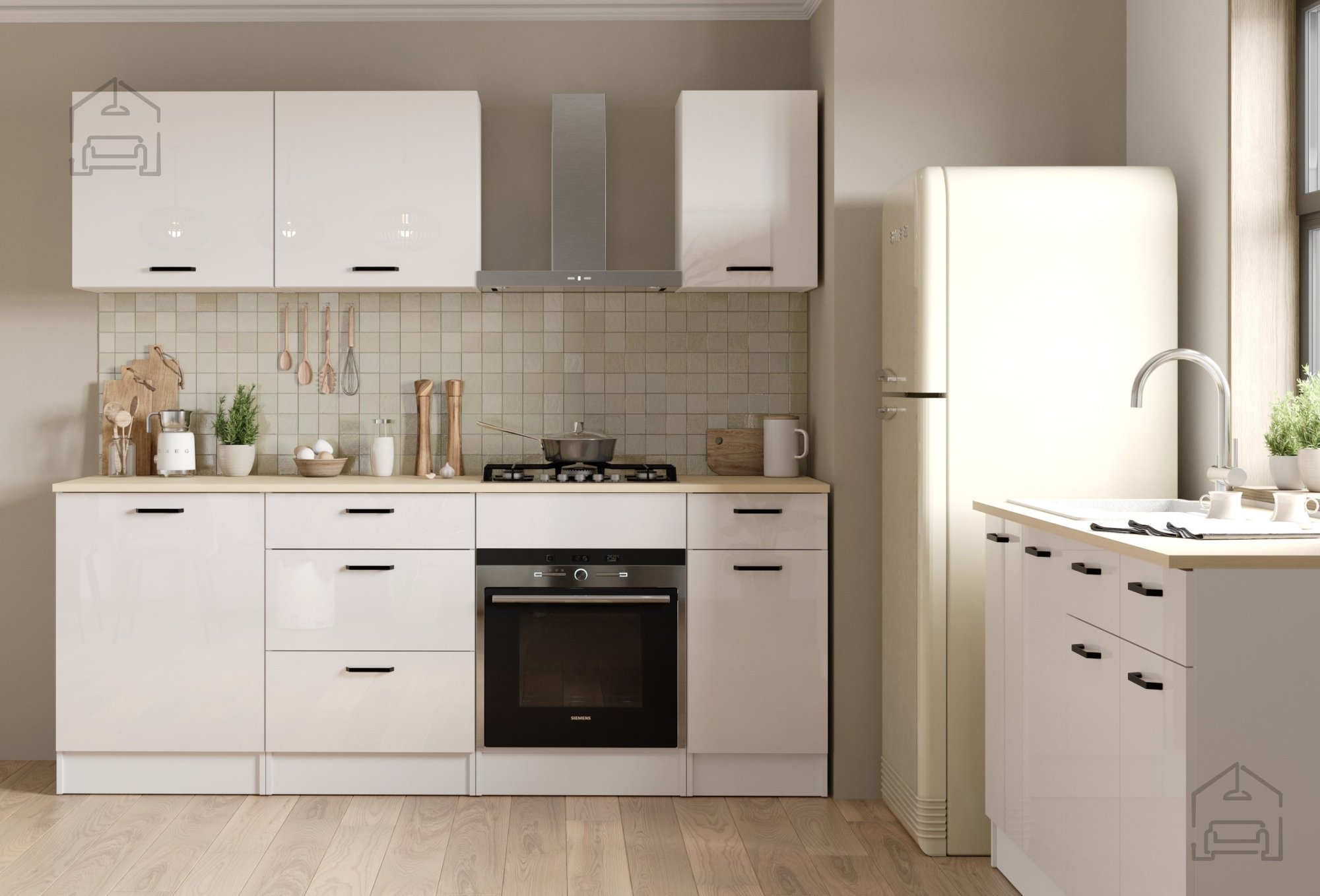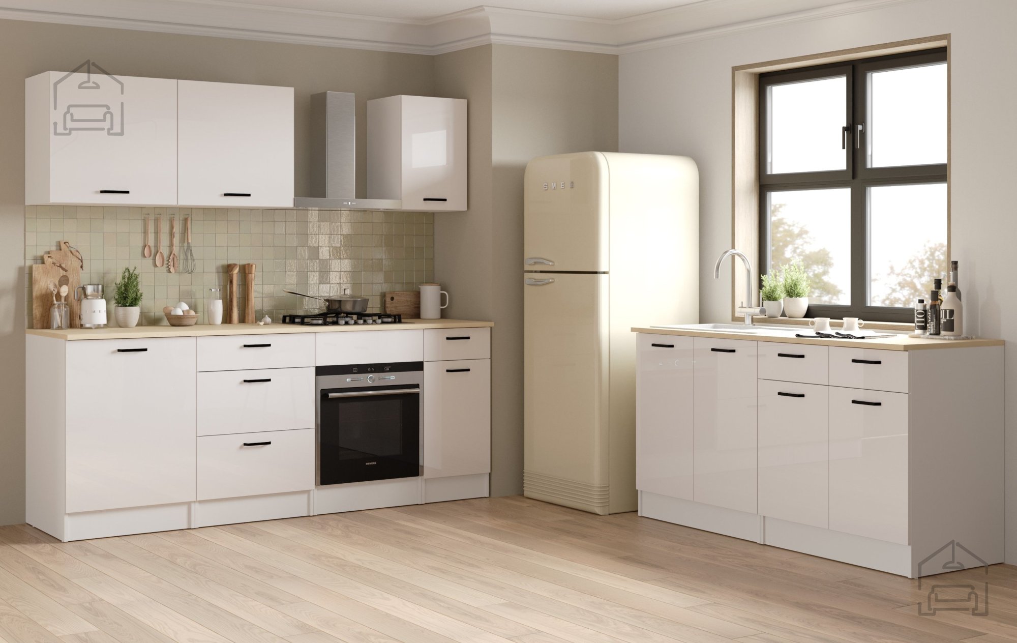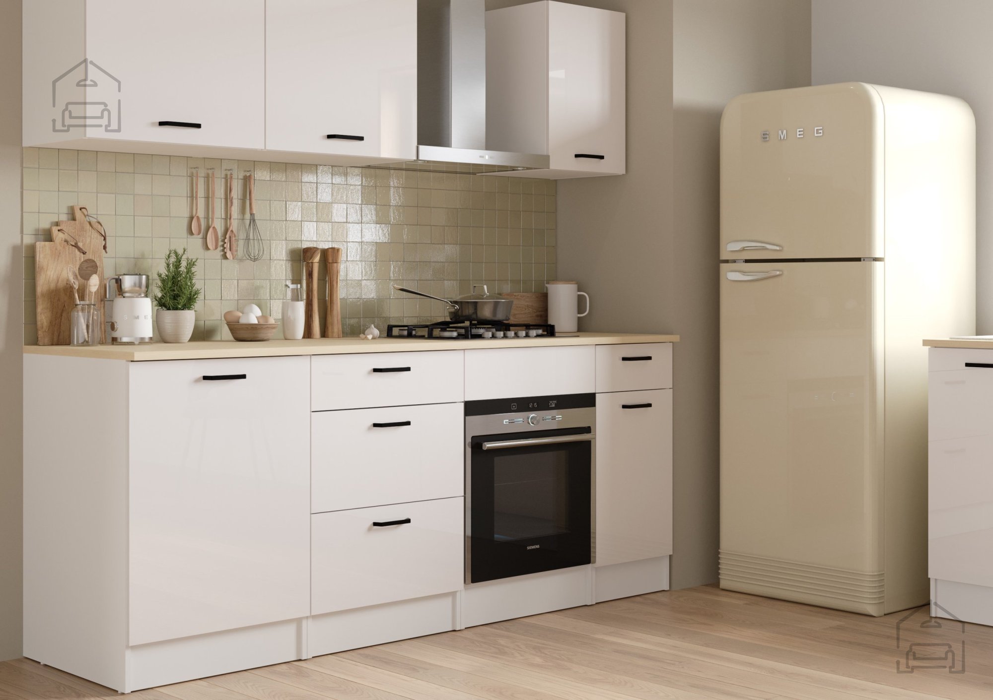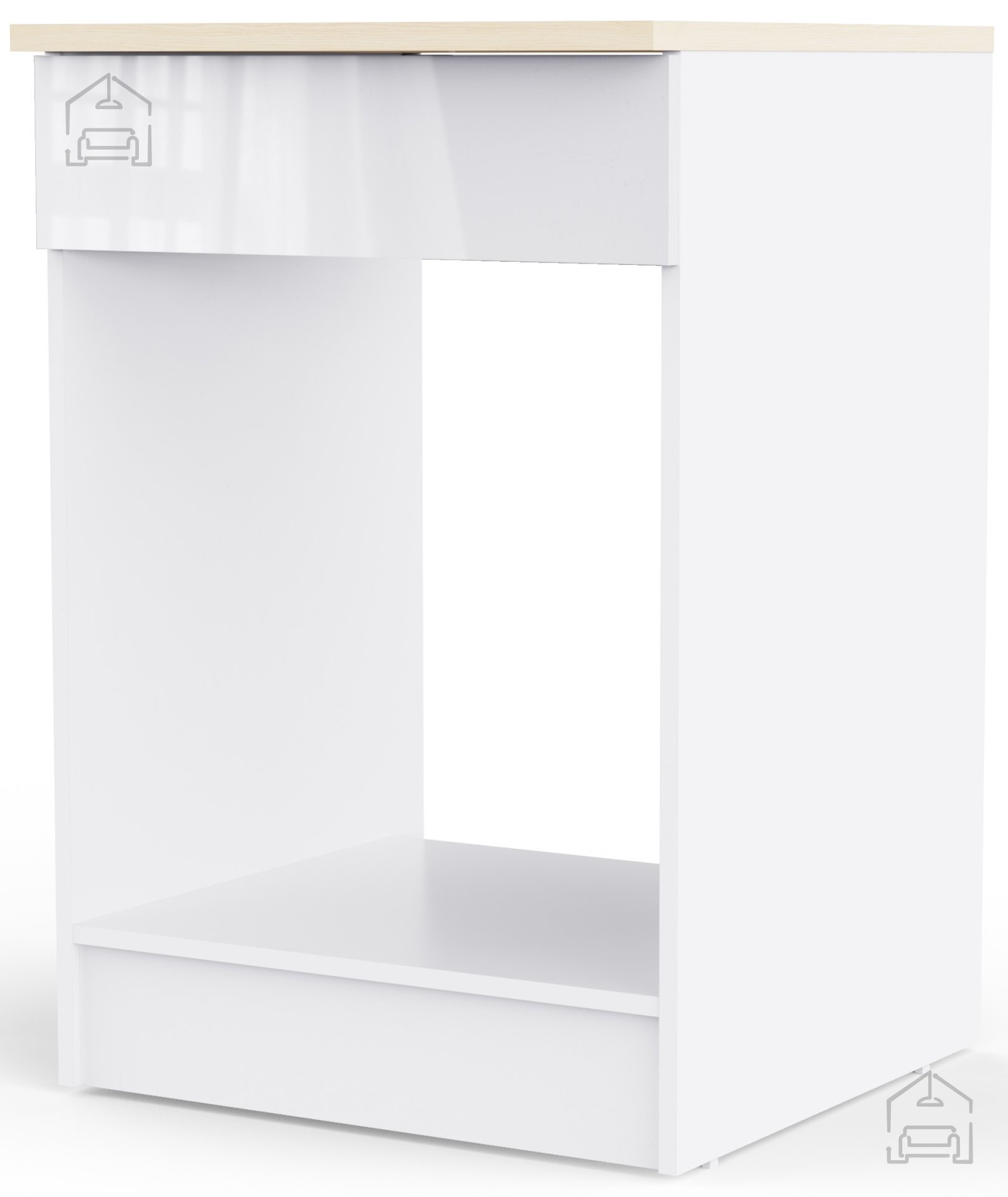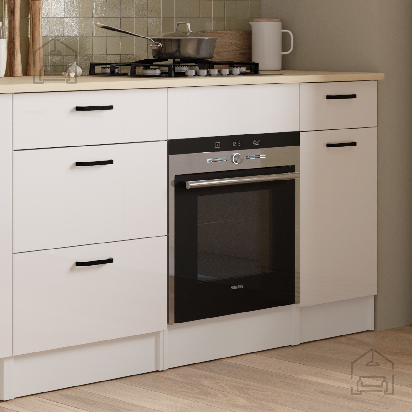 Zaradi sijajne bele fronte se omarica Bianco 4 brez težav kombinira z drugimi elementi iz linije Bianco ali drugimi belimi kuhinjskimi moduli. Površina v visokem sijaju odseva svetlobo in vizualno poveča prostor, kar je še posebej pomembno v manjših kuhinjah. Kombinacija sijajne bele z detajli v imitaciji lesa ustvari prijeten kontrast, ki deluje sodobno in domače hkrati. Omarica je namenjena za postavitev pod delovni pult ali kot samostojen modul v nizu spodnjih elementov.