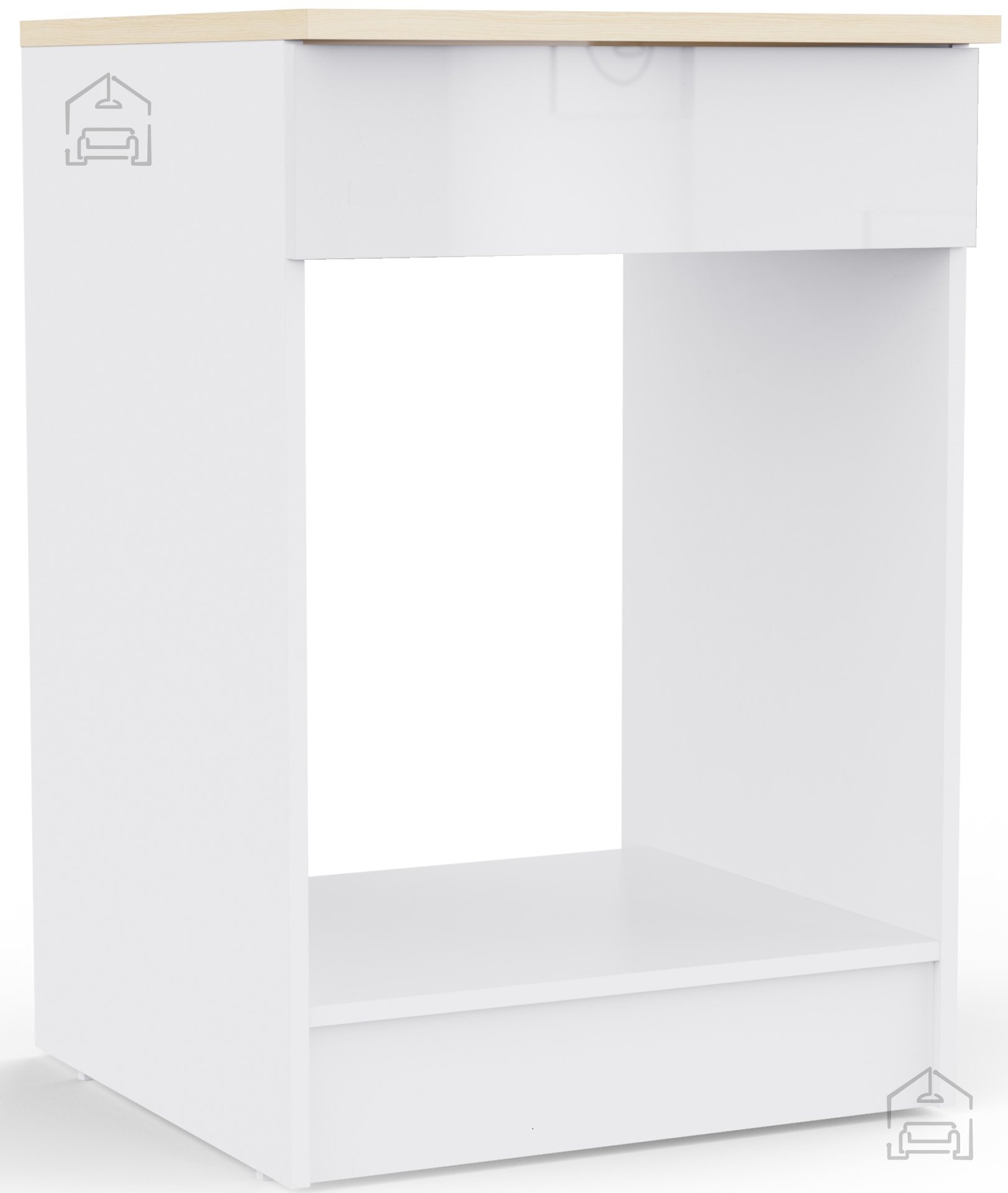 Okvir omarice je iz 16 mm debelega iverala, ki ohranja konstrukcijsko trdnost in preprečuje deformacije skozi čas. Iveral je material, ki se dobro obnese v pogojih, kjer prihaja do temperaturnih sprememb in vlage, kar je v kuhinji neizogibno. Omarica ne vključuje raztegljive mize ali dodatnih gibljivih elementov, zato je konstrukcijsko preprosta in trdna. Na vrhu je delovna plošča iz melamina v imitaciji hrasta, debeline 22 mm, ki dopolnjuje belo ohišje z naravnim toplim tonom in omogoča dodatno odlagalno površino.