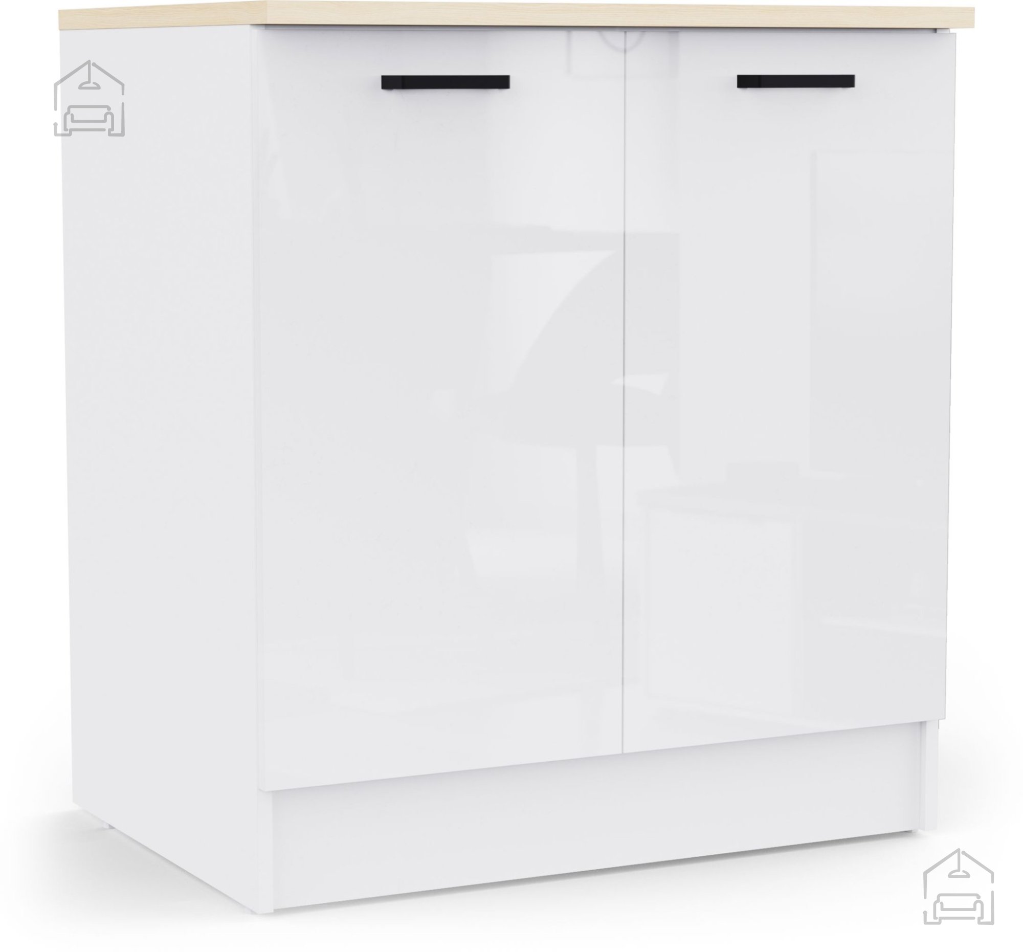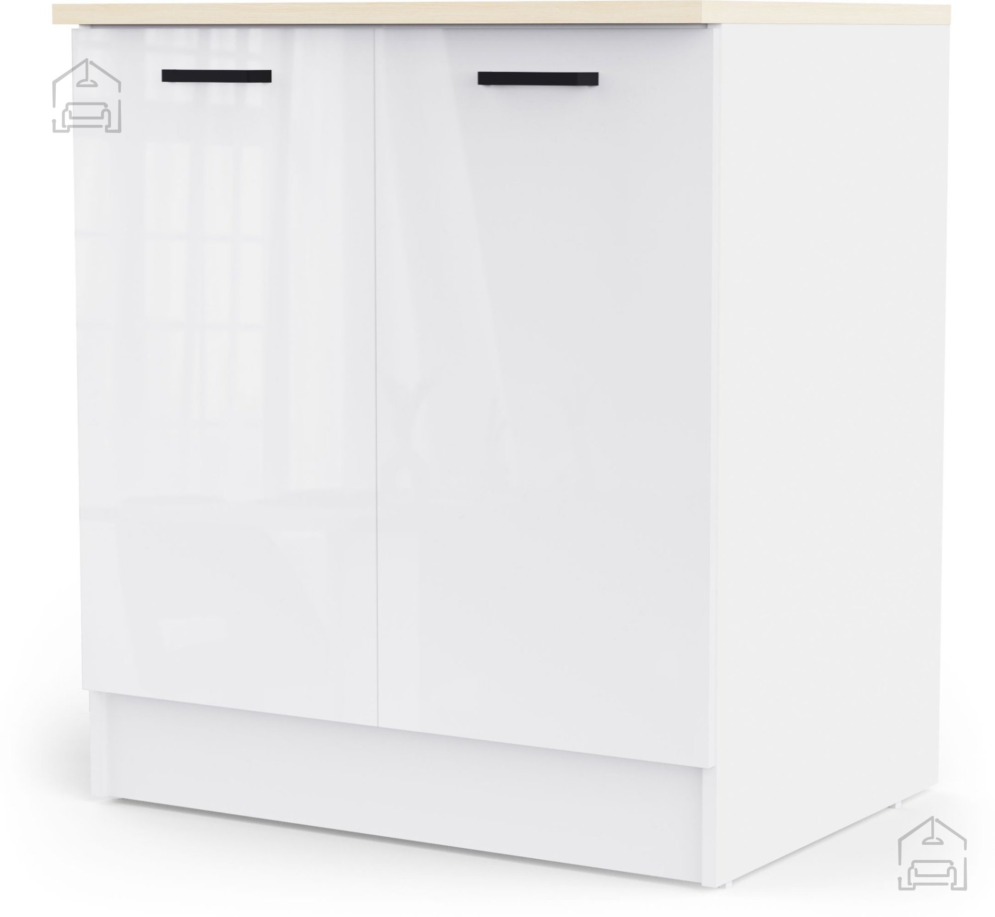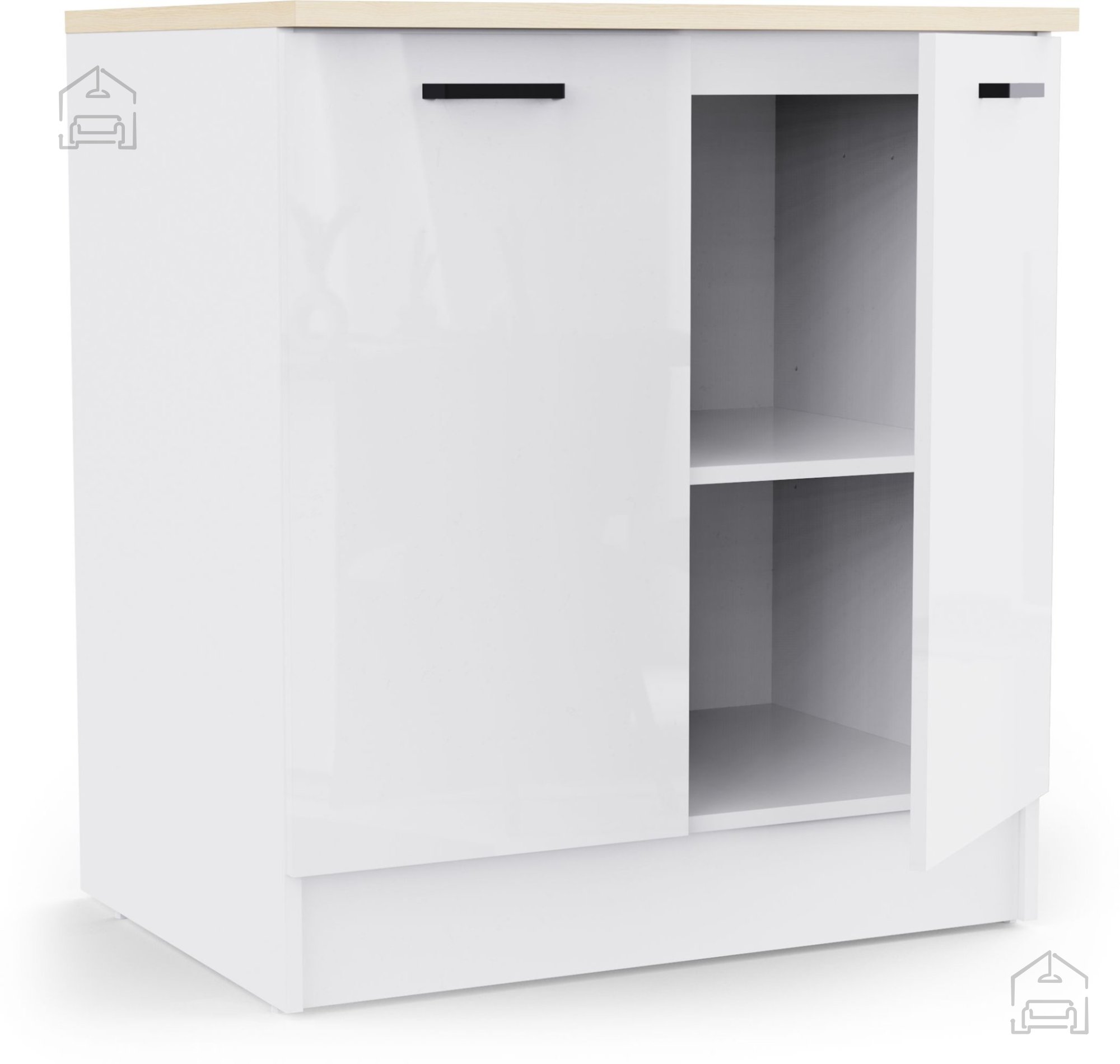 Okvir omare je izdelan iz 16 mm debelega iverala, ki zagotavlja stabilnost in dolgo življenjsko dobo. Na vrhu je nameščena delovna plošča iz 22 mm debele melaminske plošče v imitaciji hrasta, ki s toplim lesnim tonom dopolnjuje sijajne bele fronte. Površina je dovolj trdna za vsakodnevno uporabo – od priprave hrane do postavitve manjših gospodinjskih aparatov. Omara deluje samostojno ali pa kot del večje kuhinjske kompozicije.