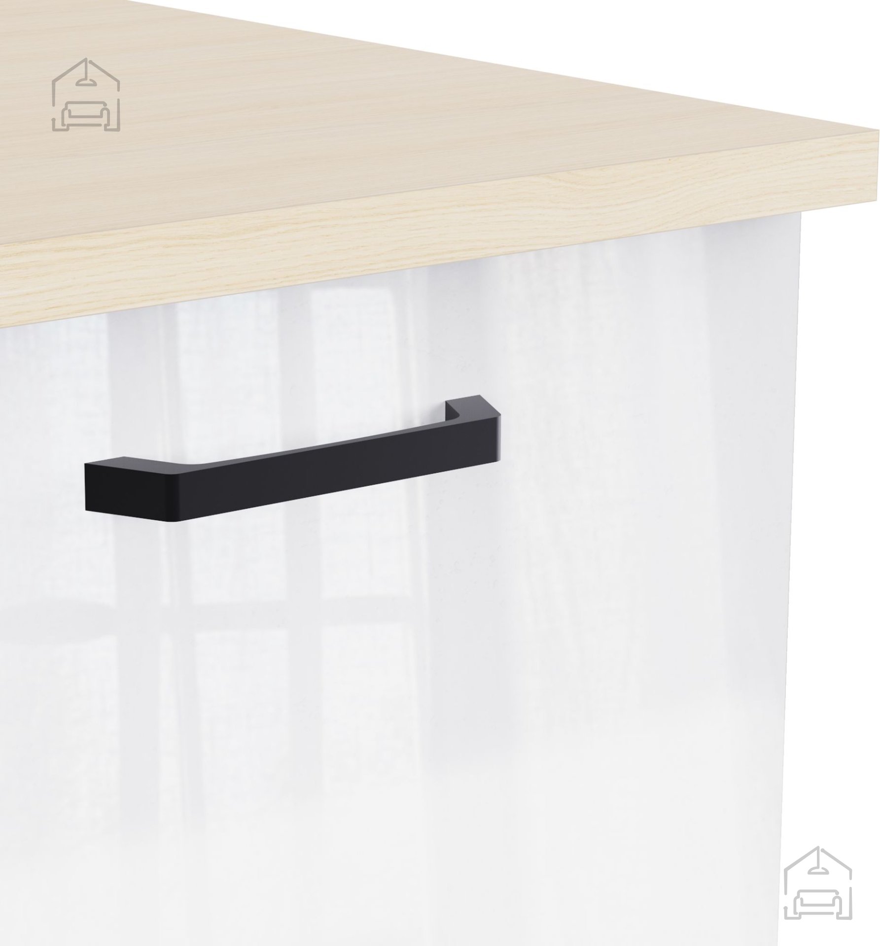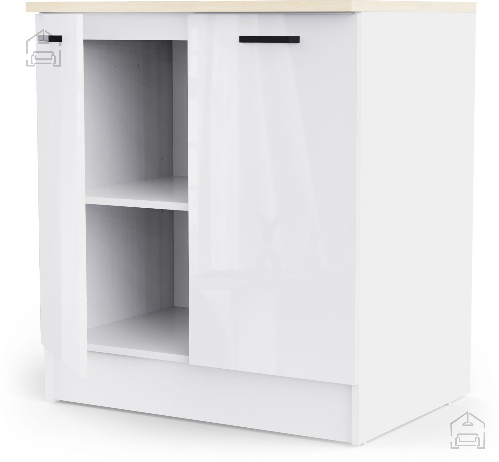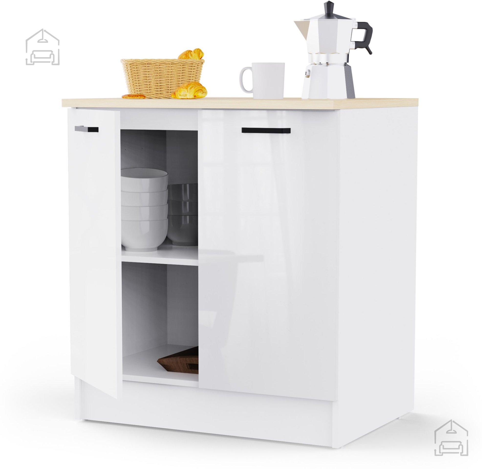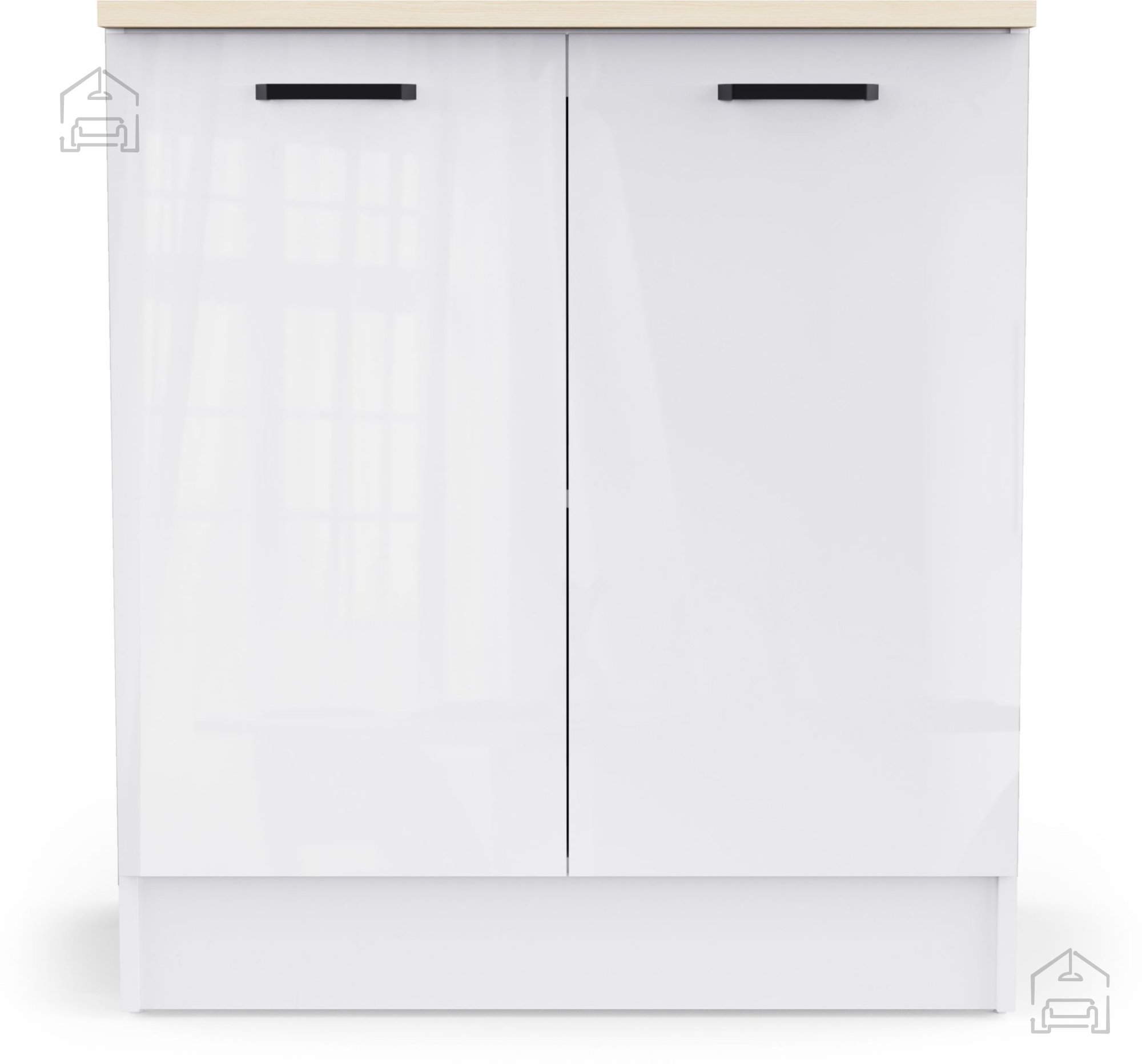 Okvir omare je izdelan iz 16 mm debelega iverala, ki zagotavlja stabilnost in dolgo življenjsko dobo. Na vrhu je nameščena delovna plošča iz 22 mm debele melaminske plošče v imitaciji hrasta, ki s toplim lesnim tonom dopolnjuje sijajne bele fronte. Površina je dovolj trdna za vsakodnevno uporabo – od priprave hrane do postavitve manjših gospodinjskih aparatov. Omara deluje samostojno ali pa kot del večje kuhinjske kompozicije.