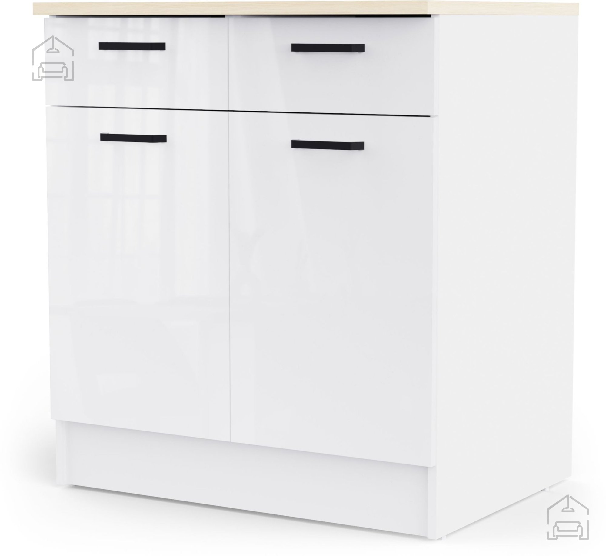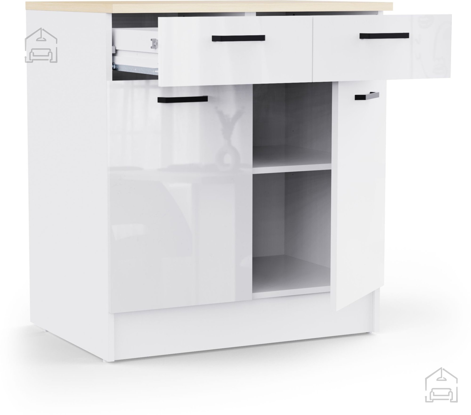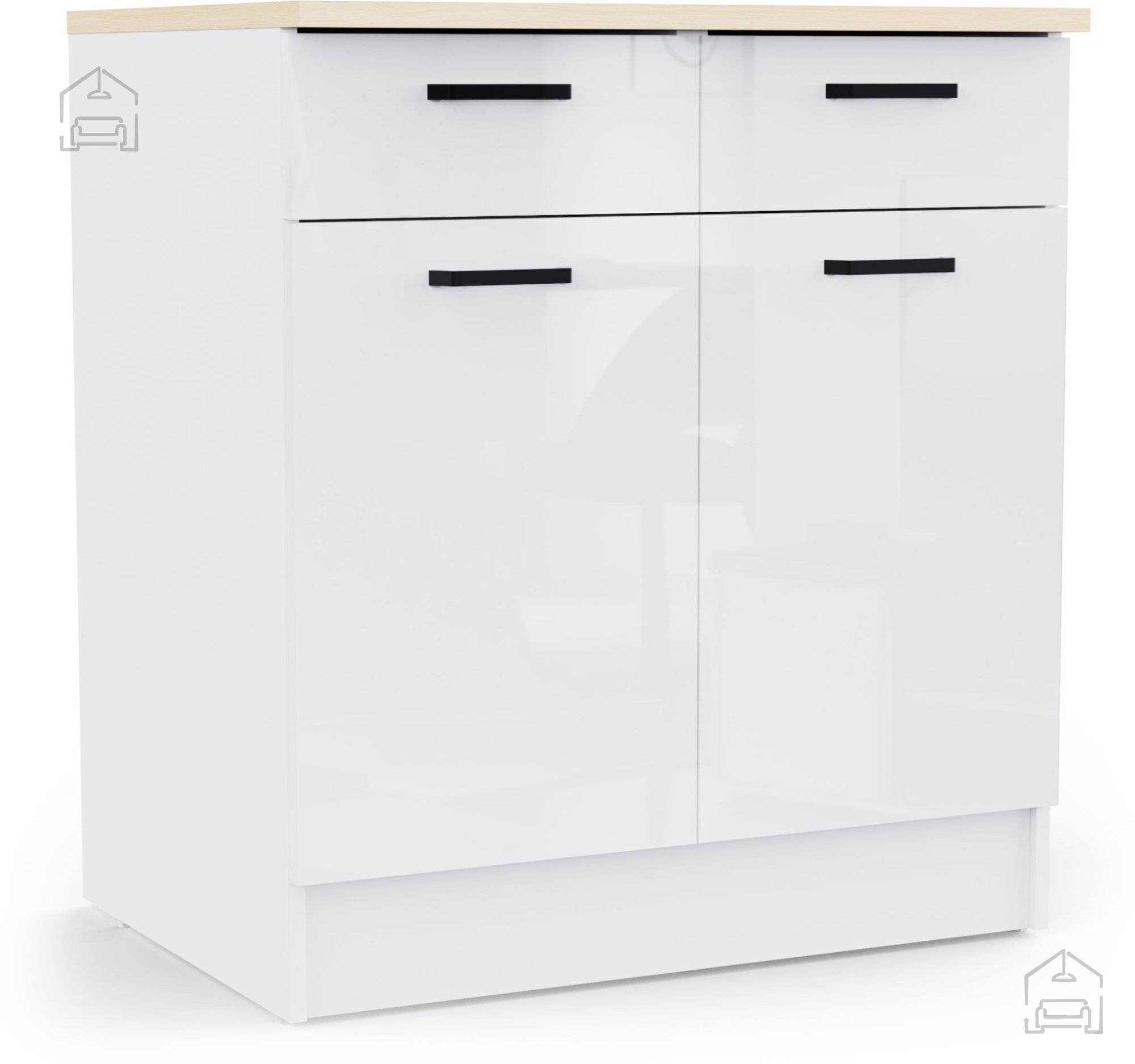 Omarica je izdelana iz 16 mm debele iverne plošče, prevlečene z melaminskim premazom, ki učinkovito ščiti površino pred praskami, vlago in toploto. Stranice so mat bele barve, medtem ko so fronte obdelane z visokosijajnim lakom, ki odbija svetlobo in ustvarja prijeten občutek prostornosti. Na vrhu je nameščena delovna plošča iz 22 mm debele melaminske plošče z videzom hrasta – ta kombinacija prinaša lep kontrast med toplino naravnega lesa in čistino bele barve.