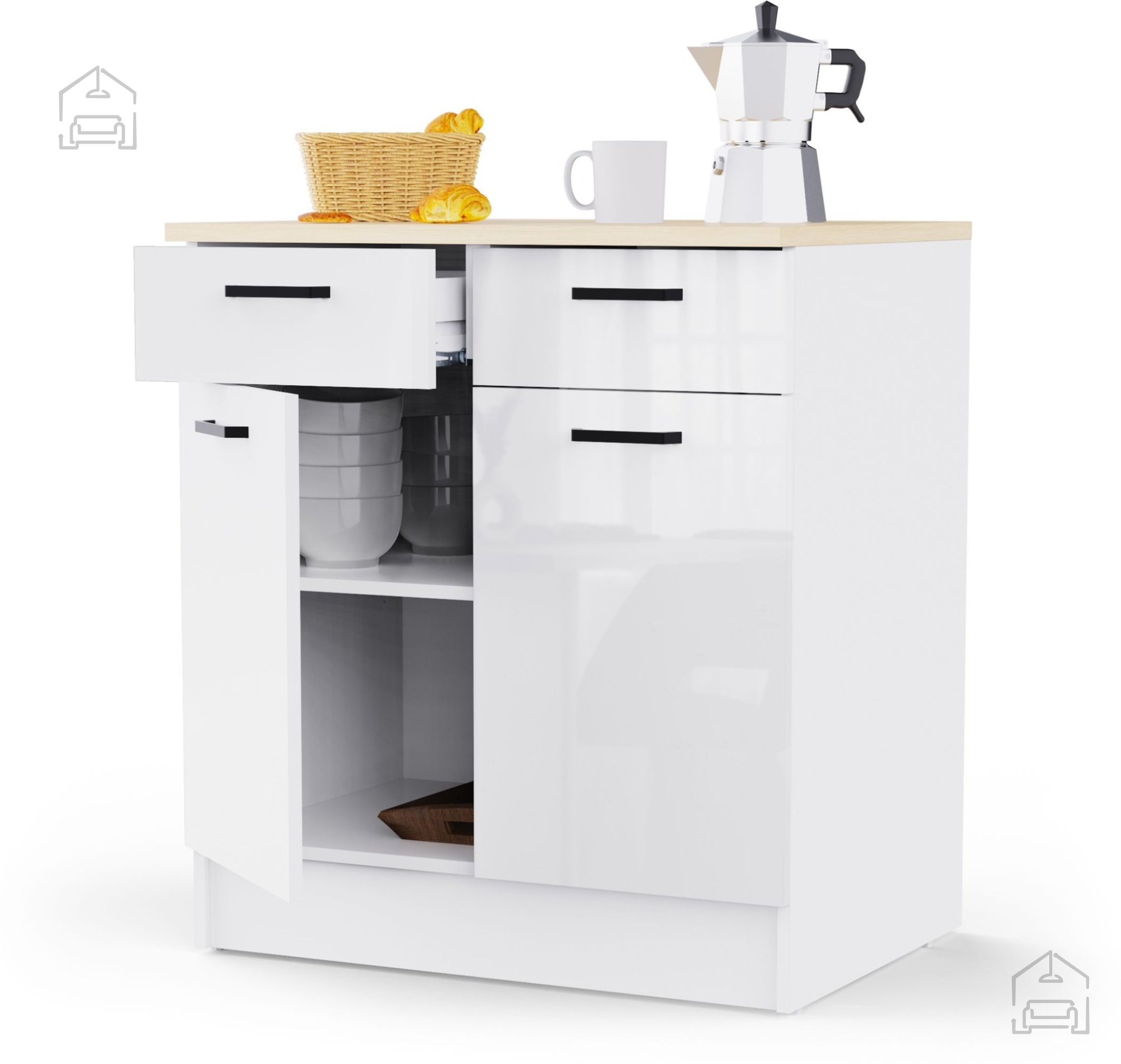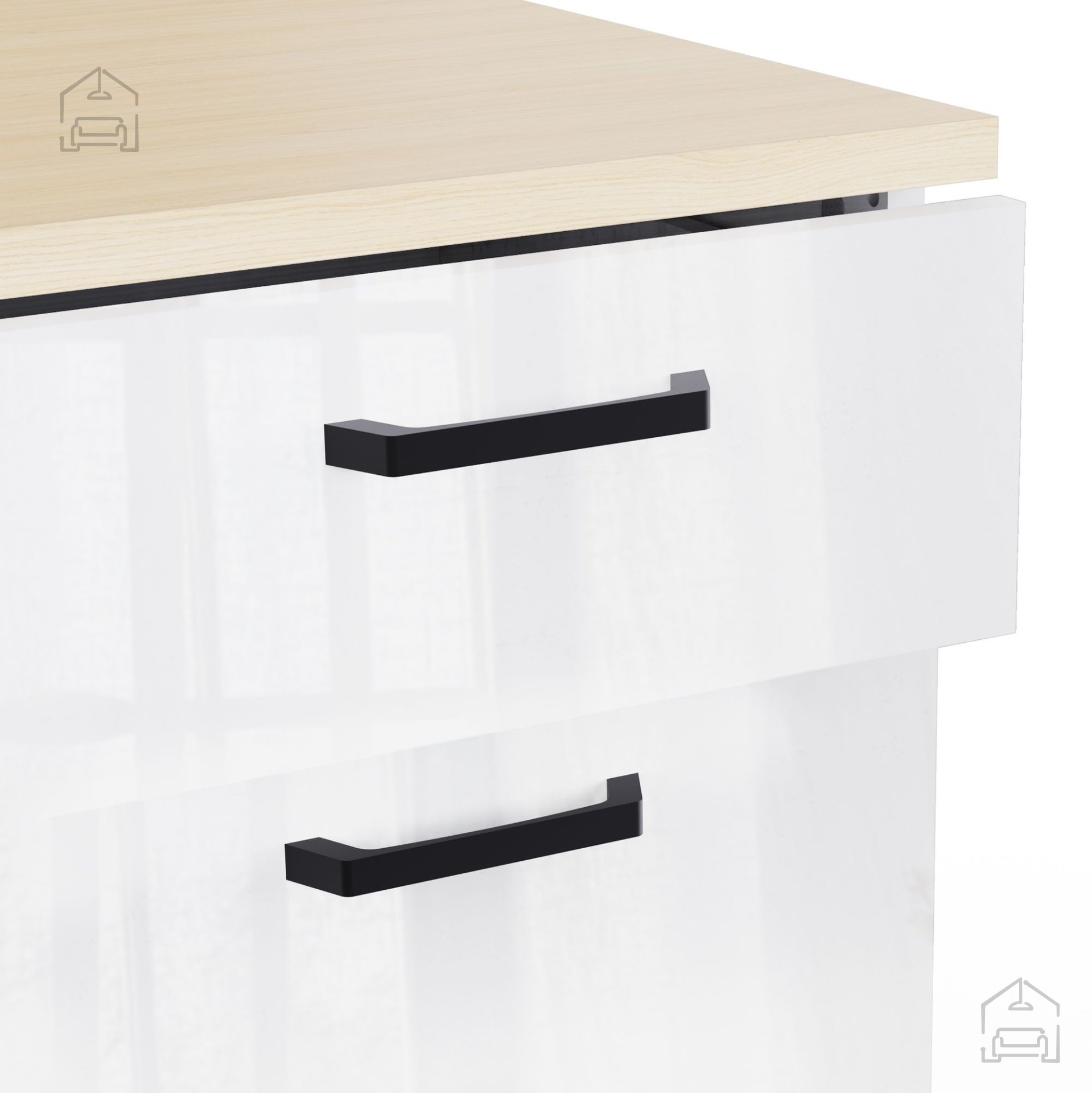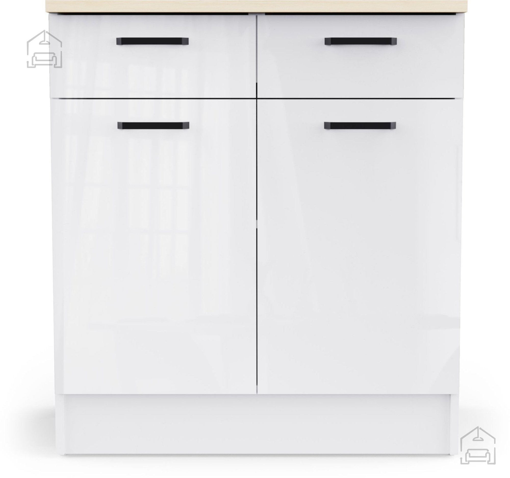 Omarica je izdelana iz 16 mm debele iverne plošče, prevlečene z melaminskim premazom, ki učinkovito ščiti površino pred praskami, vlago in toploto. Stranice so mat bele barve, medtem ko so fronte obdelane z visokosijajnim lakom, ki odbija svetlobo in ustvarja prijeten občutek prostornosti. Na vrhu je nameščena delovna plošča iz 22 mm debele melaminske plošče z videzom hrasta – ta kombinacija prinaša lep kontrast med toplino naravnega lesa in čistino bele barve.