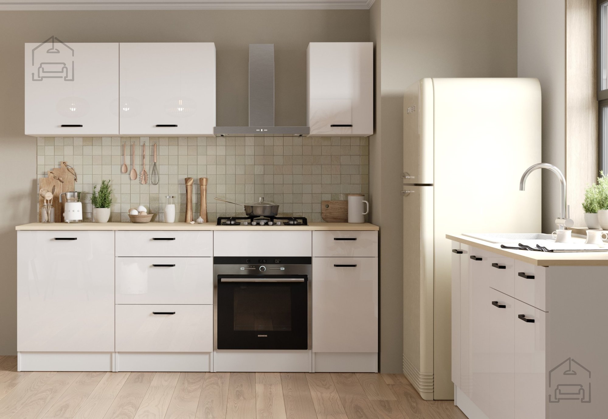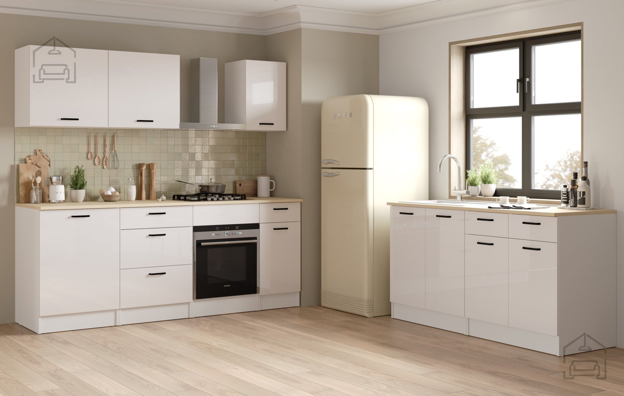 Kombinacija bele mat barve na stranicah in visokega sijaja na frontah ustvarja igro svetlobe, ki prostoru doda globino in svežino. Zaradi sijajne površine se svetloba bolje odbija, kar je še posebej uporabno v manjših kuhinjah z omejeno naravno osvetlitvijo. Površino je preprosto čistiti – z mehko vlažno krpo in blagim čistilom ohranja svoj sijaj in brezhiben videz.