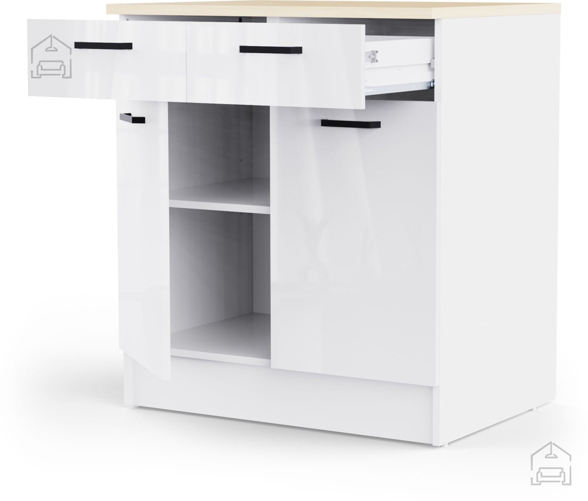 Pod predali se nahaja kabinet z dvojnimi vrati, ki se odpirata na klasičnih tečajih. V notranjosti je ena široka polica dimenzije približno 77x50 cm. Polico je mogoče nastaviti na tri različne višine, kar omogoča prilagoditev notranjega prostora glede na velikost shranjenih predmetov. Na ta način lahko enostavno uredite prostor za lonce, sklede, kuhinjske aparate ali posodo za serviranje.