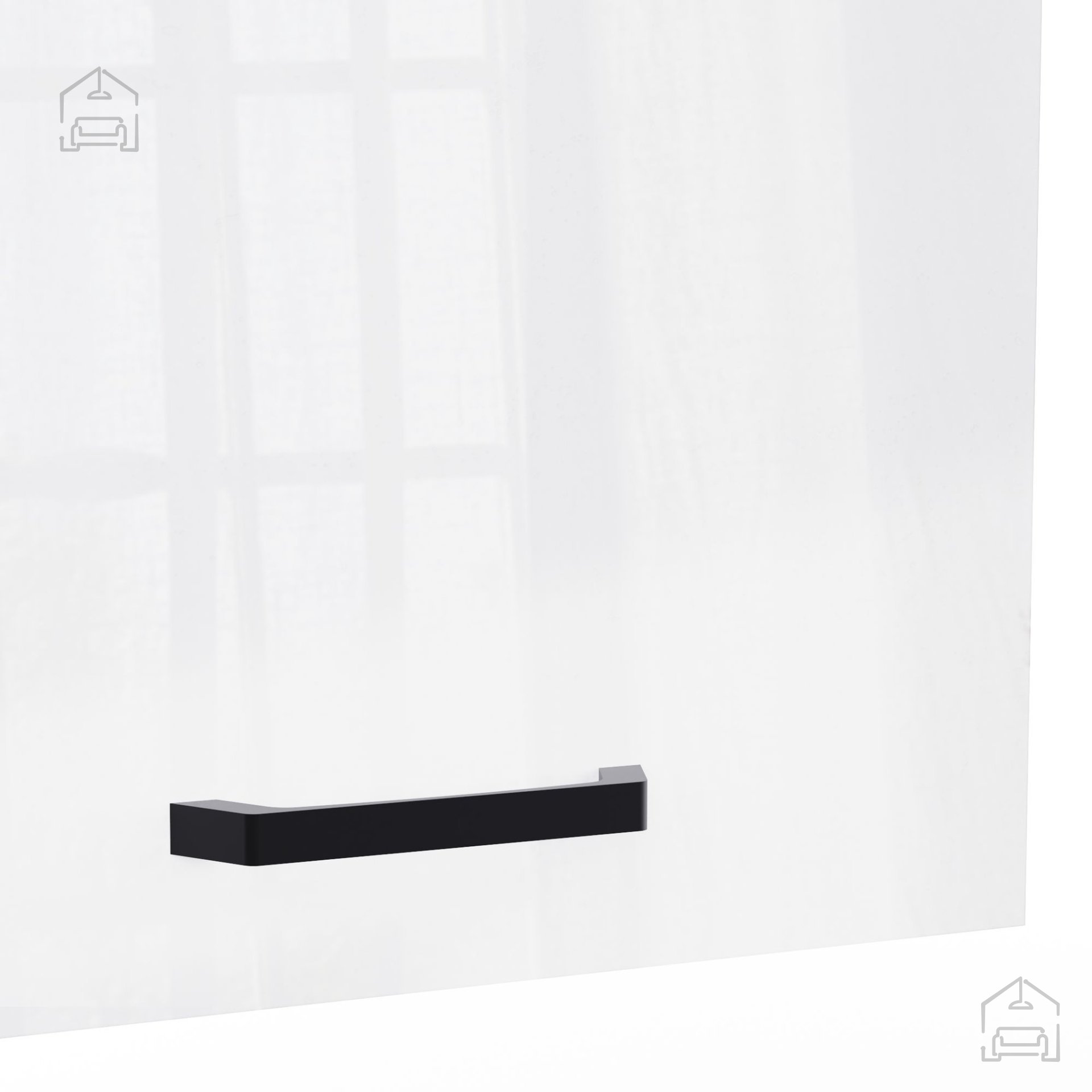 Vrata omarice so nameščena na kakovostnih tečajih in opremljena z mehkim zapiranjem, ki preprečuje loputanje in omogoča tiho delovanje. Ta sistem blaženja ne le izboljša uporabniško izkušnjo, ampak tudi ščiti konstrukcijo pred poškodbami, do katerih lahko pride pri pogostem odpiranju in zapiranju. Črni aluminijasti ročaji ustvarjajo eleganten kontrast sijoči beli površini in omogočajo udoben oprijem.