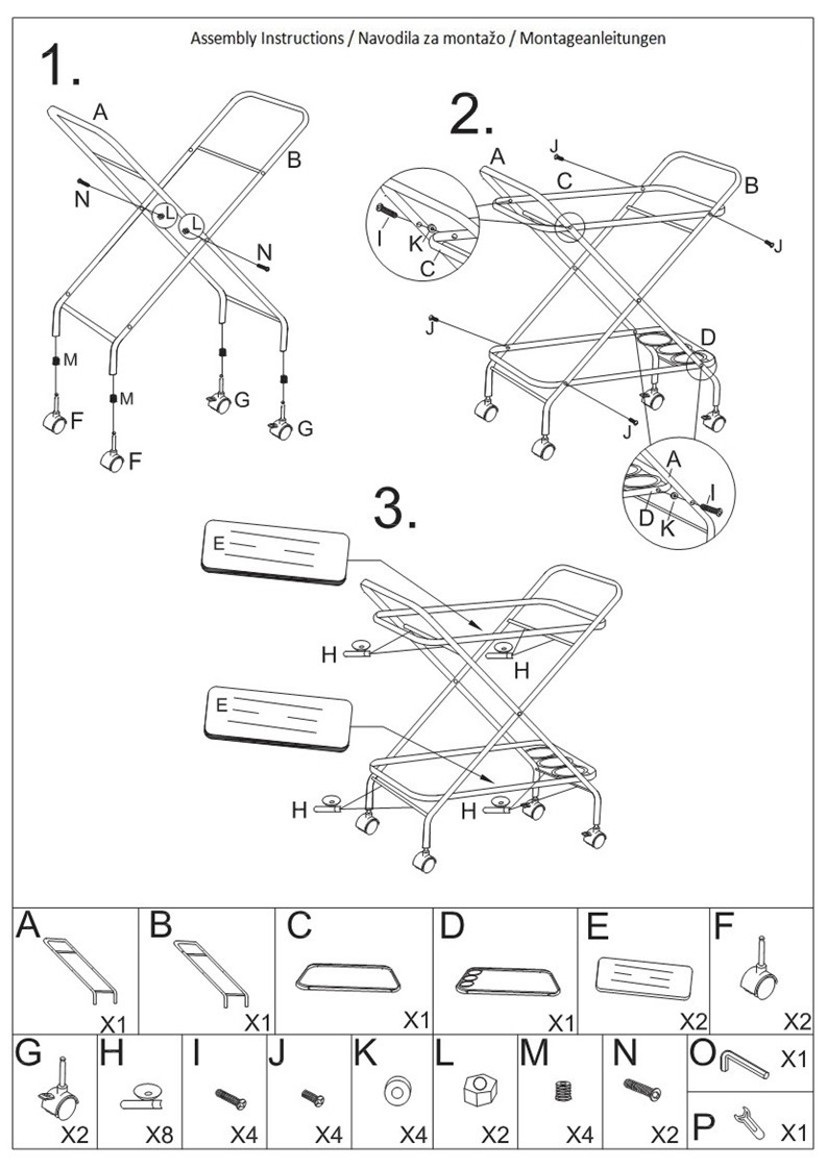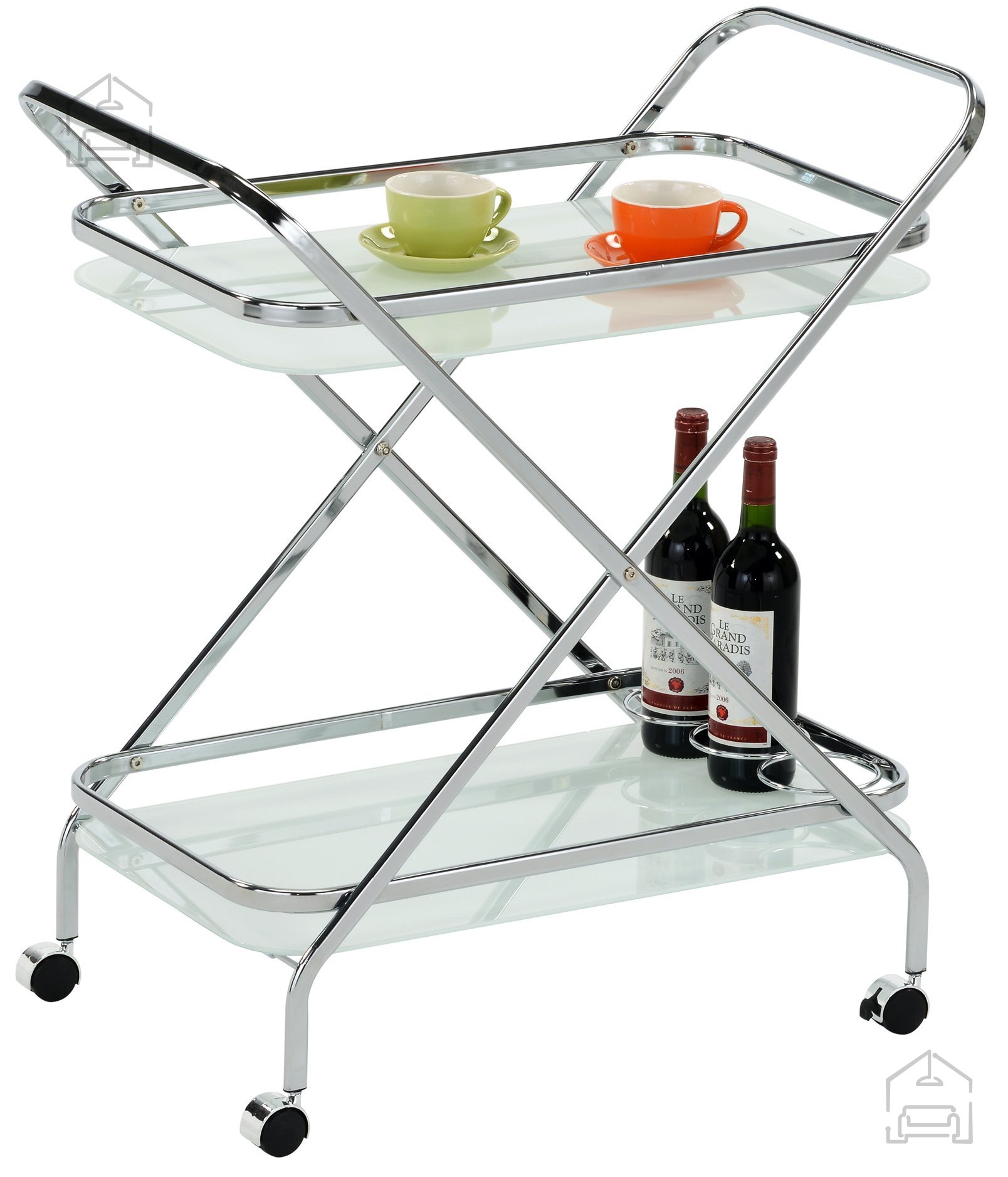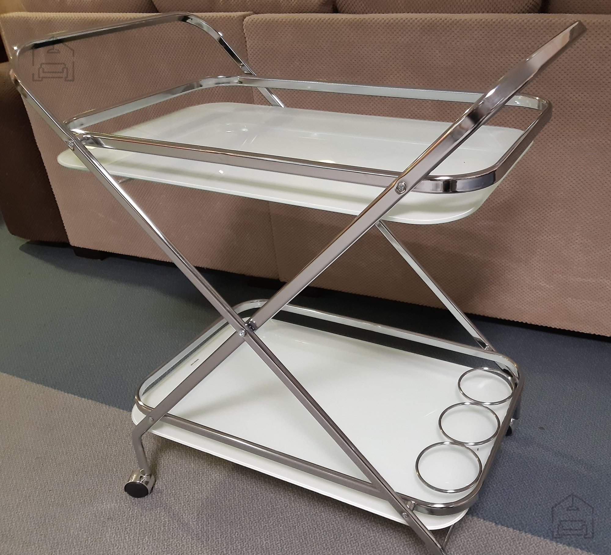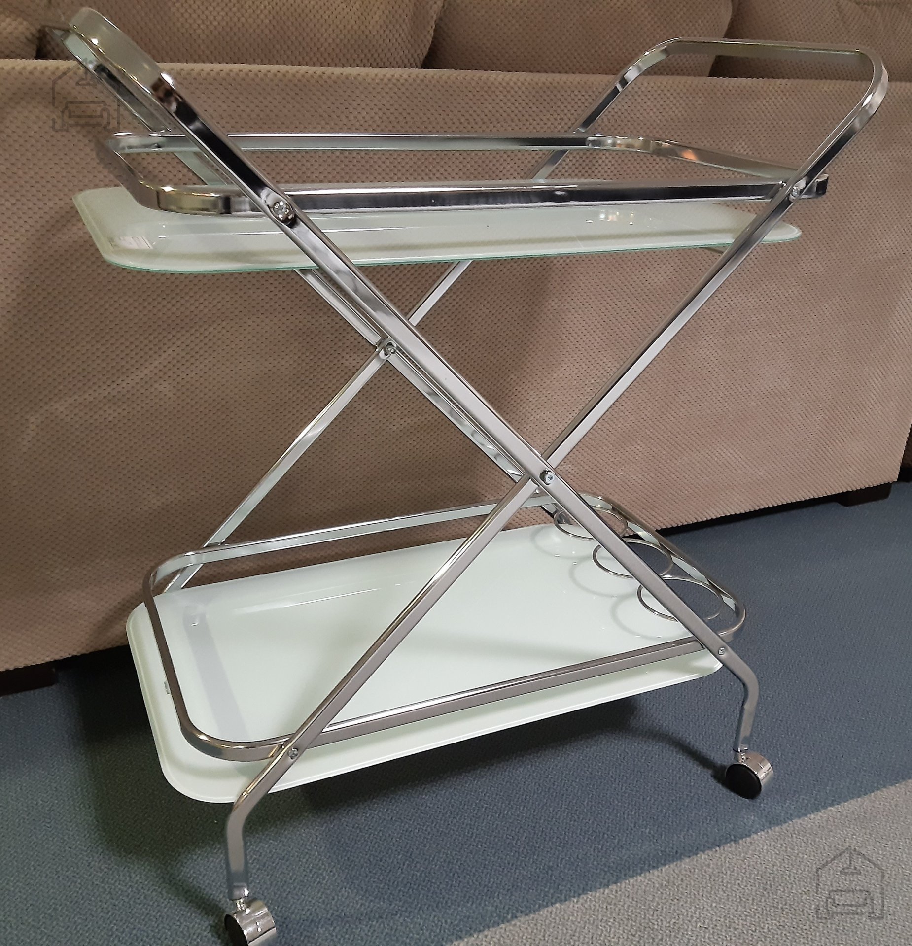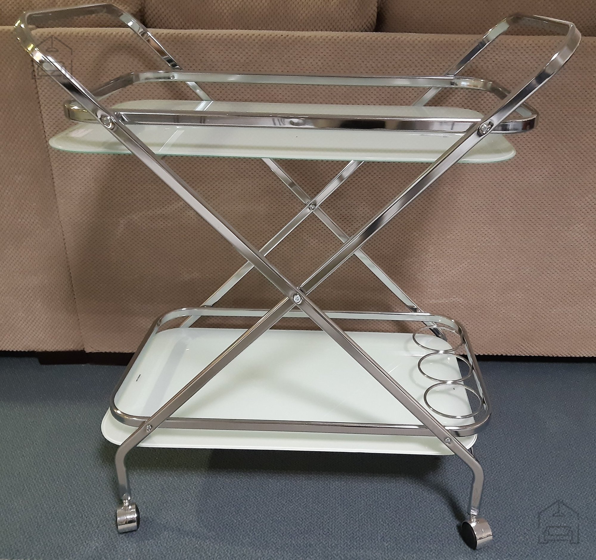 Voziček je izdelan iz kakovostnih materialov, ki zagotavljajo dolgo življenjsko dobo in enostavno vzdrževanje. Okvir je iz kovine, natančneje iz kromiranih jeklenih cevi, ki dajejo stabilnost in trdnost. Površini sta iz 0,5 cm debelega kaljenega stekla, barvanega v belo barvo. Kaljeno steklo je znano po svoji odpornosti na udarce in toplotne spremembe, zato je primerno za vsakodnevno uporabo. Kombinacija kovinskega ogrodja in steklenih polic ustvarja lahkoten, a hkrati zelo trden kos pohištva, ki se lepo ujema z različnimi stili notranje opreme – od minimalističnega do klasično elegantnega.