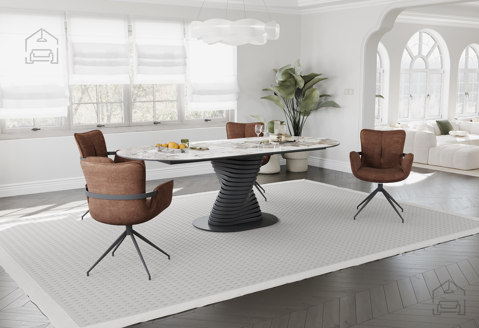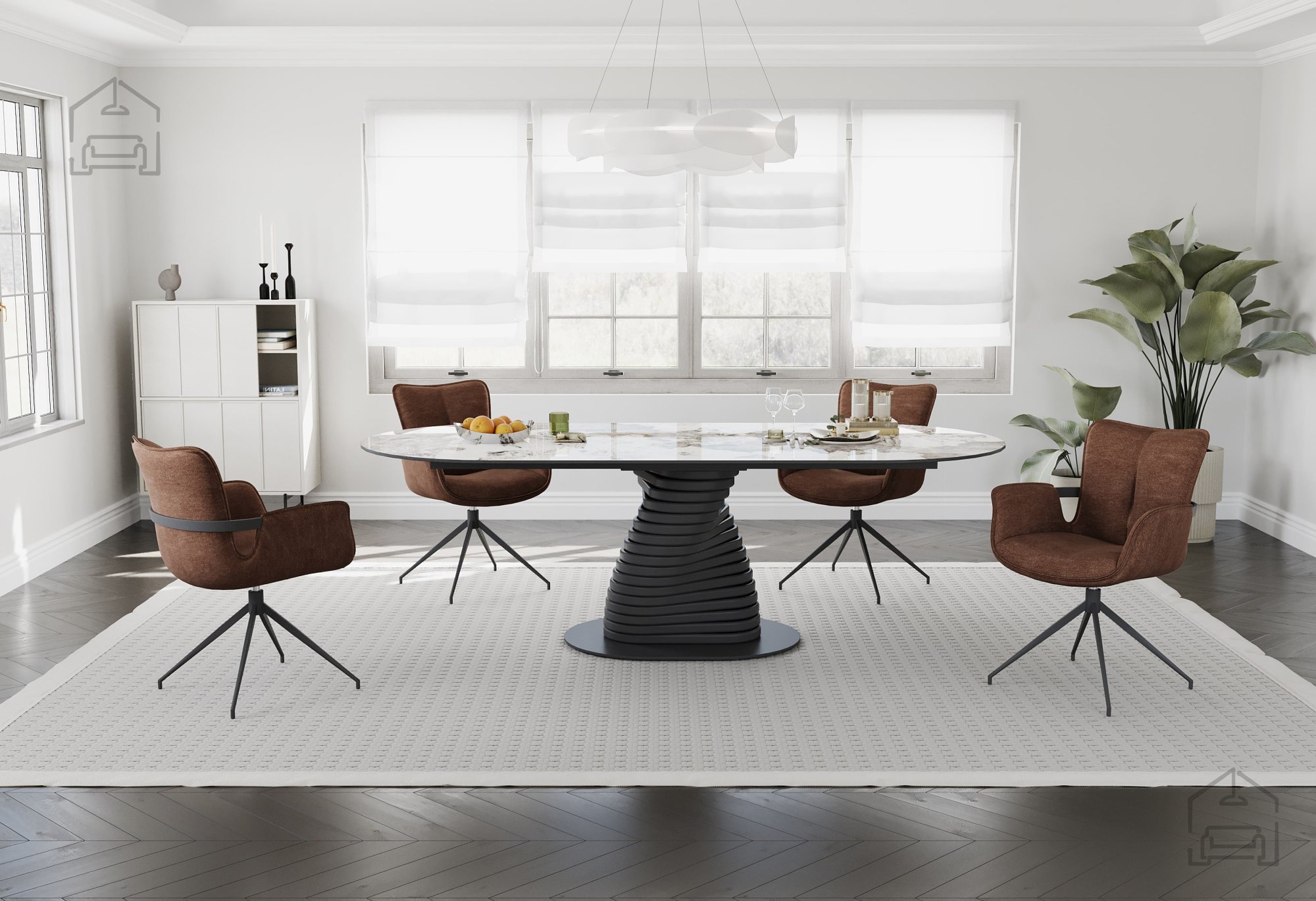 Ta sodoben jedilniški stol združuje elegantno obliko, funkcionalnost in udobje v enem kosu pohištva. Z moderno silhueto, mehkim oblazinjenjem in kovinskim podnožjem v črnem prašno lakiranem finišu predstavlja popolno izbiro za različne notranje prostore – od jedilnic, kuhinjskih kotičkov do sodobnih pisarn ali sejnih sob. Posebna vrtilna funkcija z avtomatskim vračanjem poenostavi uporabo in pomaga ohranjati urejen videz prostora, saj se stol po vsakem premiku sam vrne v prvotni položaj.