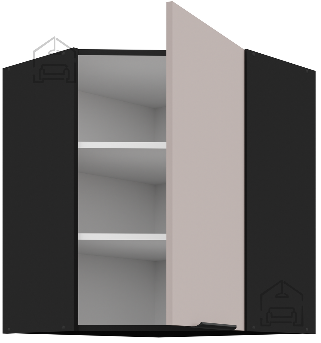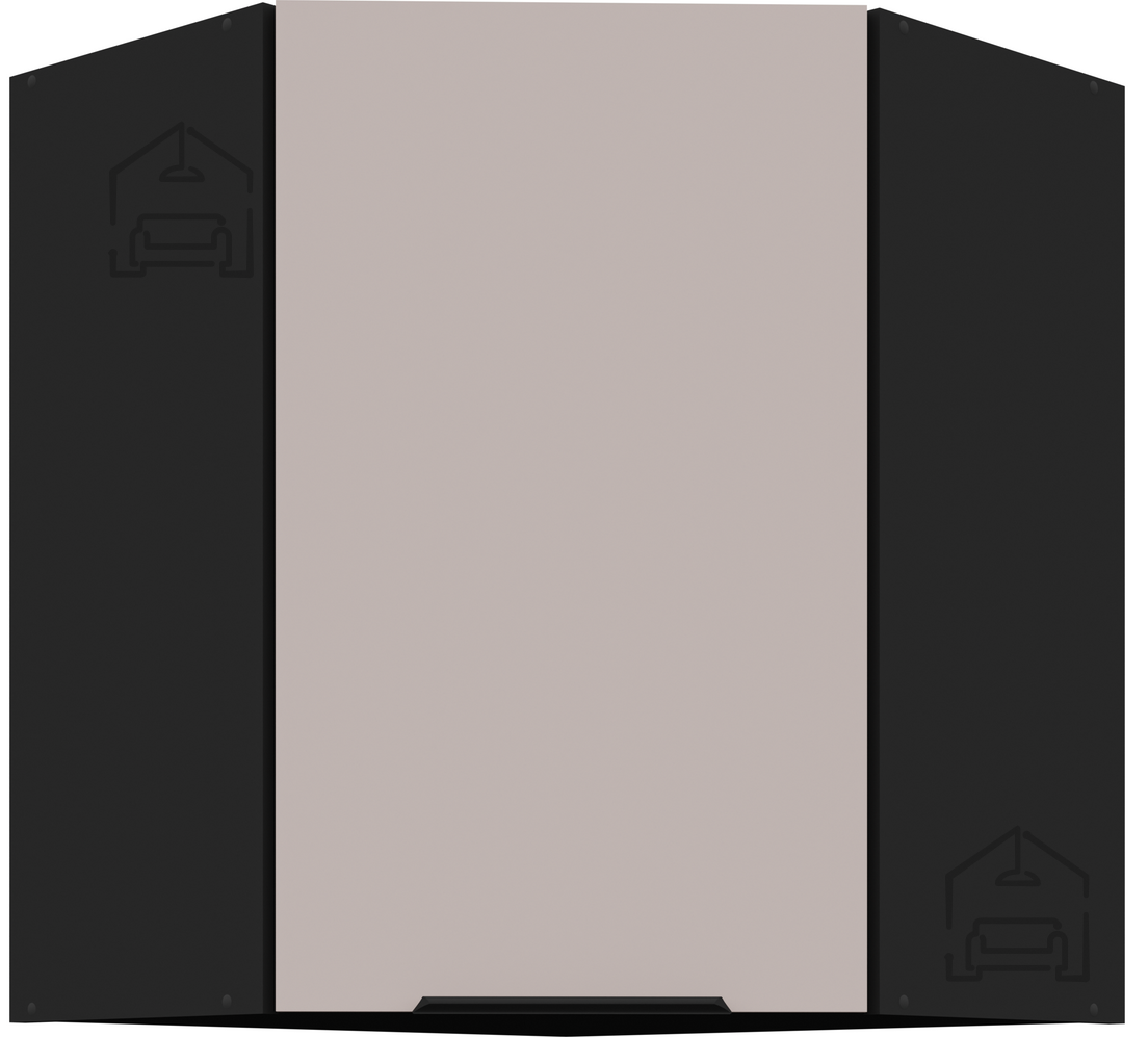 Zgornja kotna omara Arona je premišljeno zasnovan element kuhinjskega pohištva, ki združuje funkcionalnost, kakovostno izdelavo in sodoben videz. Izdelana je iz laminirane plošče debeline 16 mm, kar zagotavlja trdnost in odpornost na vsakodnevno uporabo v kuhinji. Njena kašmir barva v kombinaciji s črnimi poudarki ustvarja eleganten kontrast, ki se lepo ujema z različnimi kuhinjskimi slogi – od minimalističnega do industrijskega. Posebnost omare je njen kotni dizajn z 45° kotom, ki omogoča optimalen izkoristek prostora v kuhinjskem vogalu.