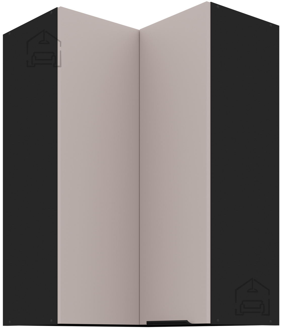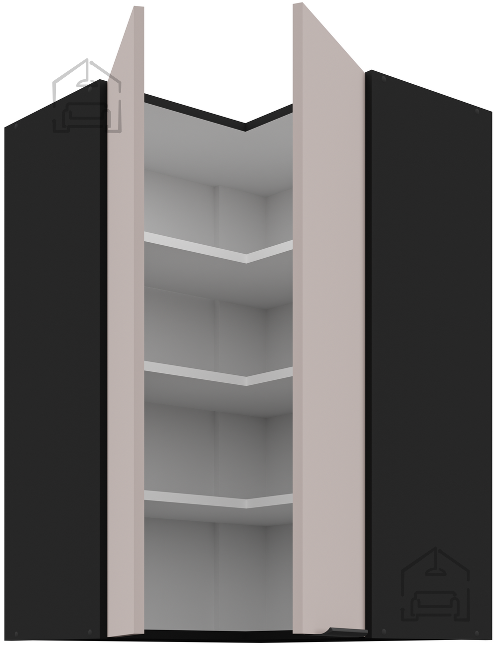 Zgornja kotna omara Arona je del sodobne kolekcije kuhinjskega pohištva proizvajalca Stolarz-Lempert iz Poljske. Zasnovana je za optimalno izkoriščanje prostora v kotnih delih kuhinje in se ponaša z brezčasno kombinacijo barv kašmir/črna, ki prostoru dodata pridih prefinjenosti. Omara je izdelana iz kakovostne laminirane plošče debeline 16 mm, ki zagotavlja trdnost, dolgo življenjsko dobo ter enostavno vzdrževanje. Zahvaljujoč sistemu tihega zapiranja se vrata zapirajo mehko in brez udarcev, kar povečuje udobje pri vsakodnevni uporabi.