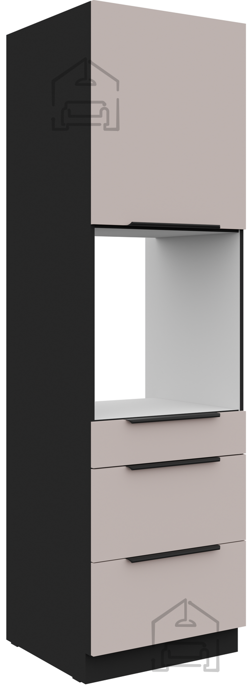 Visoka omara Arona proizvajalca Stolarz-Lempert združuje sodoben videz, funkcionalnost in kakovostno izdelavo, ki jo pričakujemo od poljskega proizvajalca pohištva s tradicijo. Z višino 210 cm in širino 60 cm ponuja veliko prostora za shranjevanje, kar jo naredi idealno izbiro za različne kuhinjske sestave. Omara je izdelana iz laminirane plošče debeline 16 mm, kar zagotavlja stabilnost, odpornost na obrabo in enostavno vzdrževanje. Barvna kombinacija kašmir in črne barve ustvarja eleganten kontrast, ki se lepo poda tako k modernim kot klasičnim kuhinjam.