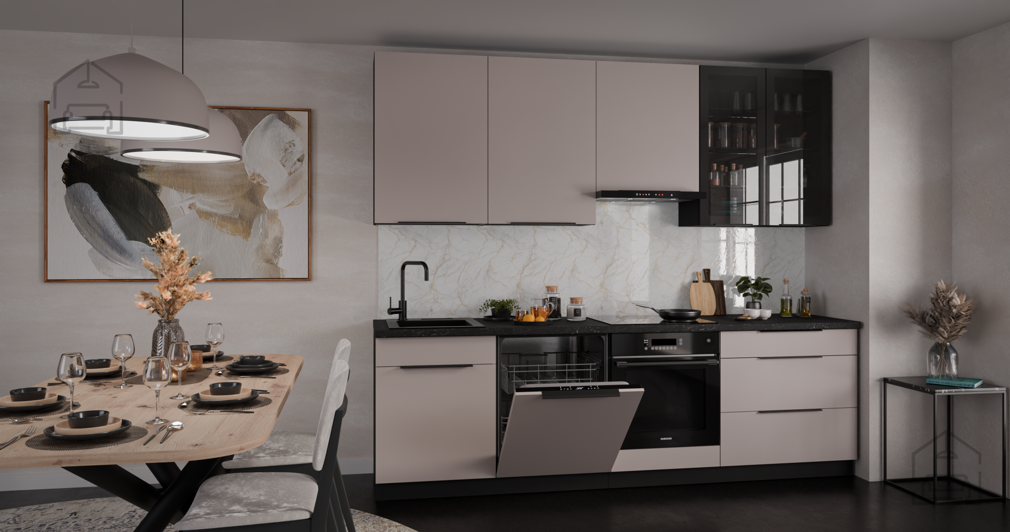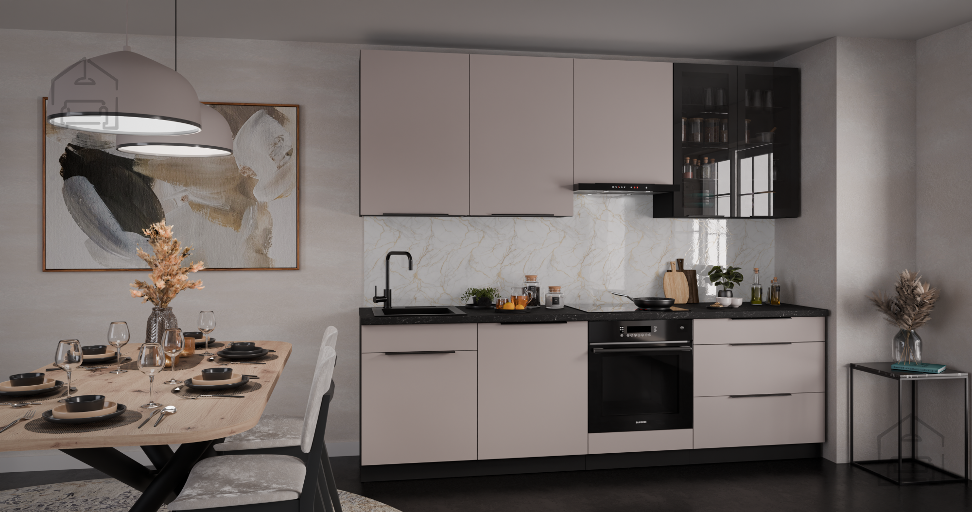 Ustvarite kuhinjo, ki združuje sodoben dizajn, funkcionalnost in kakovostno izdelavo. Ta kuhinjski sestav s širino 260 cm je odlična izbira za vse, ki želijo svoj prostor spremeniti v estetsko dovršeno in praktično okolje, kjer je kuhanje in druženje pravi užitek. Elegantna barvna kombinacija kašmirja in črne barve doda pridih prestiža, medtem ko detajli, kot so robni ročaji UA-HEXA v črno–aluminij izvedbi, poskrbijo za moderen videz.