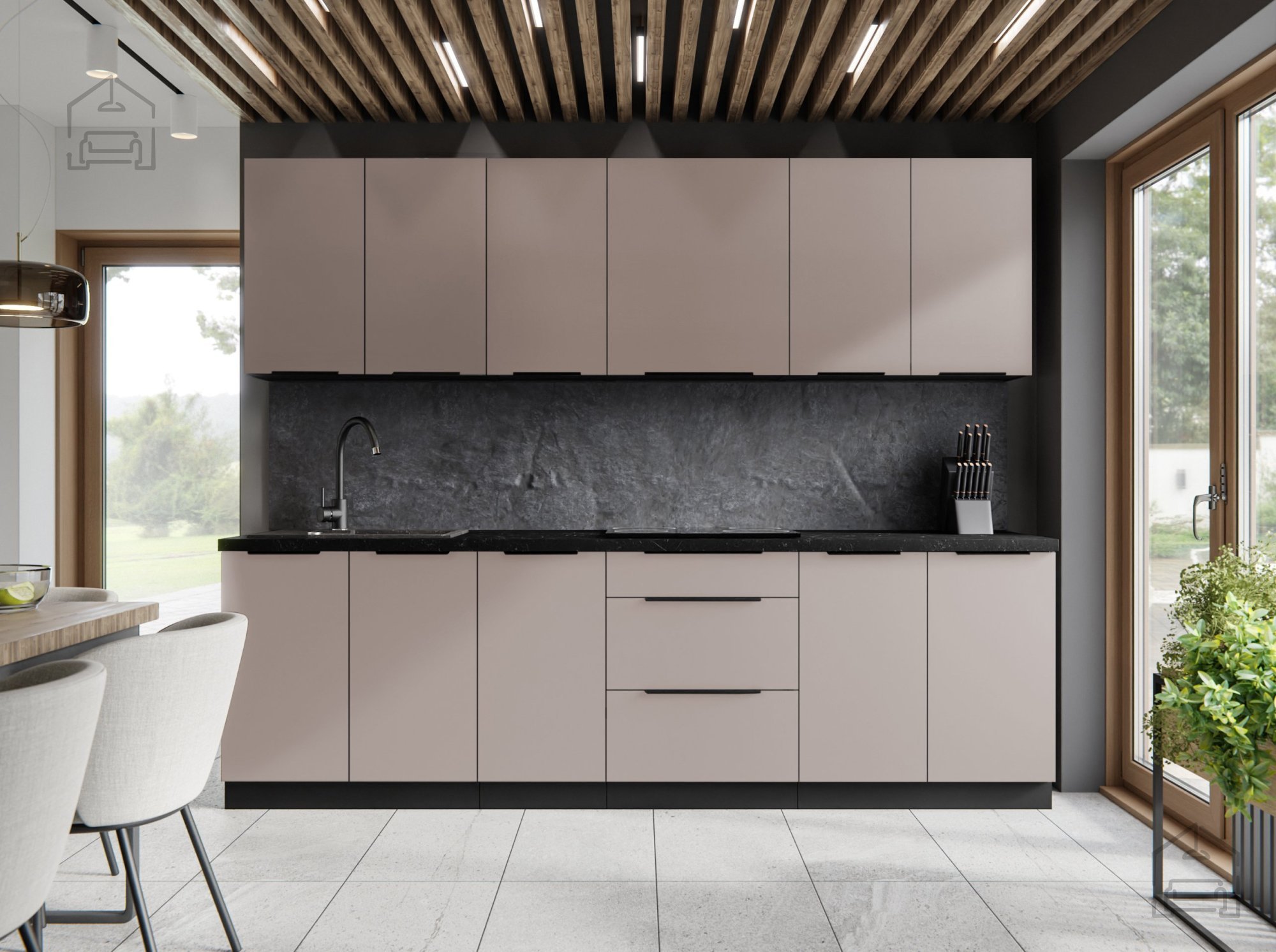 Ustvarite kuhinjo, ki združuje sodoben dizajn, funkcionalnost in kakovostno izdelavo. Ta kuhinjski sestav s širino 260 cm je odlična izbira za vse, ki želijo svoj prostor spremeniti v estetsko dovršeno in praktično okolje, kjer je kuhanje in druženje pravi užitek. Elegantna barvna kombinacija kašmirja in črne barve doda pridih prestiža, medtem ko detajli, kot so robni ročaji UA-HEXA v črno–aluminij izvedbi, poskrbijo za moderen videz.