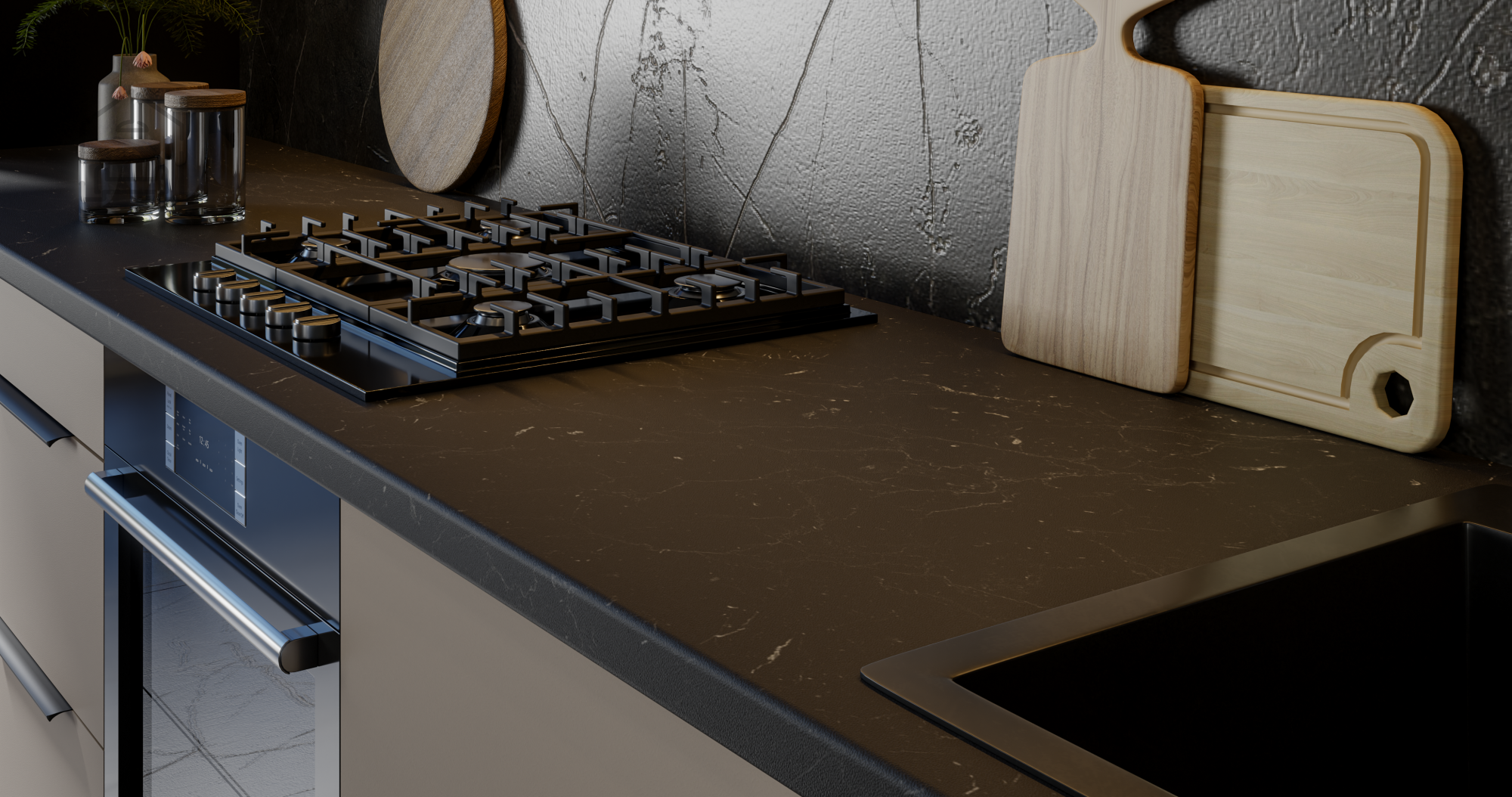 Vsak element kuhinjskega sestava je zasnovan tako, da uporabniku ponuja največ udobja. Okvir iz iverala zagotavlja stabilnost, medtem ko ABS obrobe na sprednjih straneh povečajo odpornost proti udarcem in obrabi. Kuhinja je opremljena tudi z elegantnimi steklenimi frontami iz kaljenega grafitnega stekla debeline 4 mm, ki prostoru dodajo prefinjen videz, hkrati pa omogočajo estetsko shranjevanje posode ali dekorativnih dodatkov.