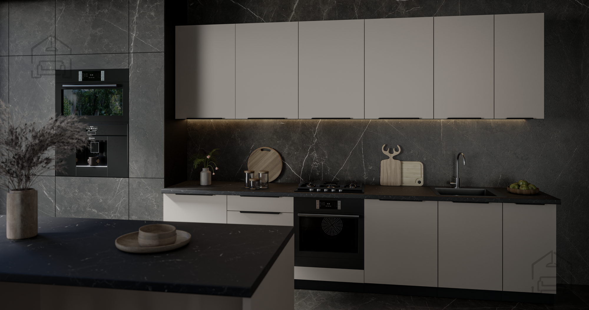 Ustvarite kuhinjo, ki združuje sodoben dizajn, funkcionalnost in kakovostno izdelavo. Ta kuhinjski sestav s širino 320 cm je odlična izbira za vse, ki želijo svoj prostor spremeniti v estetsko dovršeno in praktično okolje, kjer je kuhanje in druženje pravi užitek. Elegantna barvna kombinacija kašmirja in črne barve doda pridih prestiža, medtem ko detajli, kot so robni ročaji UA-HEXA v črno–aluminij izvedbi, poskrbijo za moderen videz.