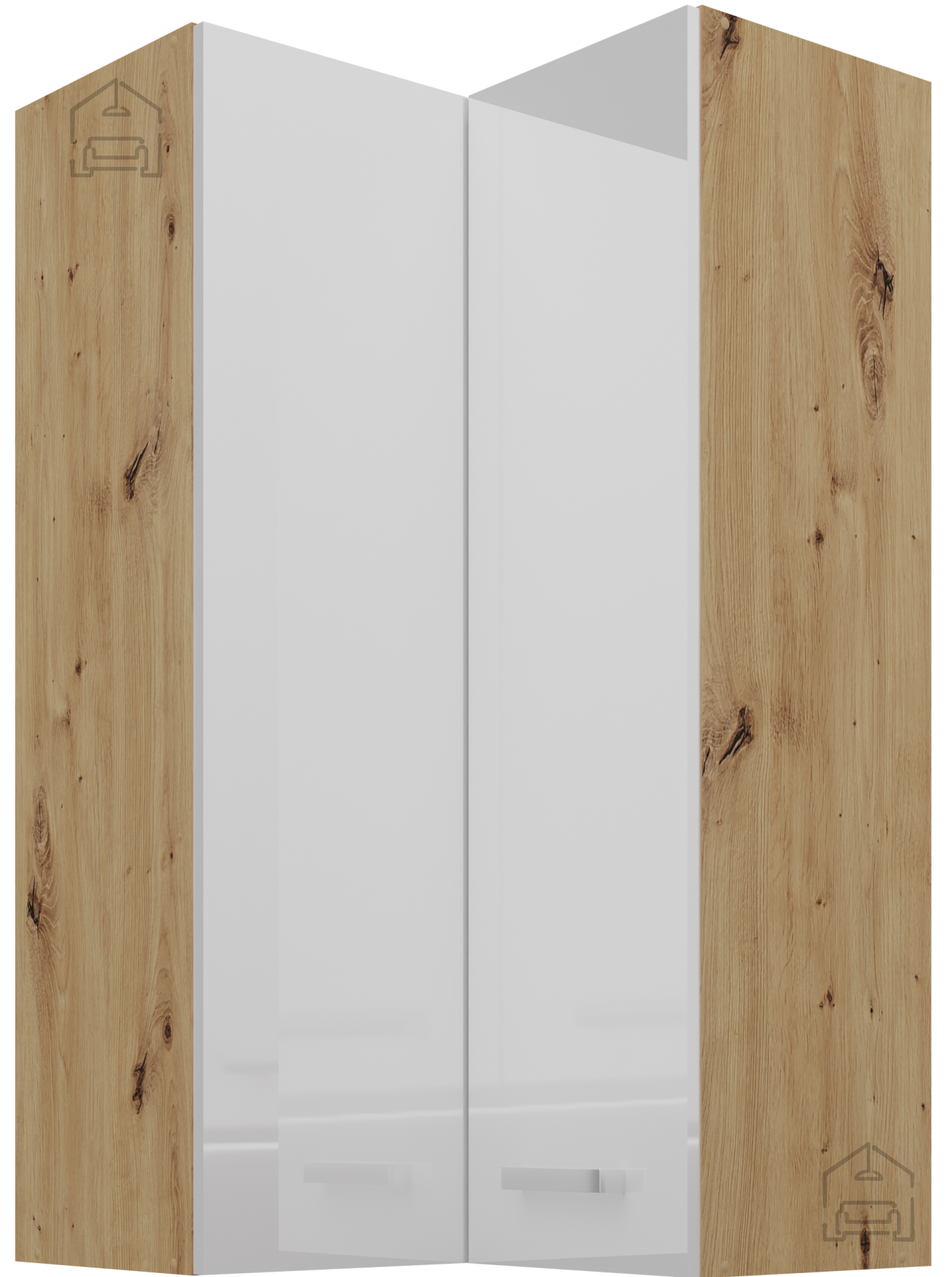 Ohišje omare je izdelano iz kakovostne 16 mm laminirane plošče, ki zagotavlja trpežnost in enostavno vzdrževanje. Sprednja stran v beli sijajni barvi se popolno ujema s toplim tonom hrasta artisan, kar ustvarja prijeten kontrast in sodoben videz. Ta kombinacija naravne topline in modernega sijaja poskrbi, da se omara lepo vključi tako v klasične kot v minimalistične kuhinjske ambiente.