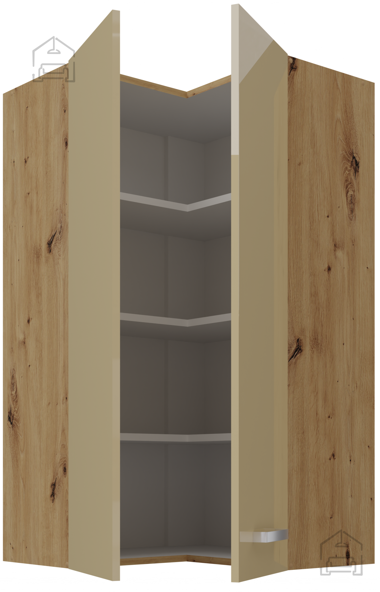 Če želite v svojo kuhinjo vnesti več topline, elegance in praktičnosti, je ta kotna omara odlična izbira. Združuje sodoben dizajn, kakovostne materiale in funkcionalnost, ki jo v vsakodnevni uporabi zagotovo potrebujete. S svojo premišljeno zasnovo se popolnoma prilega v kotni prostor, ki ga pogosto težko izkoristimo, hkrati pa doda pridih prestiža s kombinacijo barv hrasta artisan in sijajnega cappuccina.