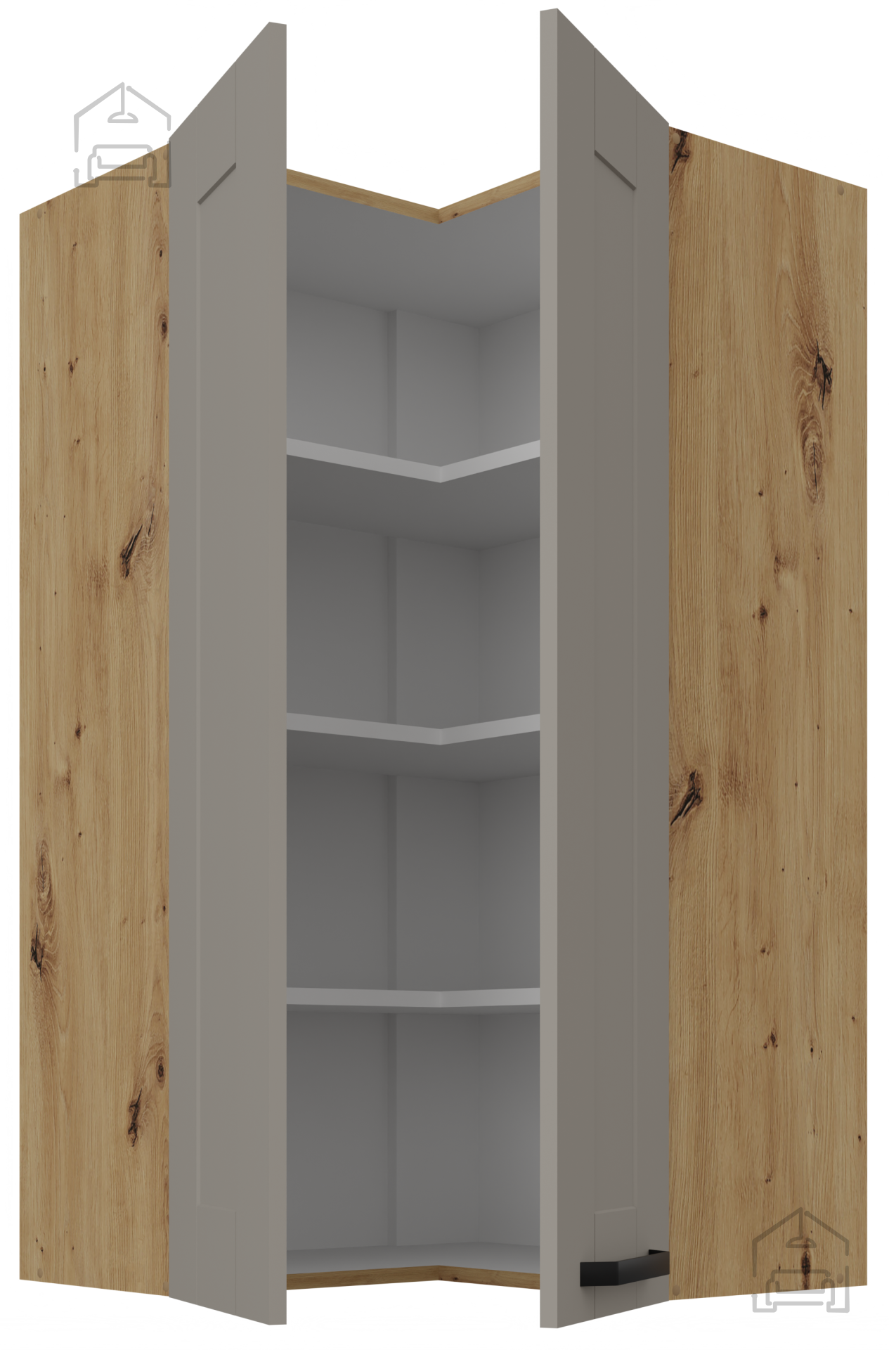 Elegantna in funkcionalna rešitev za vsak sodoben dom, ki združuje estetiko, kakovost in praktičnost. Zgornja kotna omara v barvni kombinaciji claygrey in hrast artisan je zasnovana tako, da izkoristi tudi najmanjši kotiček vaše kuhinje ter hkrati ustvari topel in prijeten ambient. Njen premišljen dizajn omogoča enostavno umeščanje v različne stile notranje opreme – od minimalističnih do bolj tradicionalnih.