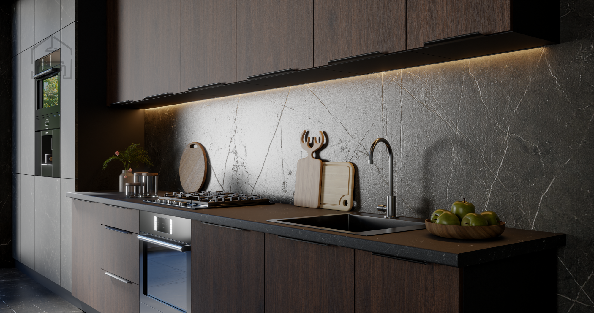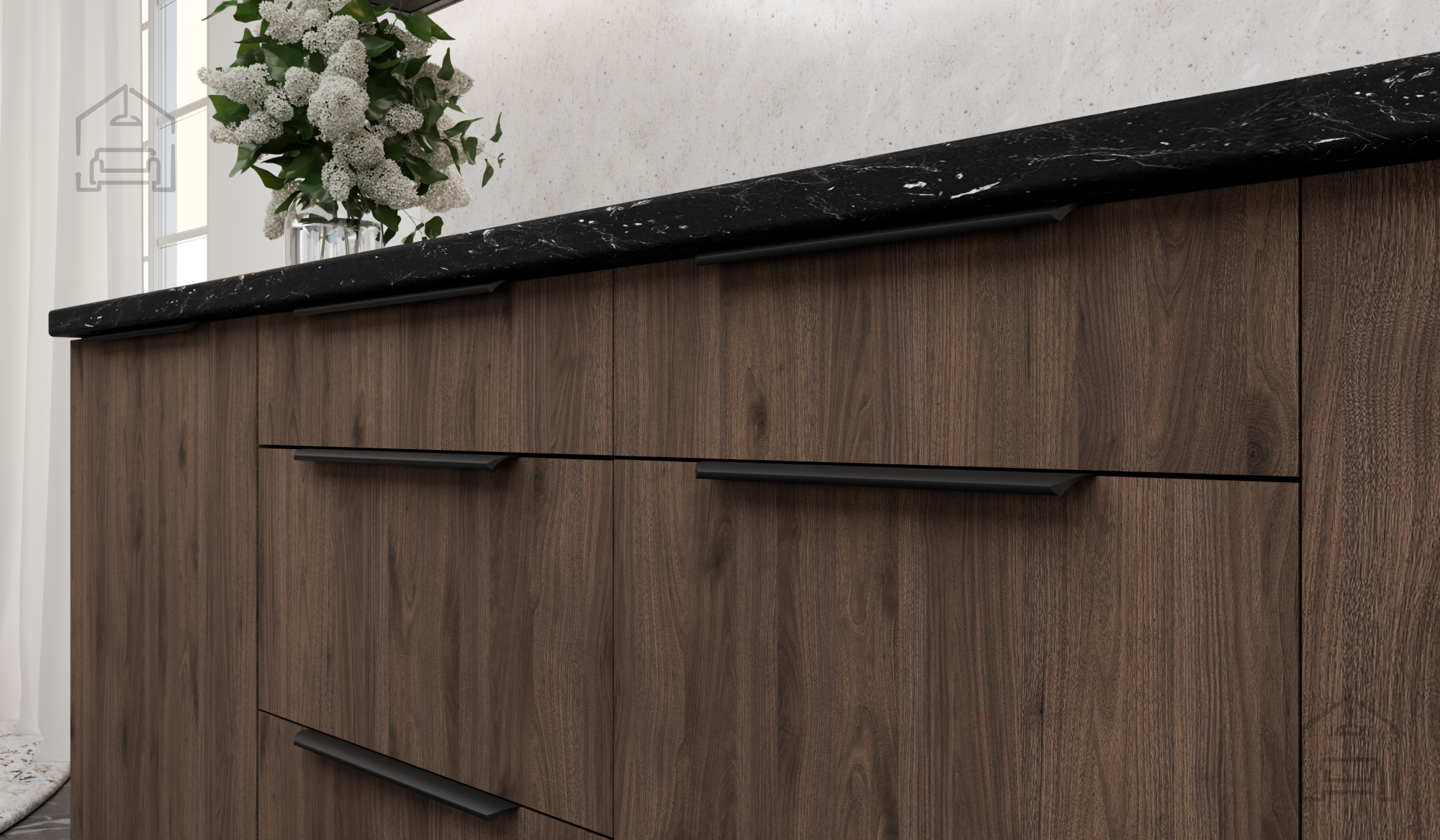 Kombinacija barv okopi oreh in črna ustvarja prefinjeno kontrastno igro, ki omari daje prestižen videz. Površina je enostavna za čiščenje in odporna na vsakodnevno uporabo, zato bo ohranila svoj prvotni izgled še dolga leta. Pult v imitaciji marmorja Roma doda pridih razkošja in se odlično poda k številnim drugim elementom kuhinje. Omara je zasnovana tako, da ponuja dovolj prostora za shranjevanje posode, začimb ali drugih dodatkov, ki jih želite imeti vedno pri roki.