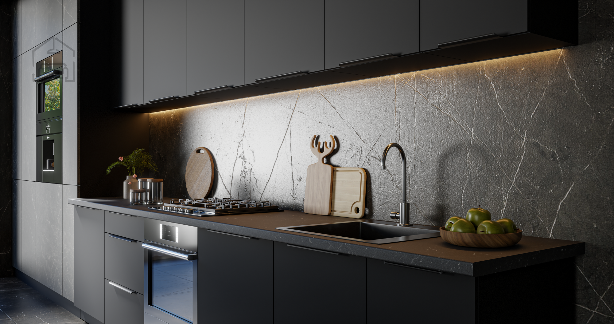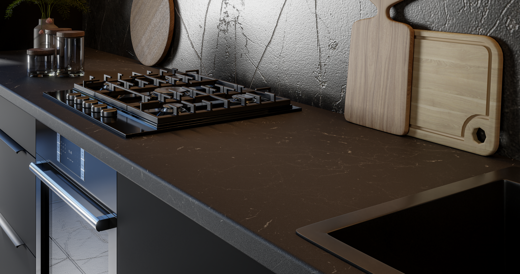 Posebno pozornost so oblikovalci namenili tudi estetiki steklenih elementov. Kaljeno grafitno steklo debeline 4 mm, polirano po celotnem obodu, daje kuhinji prefinjen značaj, hkrati pa omogoča subtilen pogled v notranjost zgornjih omaric. Steklene police debeline 5 mm so elegantno obdelane in izjemno trpežne, kar omogoča varno shranjevanje tudi težjih predmetov.