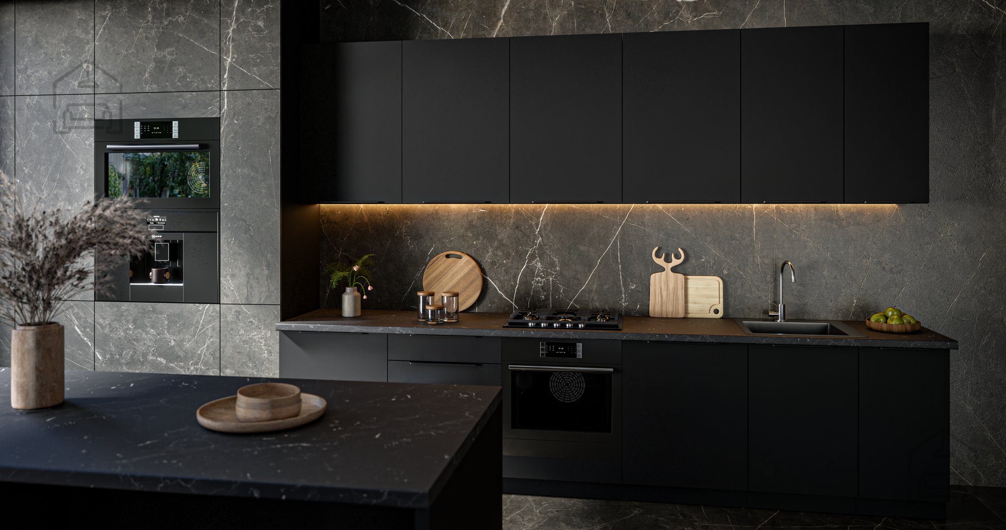 Eleganca, funkcionalnost in brezčasna preprostost se združujejo v enem – v popolni izbiri za sodobno kuhinjo, kjer kakovost in dizajn stopita v ospredje. Ta kuhinjski sestav s širino 320 cm je idealna rešitev za tiste, ki želijo ustvariti prostor, v katerem se udobje združi z estetsko dovršenostjo. Črna mat barva in minimalistični robni ročaji UA-HEXA v kombinaciji črne in aluminijaste barve poskrbijo za sofisticiran videz, ki se odlično poda tako modernim kot tudi industrijskim interierjem.
