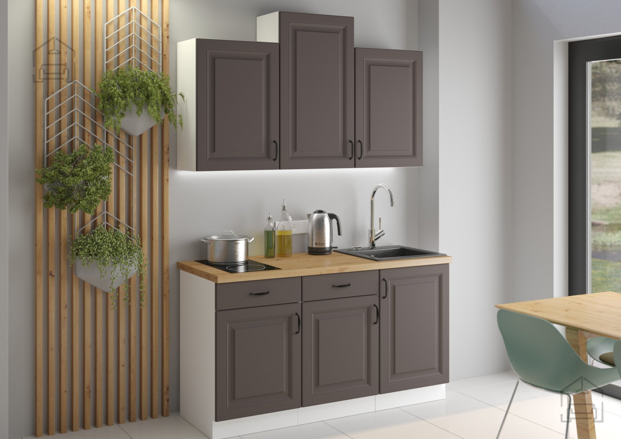 Ta kuhinjski sestav s širino 150 cm je idealna rešitev za manjše in srednje velike prostore, kjer je vsak centimeter pomemben. Kljub kompaktnim meram ponuja dovolj prostora za shranjevanje, pregledno razporeditev posode in kuhinjskih pripomočkov ter estetski videz, ki prostoru doda vrednost.