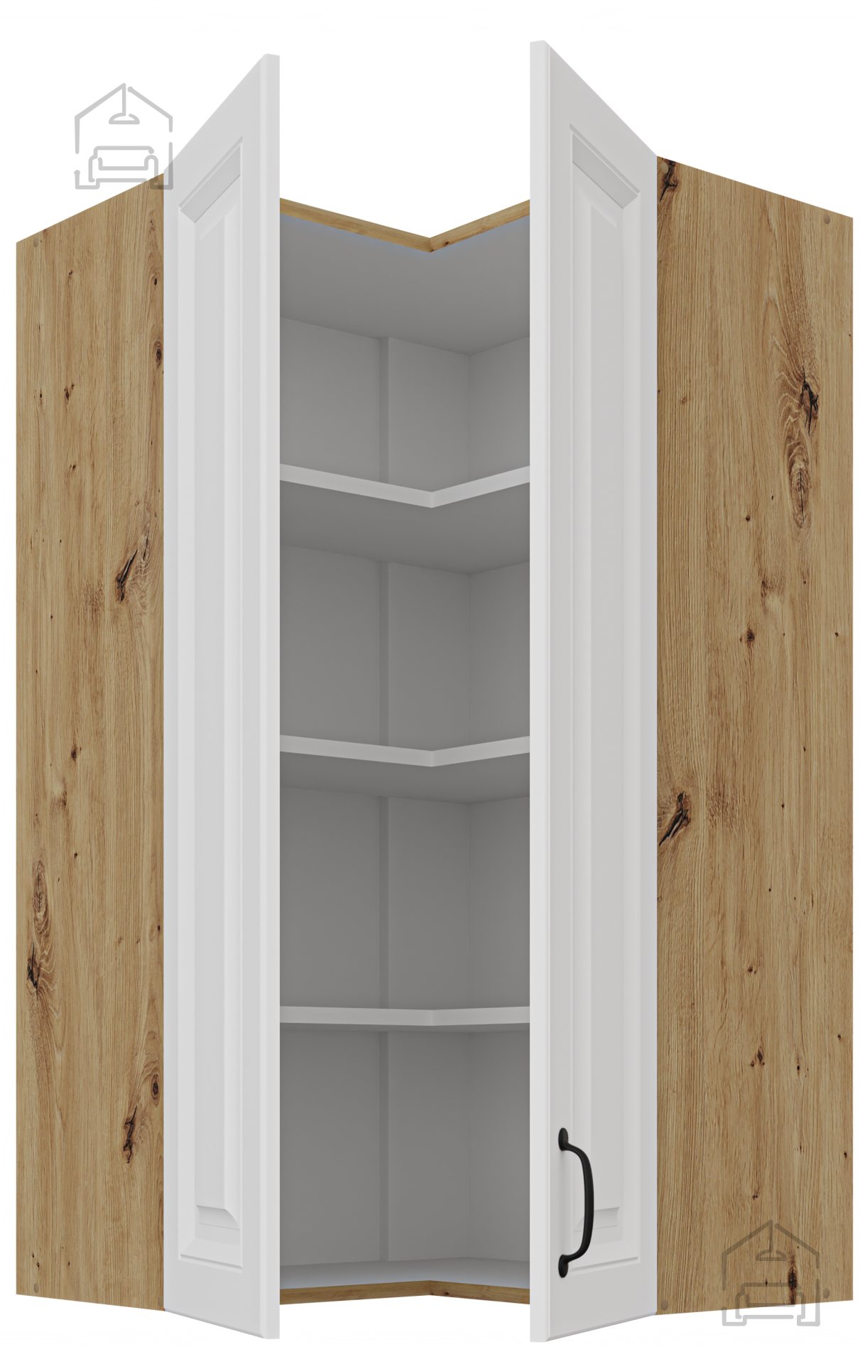 Zgornja kotna omara Stilo v kombinaciji bele barve in hrasta artisan je popolna izbira za vse, ki si želijo estetsko dovršeno, praktično in kakovostno rešitev za svojo kuhinjo. S svojo sodobno obliko, premišljenimi detajli in naravno barvno kombinacijo bo brez težav dopolnila tako klasične kot sodobne kuhinjske ambiente. Omara je izdelana iz visokokakovostne laminirane plošče, ki zagotavlja dolgo življenjsko dobo, odpornost na vlago ter enostavno vzdrževanje. Njen brezčasen videz in premišljena funkcionalnost bosta vašo kuhinjo spremenila v prostor, kjer se estetika in udobje popolno združujeta.