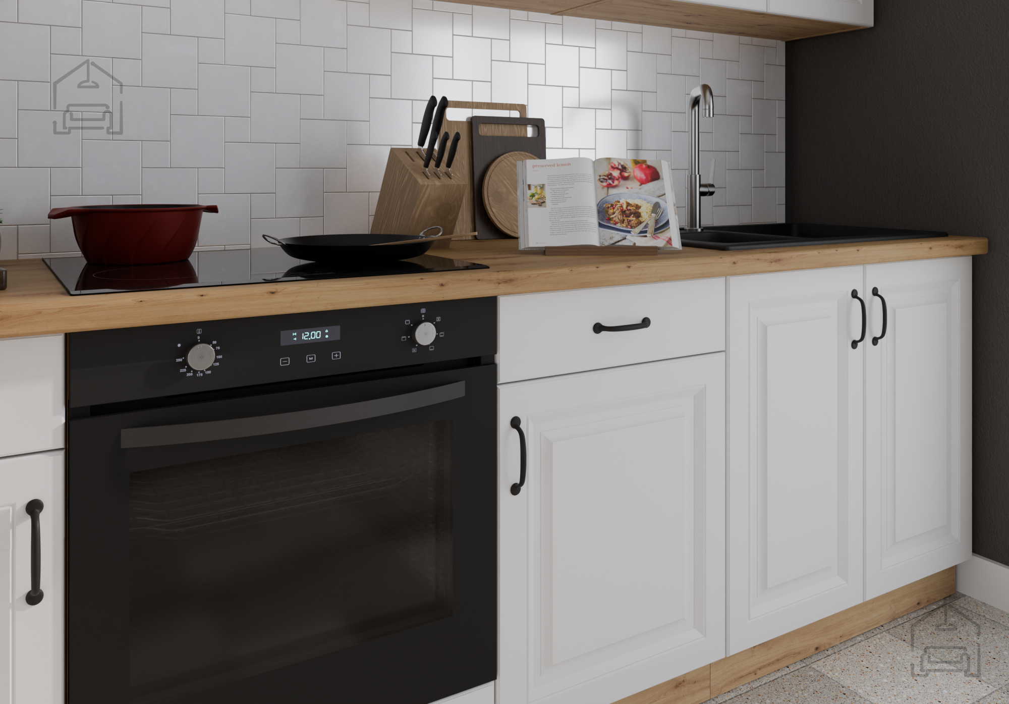 Vsaka podrobnost je premišljeno zasnovana. Fronte iz kakovostne MDF plošče v mat beli barvi so poudarjene z rahlim rezkanjem, ki dodaja globino in vizualni značaj. Črni kovinski ročaji (96 mm) dajejo pohištvu moderen industrijski pridih, obenem pa so ergonomski in udobni za uporabo. Delovna plošča debeline 38 mm v dekorju R20315RU artisan dopolnjuje celoto s strukturirano površino, odpornejšo na prah, vlago in toploto.