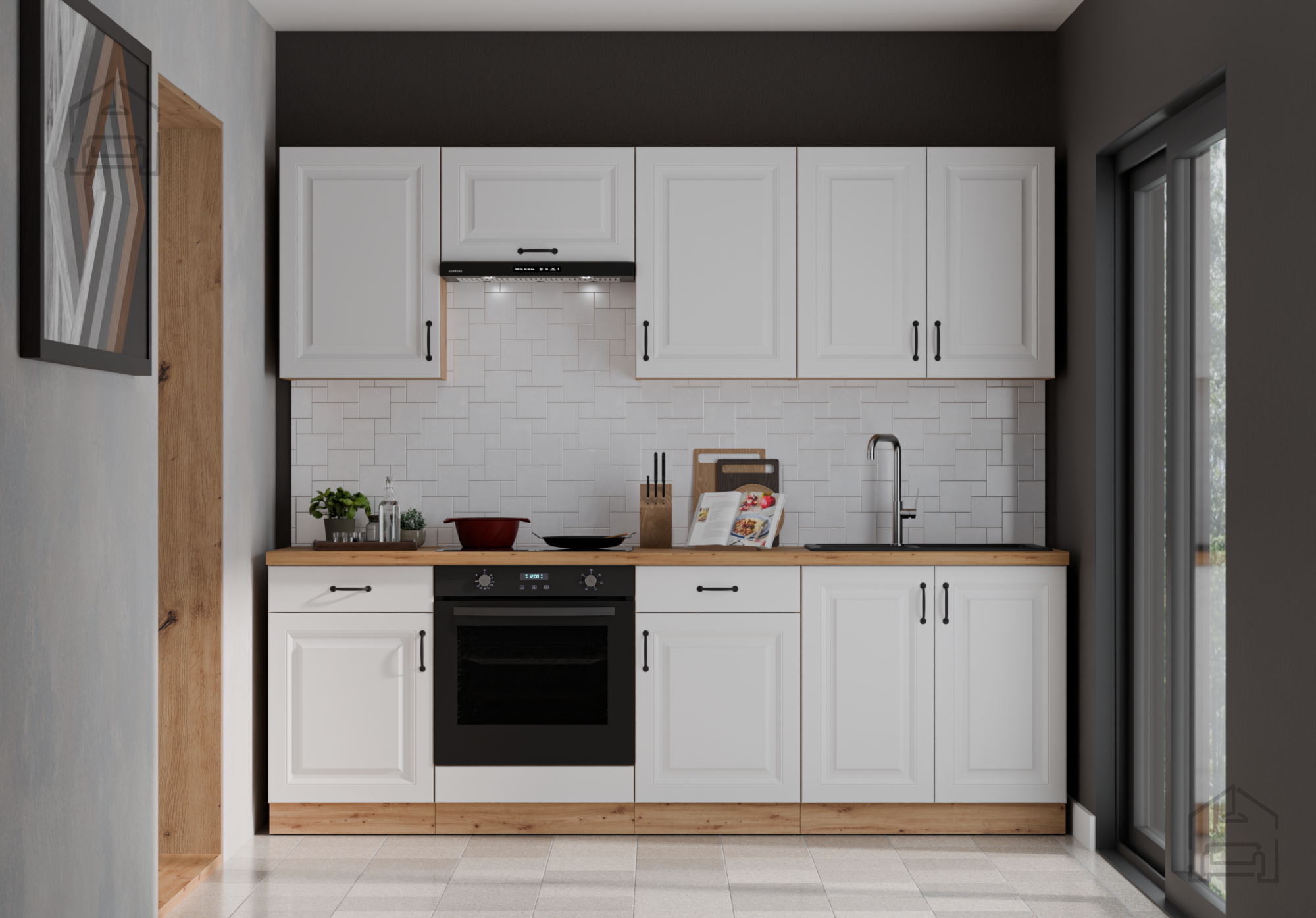 Kuhinjski sestav Stilo - bel/hrast artisan - 240 cm - 1 sestav