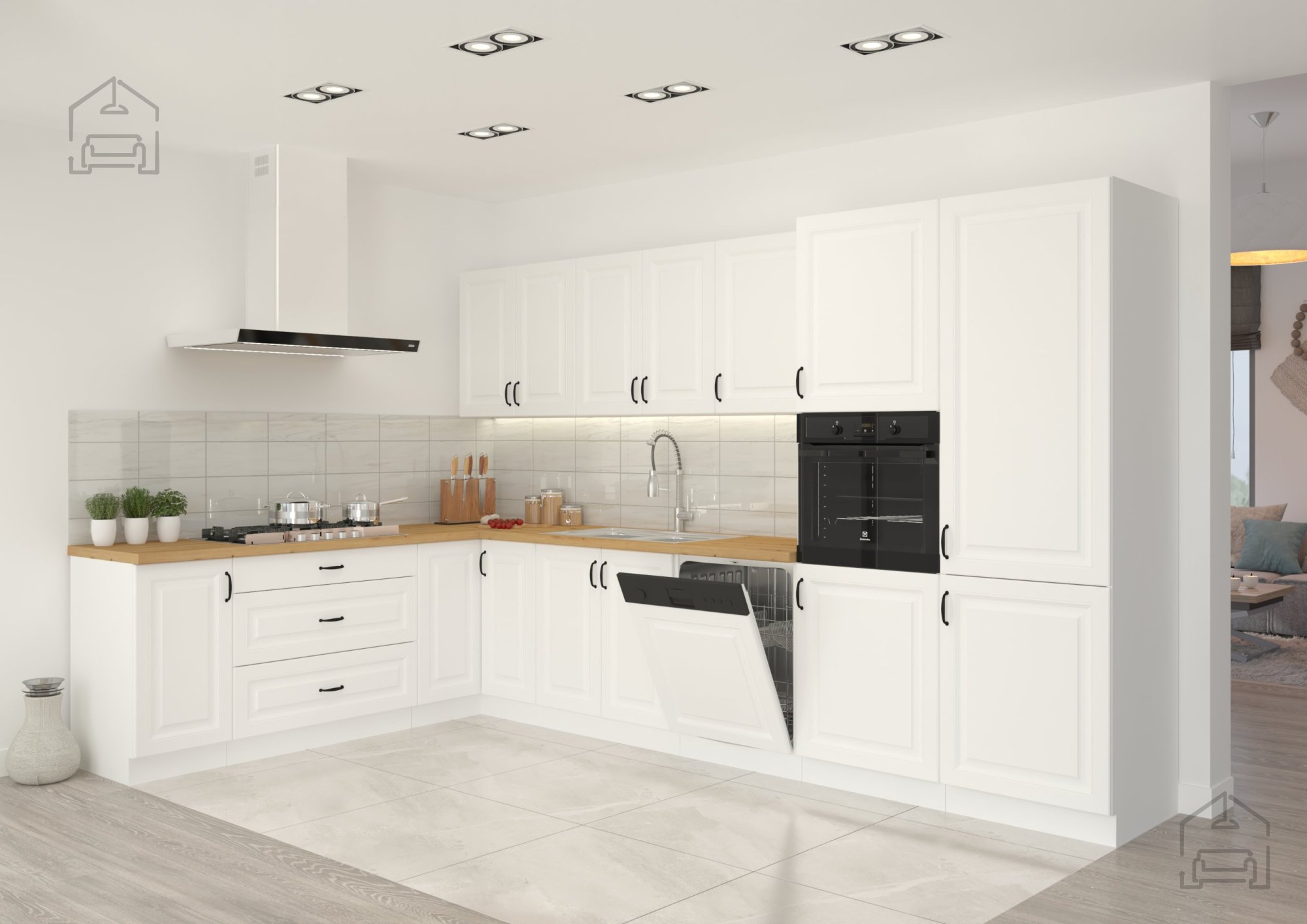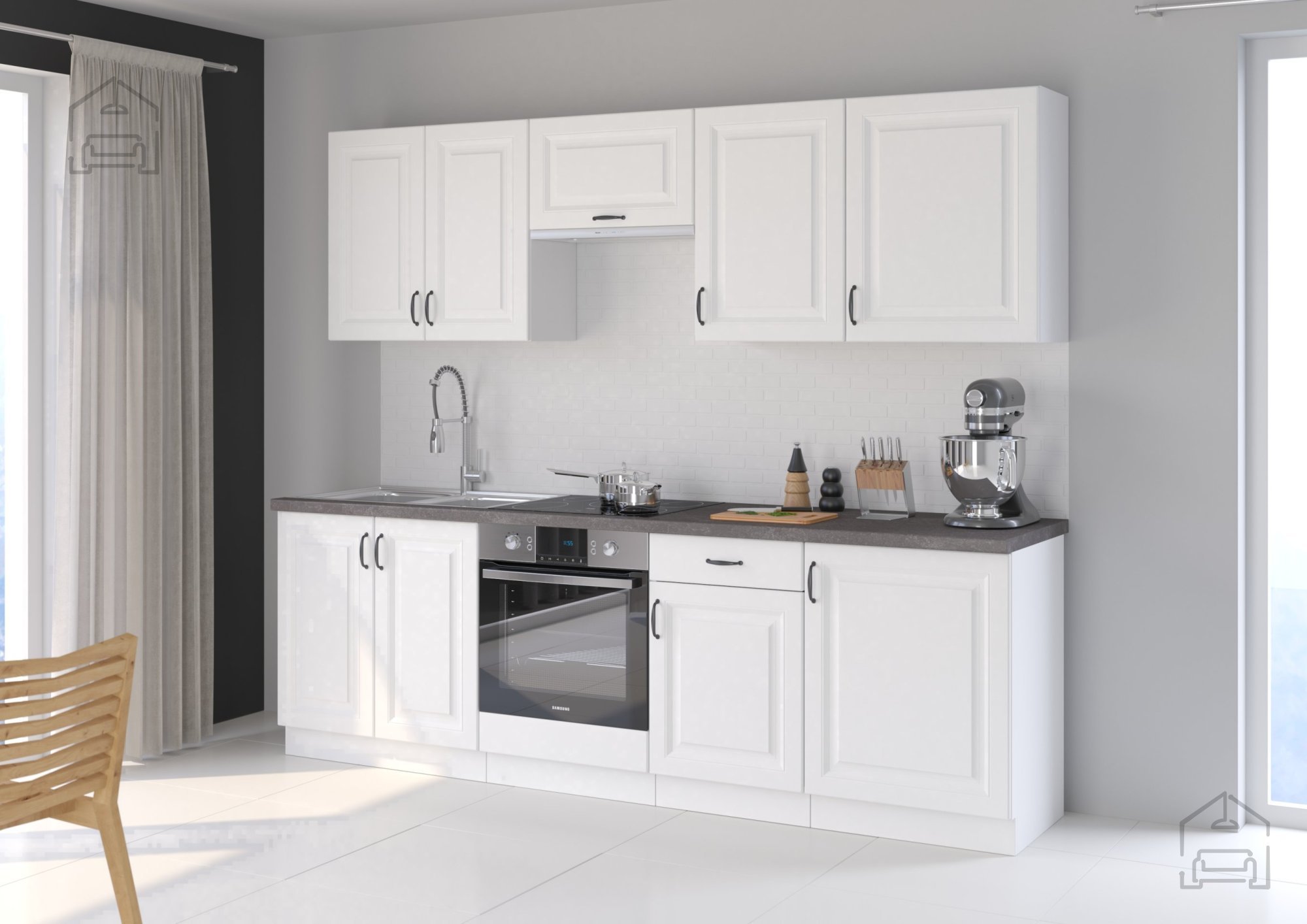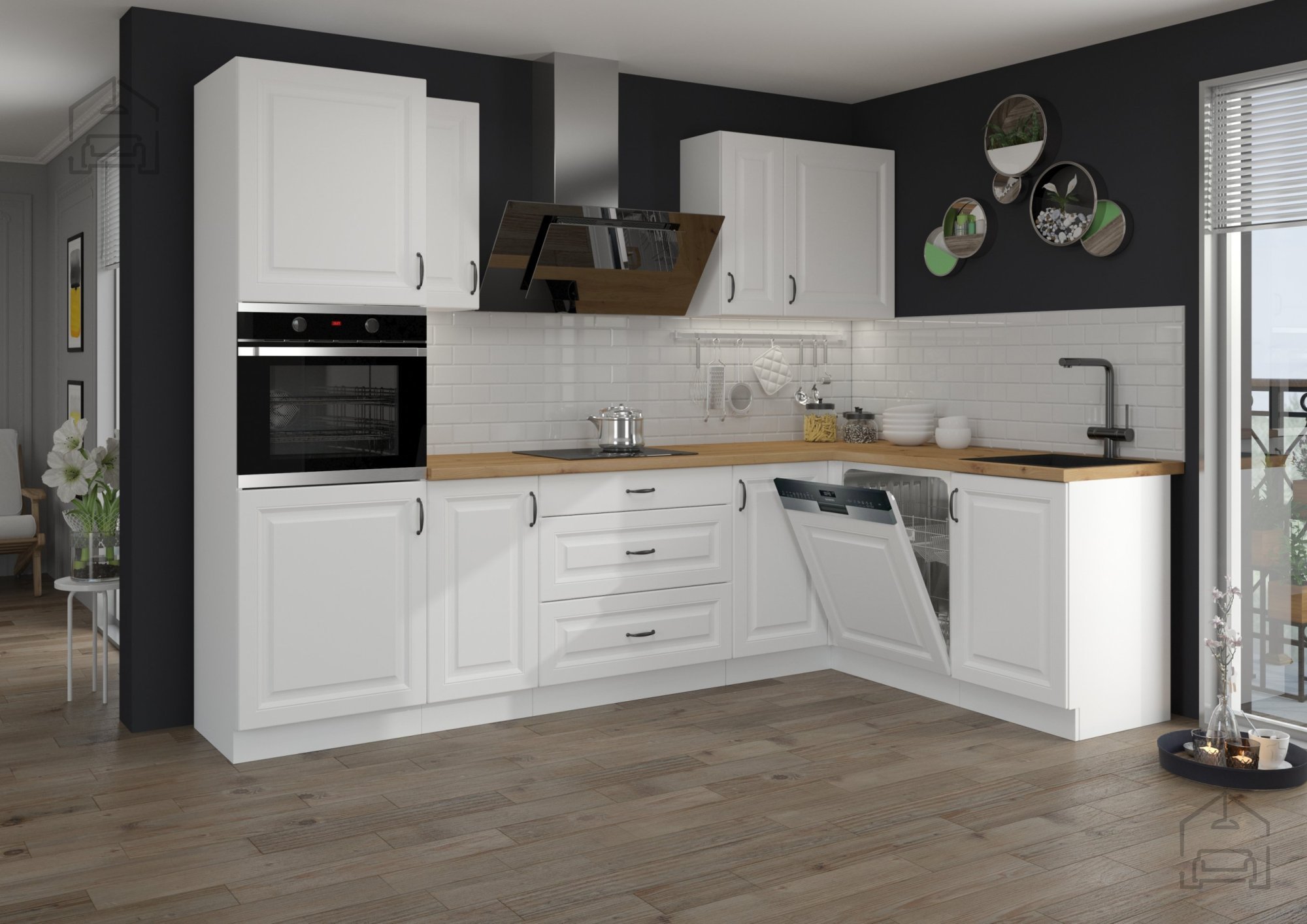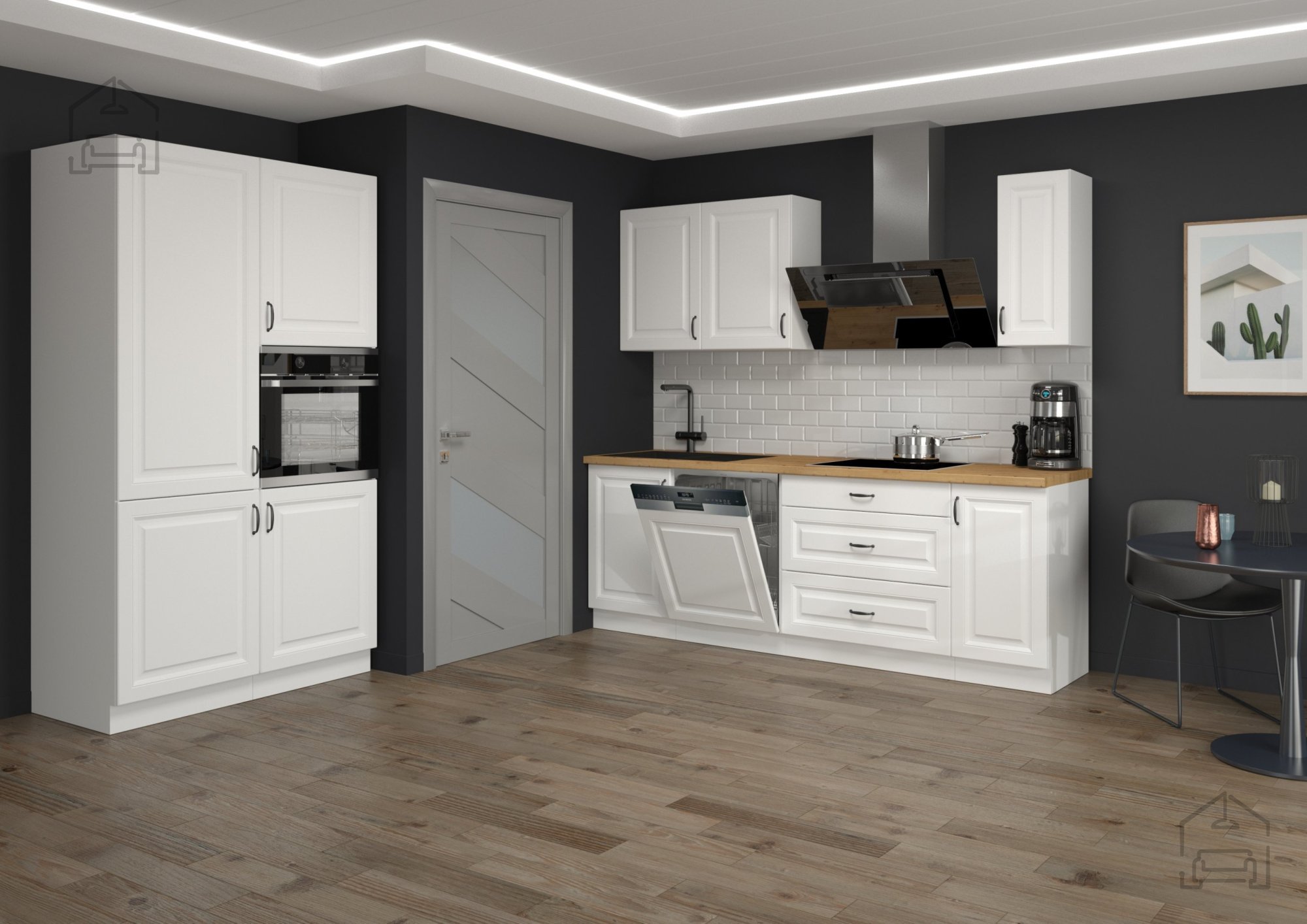 Bela barva nikoli ne gre iz mode – je simbol čistoče, svetlobe in prostornosti. Bela površina korpusa in front daje prostoru svežino in vizualno poveča prostor, kar je še posebej pomembno v manjših kuhinjah ali stanovanjih. V kombinaciji z detajli, kot je kovinski ročaj v elegantnem dizajnu (96 - 2342), omara doda pridih sodobne prefinjenosti. Ta kombinacija ustvarja harmoničen kontrast med toplino lesenih elementov in hladno eleganco kovine.