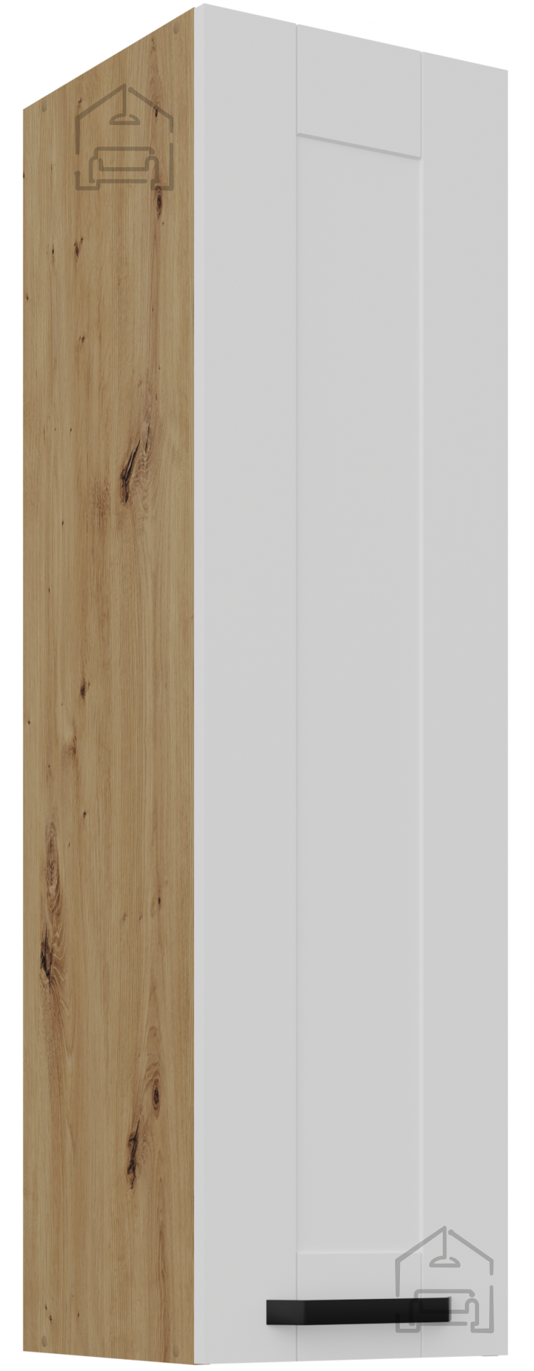 Omara dimenzij 30x31x107,5 cm je izdelana iz trpežne laminirane plošče, kar zagotavlja dolgo življenjsko dobo in enostavno vzdrževanje. Površina je odporna proti praskam, vlagi in toploti, zato bo omara dolgo ohranila svoj brezhiben videz. Kombinacija bele barve in hrasta artisan prinaša v prostor svetlobo ter naravni občutek topline, ki se odlično ujema z različnimi stili – od podeželskega do modernega.