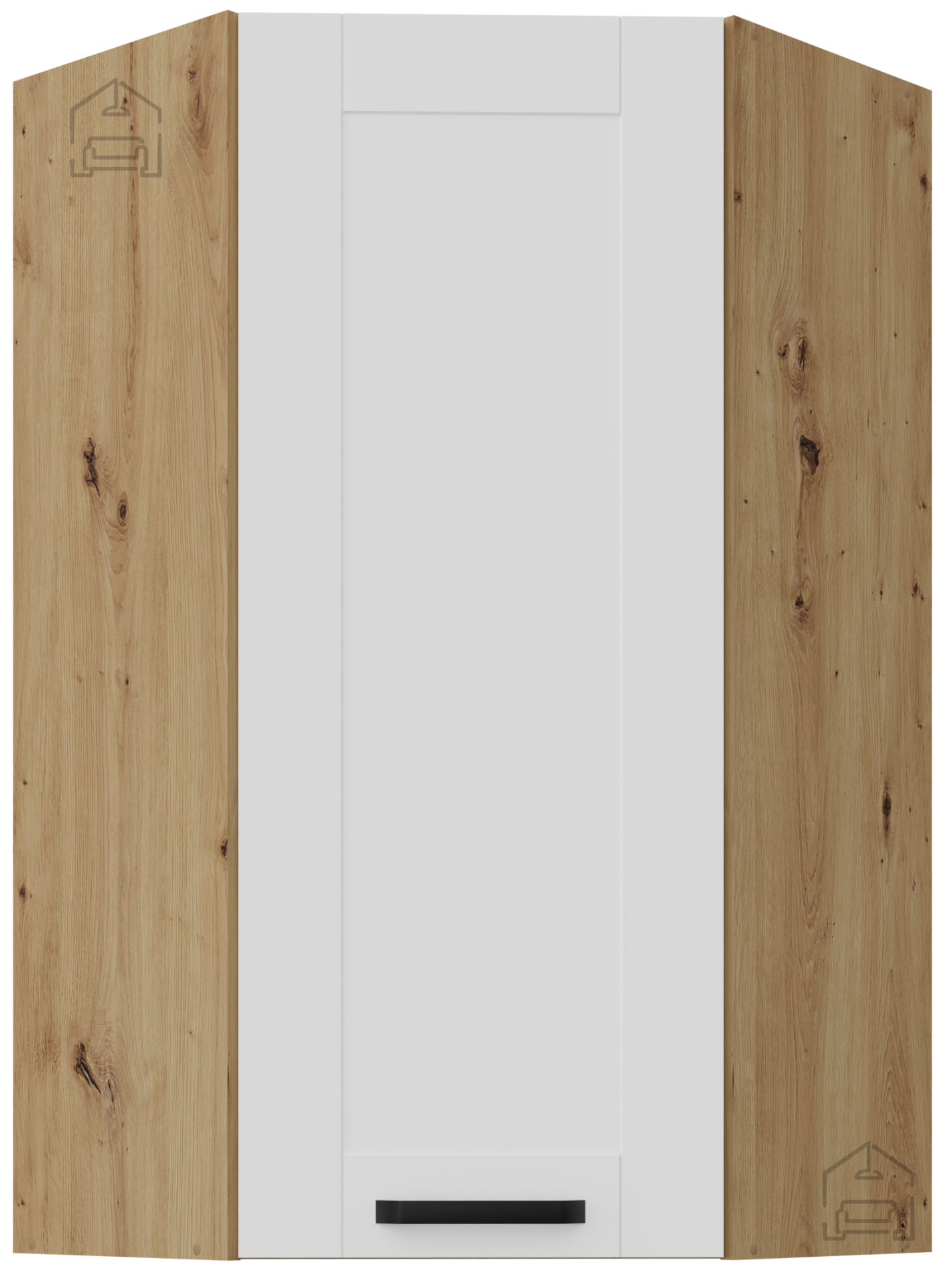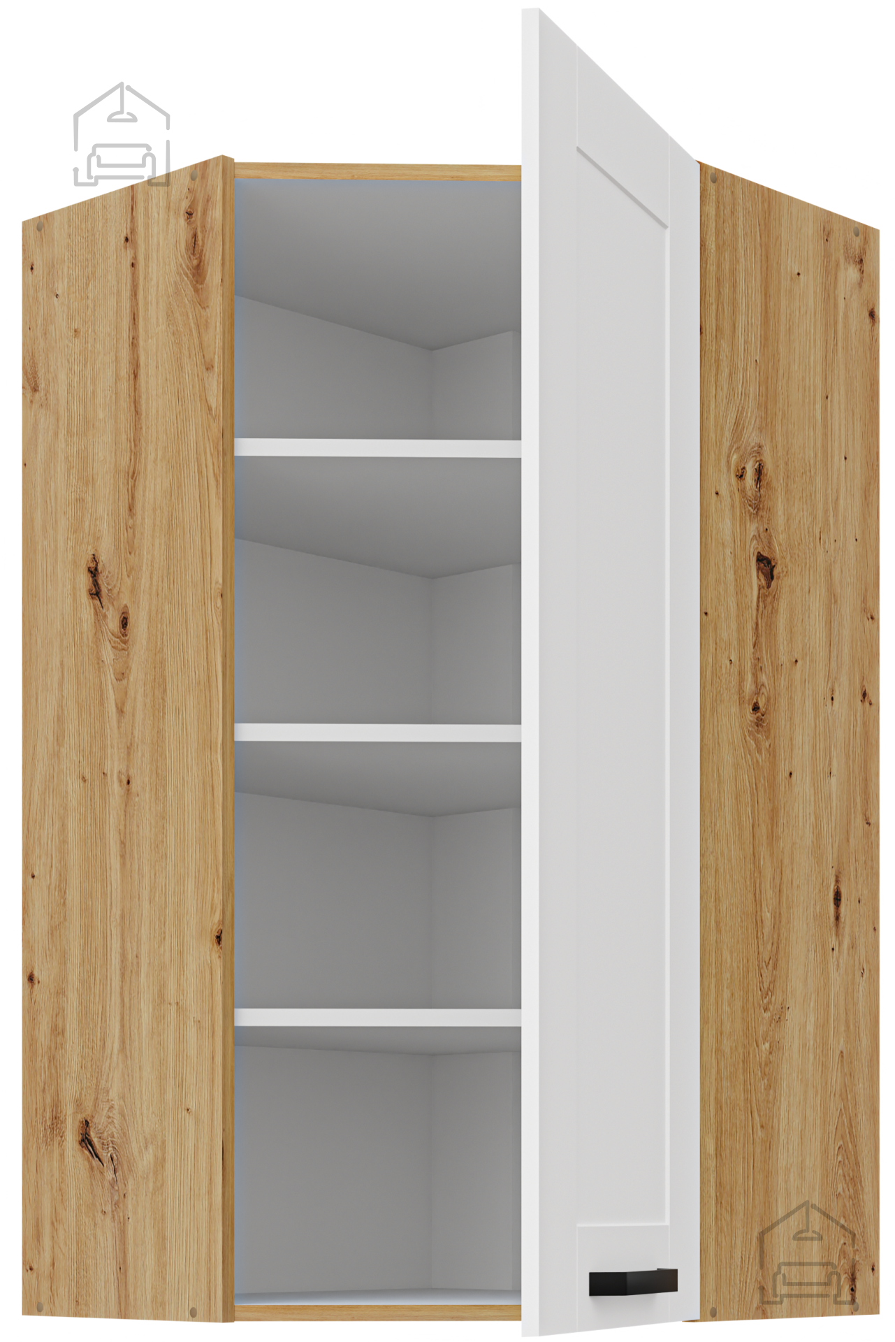 Popolna kombinacija elegance, funkcionalnosti in kakovosti – to so glavne značilnosti, ki jih prinaša zgornja kotna omara Luna v čudoviti kombinaciji bele barve in dekorja hrasta artisan. Ta premišljeno zasnovan kuhinjski element je idealna rešitev za vsak sodoben dom, ki ceni estetsko dovršenost, maksimalno izkoriščen prostor in dolgo življenjsko dobo pohištva. S svojim prefinjenim videzom in praktično zasnovo bo omara Luna v trenutku obogatila videz vaše kuhinje ter ji dodala pridih topline in naravne elegance.