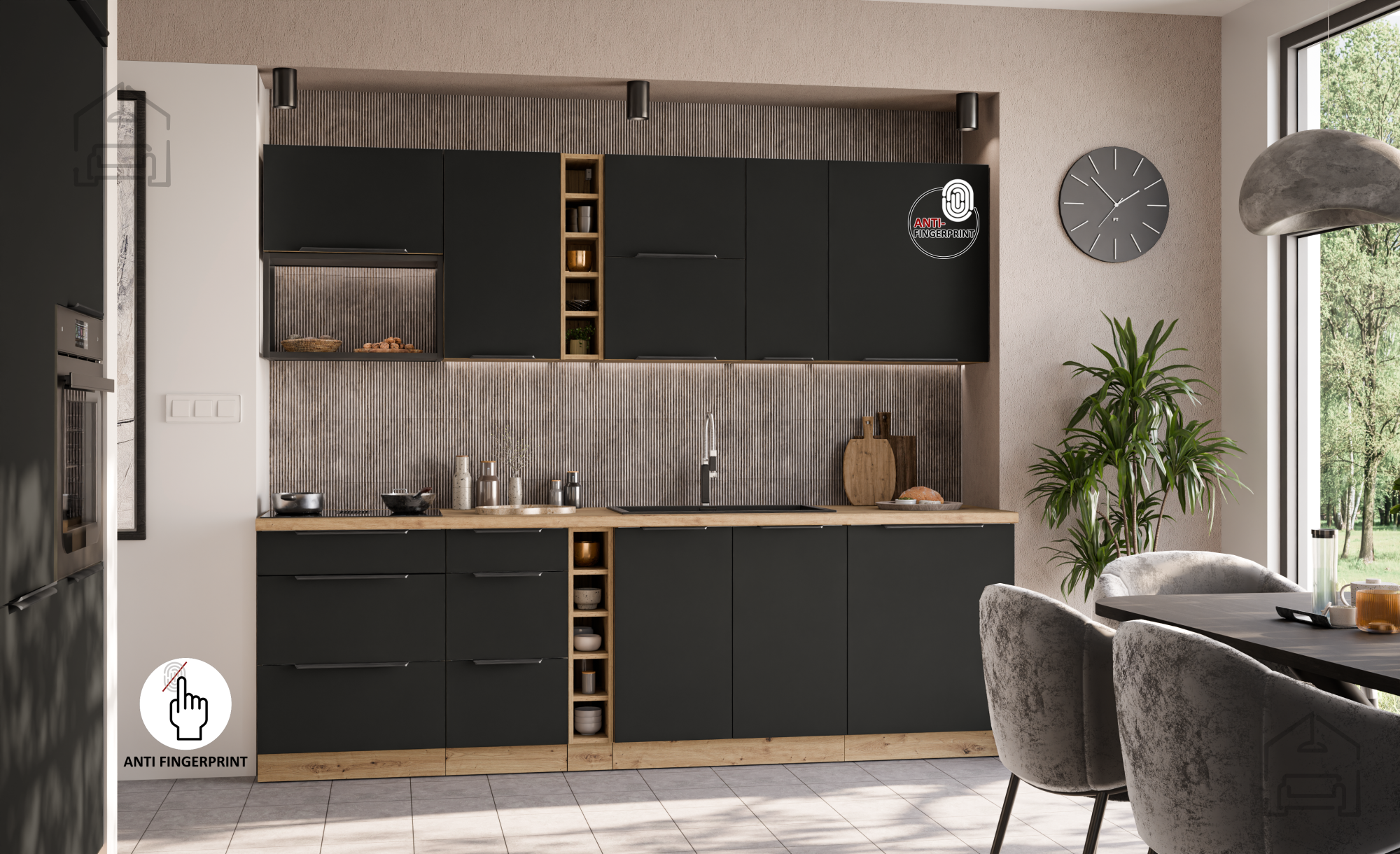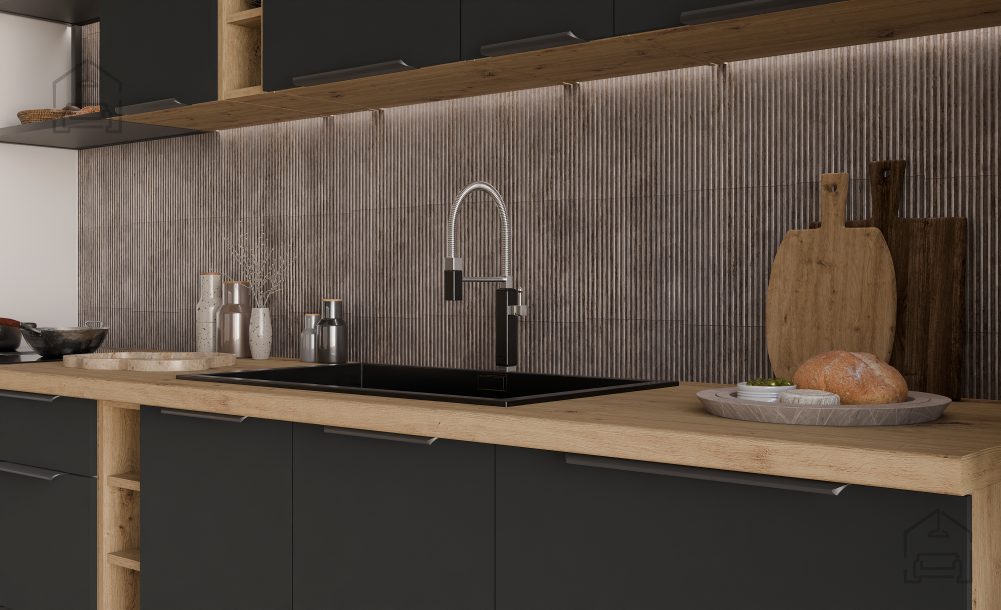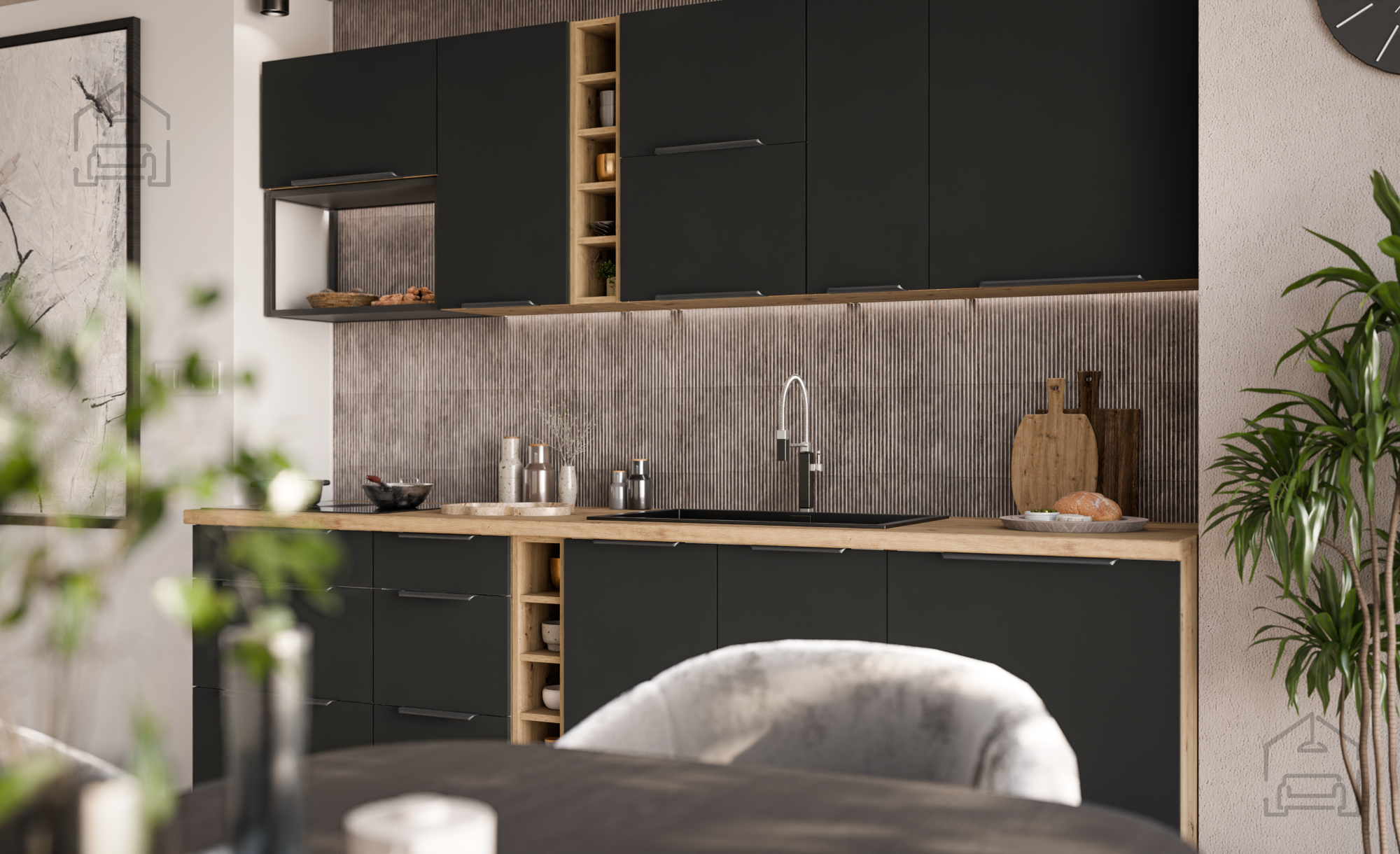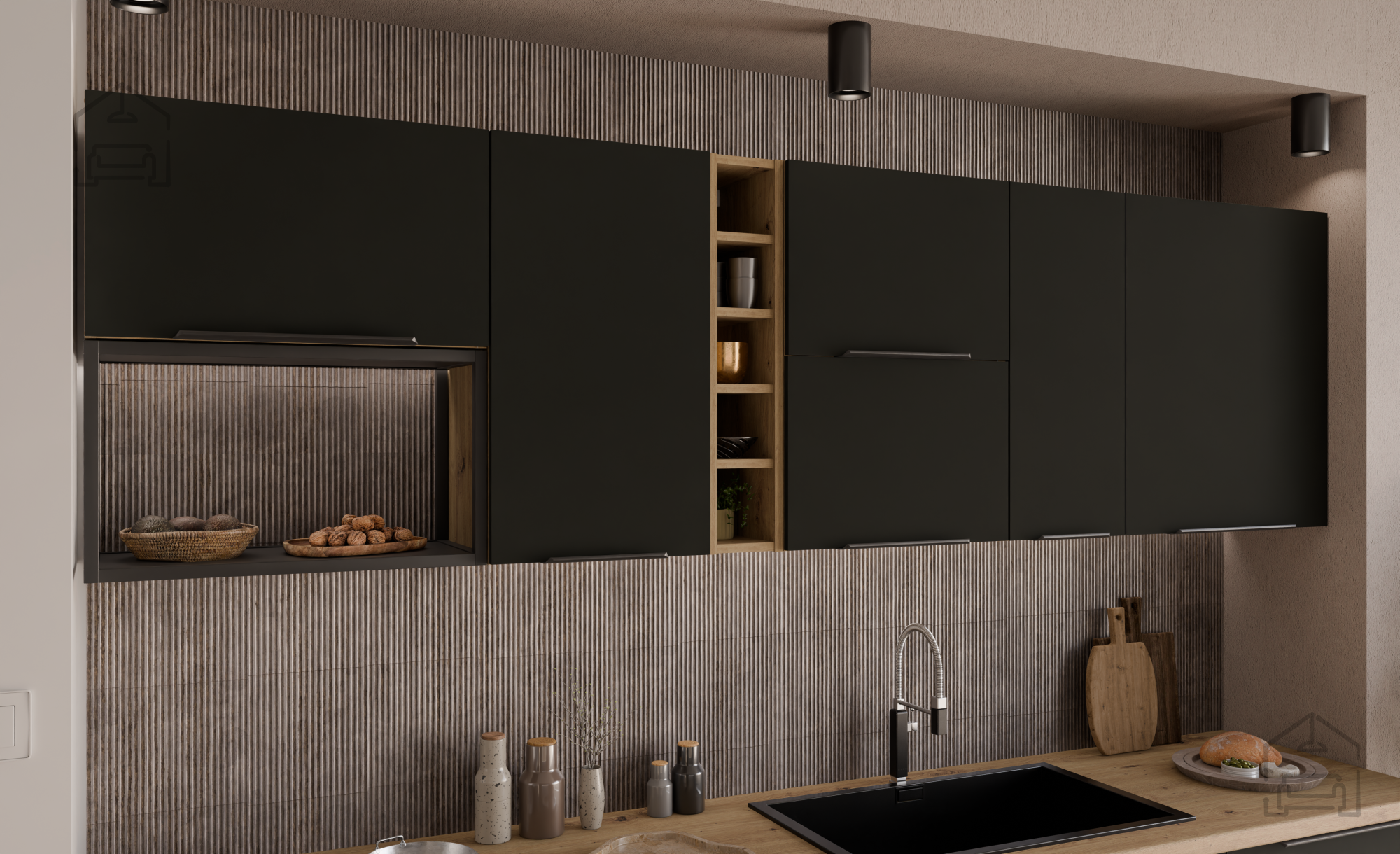 Kombinacija črne in lesene teksture daje prostoru karakter in toplino, ki jo boste občutili vsak dan. Z dodajanjem osebnih dekorativnih poudarkov, kot so steklene police, kovinski dodatki ali svetlobni elementi, lahko kuhinjo popolnoma prilagodite svojemu slogu in jo spremenite v prostor, ki izraža vašo osebnost.