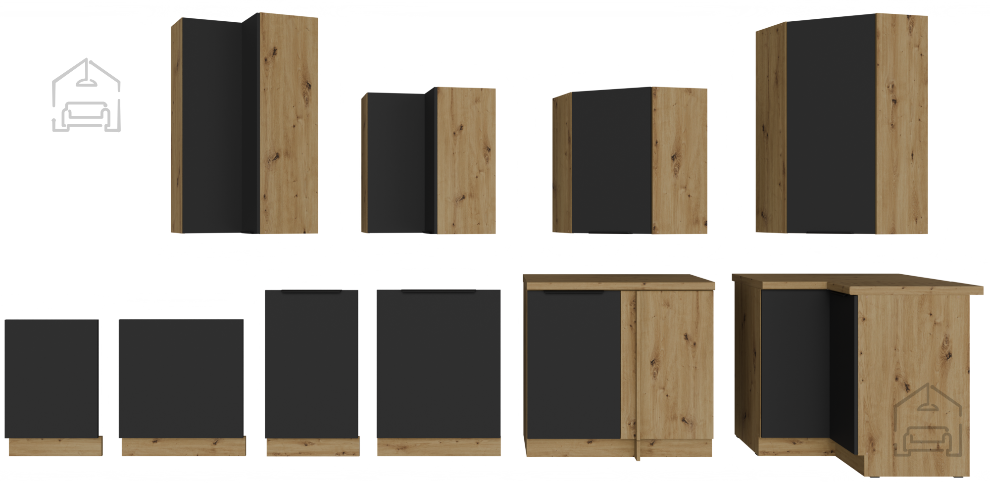 Kuhinjski sestav Aria je izdelan iz visokokakovostne laminirane plošče debeline 16 mm, kar zagotavlja izjemno stabilnost in trajnost skozi leta uporabe. Površina je odporna na praske, vlago in vročino, zato bo vaša kuhinja vedno videti kot nova, tudi po vsakodnevni uporabi. Črni elementi poskrbijo za sodoben pridih, medtem ko toplina artisan hrasta vnese naravni značaj, ki se odlično poda tako modernim kot klasičnim interjerjem.