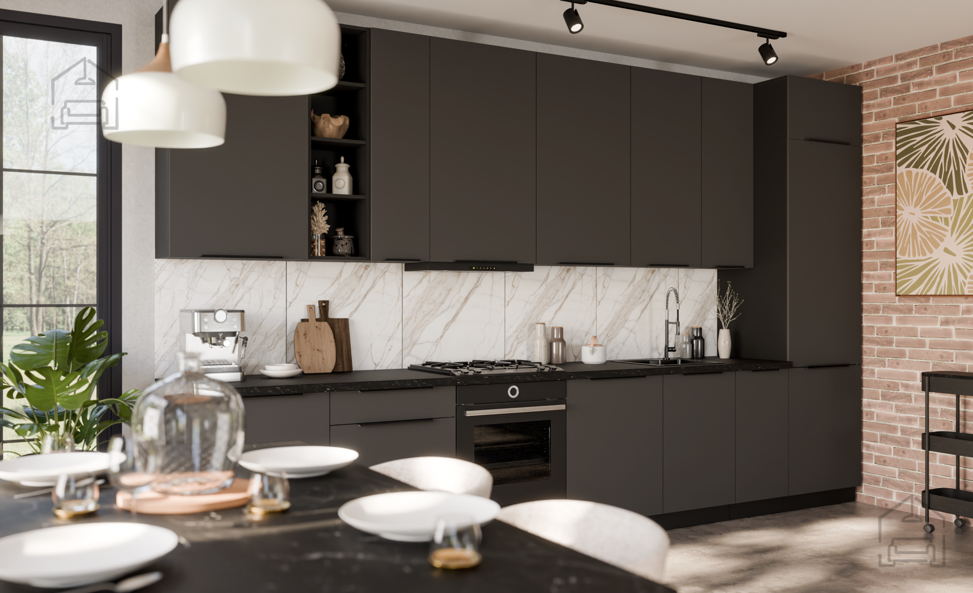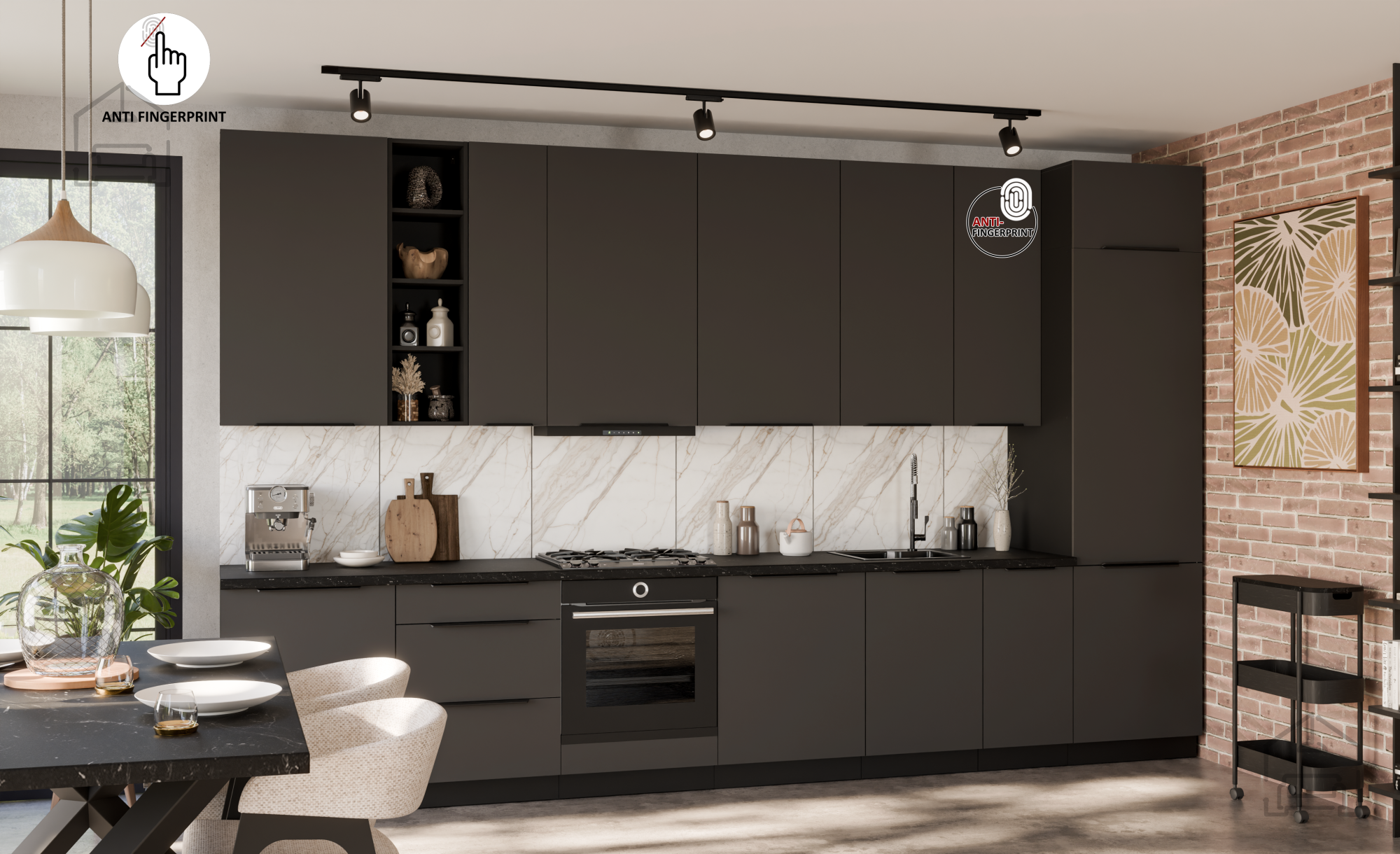 Kuhinjski sestav Aria v prefinjeni sivo-črni barvni kombinaciji je popolna izbira za vse, ki želijo v svoj dom vnesti pridih modernega minimalizma in brezčasne elegance. Zasnovan je tako, da združuje estetiko, praktičnost in kakovostno izdelavo – lastnosti, ki jih v sodobnem domu preprosto ne smemo spregledati. Izdelan je iz 16 mm laminirane plošče, kar zagotavlja izjemno trpežnost in dolgo življenjsko dobo. Površina je odporna proti praskam in vlagi, zato bo vaša kuhinja dolgo ostala kot nova.