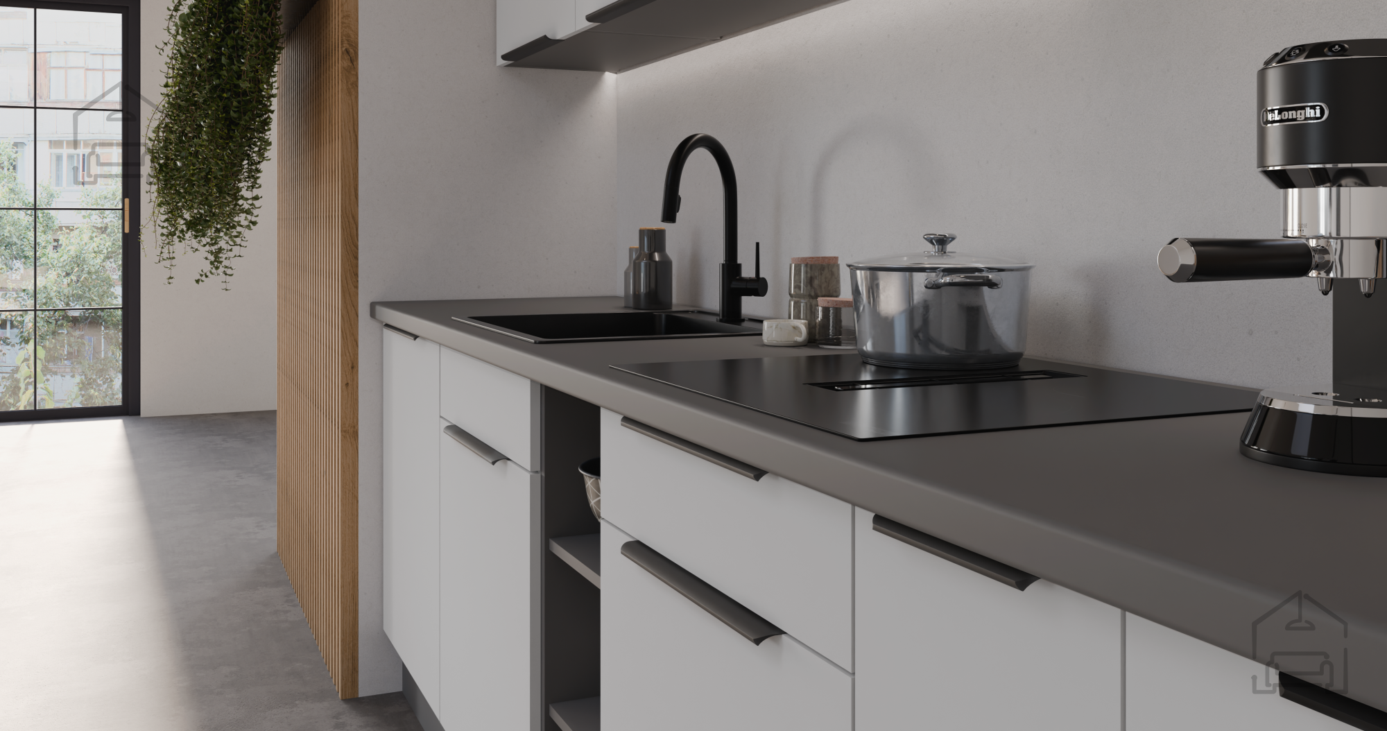 Barvna kombinacija bela/antracit prinaša vizualno ravnovesje – bela barva optično poveča prostor in ga napolni s svetlobo, antracitni toni pa dodajo globino in eleganco. Takšna barvna shema omogoča številne kombinacije z različnimi dekorji, talnimi oblogami in gospodinjskimi aparati, zato se Aria zlahka prilagodi tako svetlim kot temnejšim kuhinjskim prostorom. Delovna plošča v izvedbi 38-6499 marmor roma posnema naravni kamen, kar kuhinji doda pridih luksuza in trajne vrednosti. Poleg estetske funkcije nudi tudi izjemno odpornost na praske in vročino, kar je v vsakodnevni uporabi ključno.