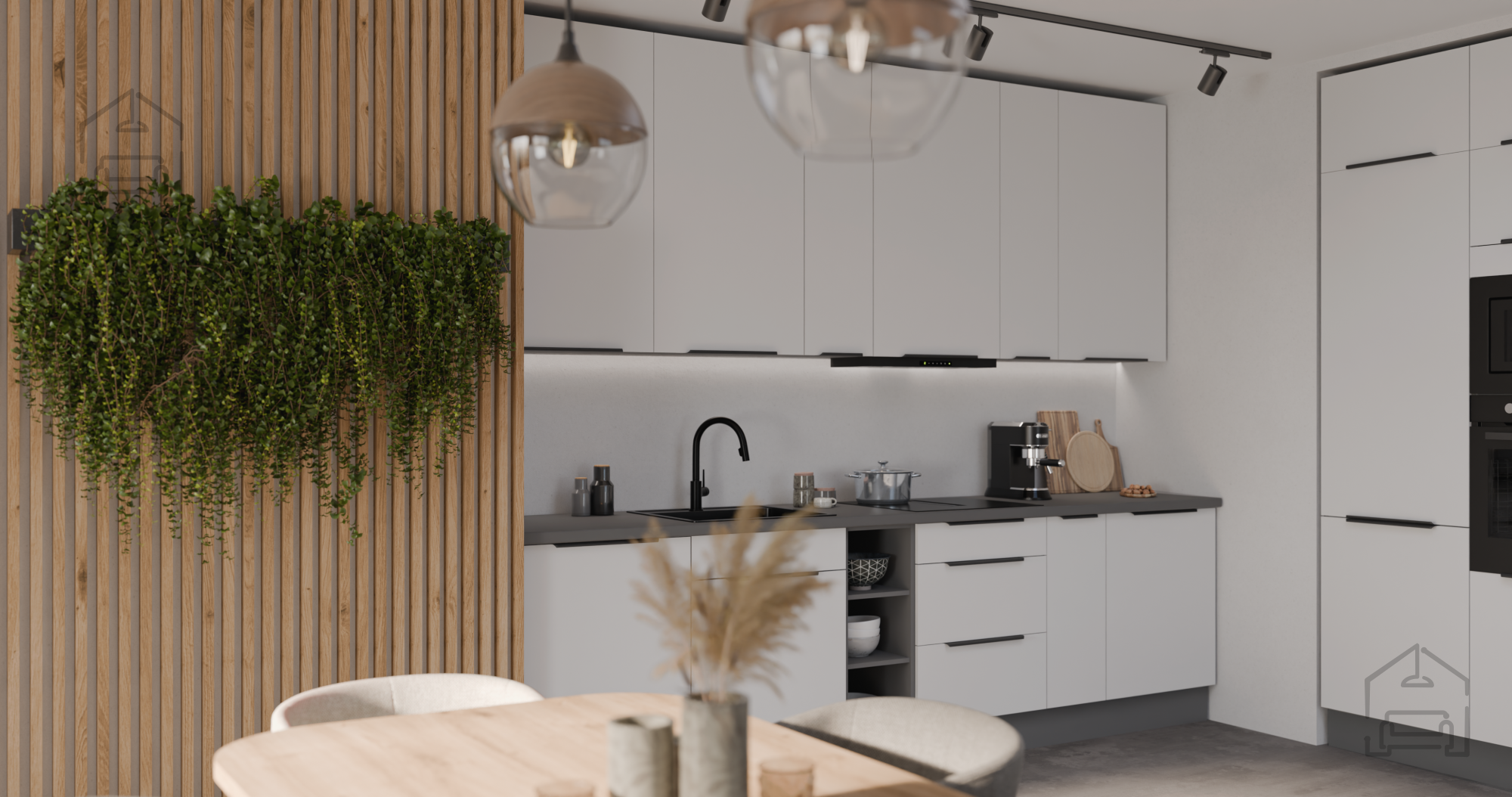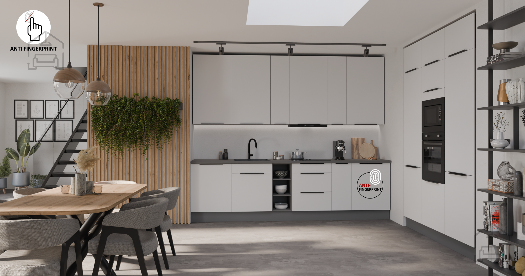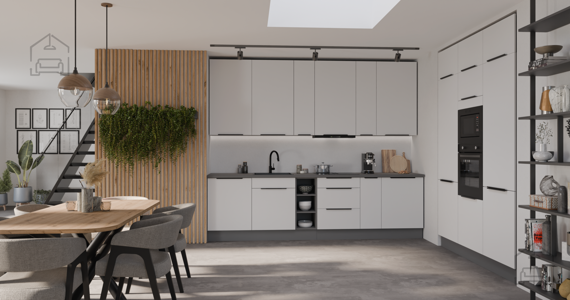 Kuhinjski sestav Aria poljskega proizvajalca Stolarz-Lempert združuje minimalistično estetiko, funkcionalnost in kakovost izdelave, ki jo pričakujete od sodobne kuhinje. Izdelan je iz trpežne laminirane plošče debeline 16 mm, ki zagotavlja dolgo življenjsko dobo, odpornost proti vlagi ter enostavno čiščenje površin. Kombinacija bele in antracitne barve ustvarja sodoben, a hkrati topel videz, ki se lepo ujema z različnimi stili notranje opreme – od modernih do klasičnih ambientov.