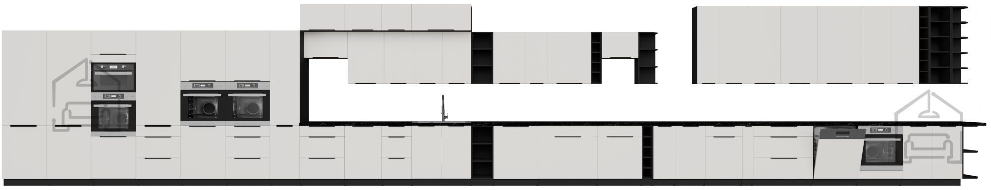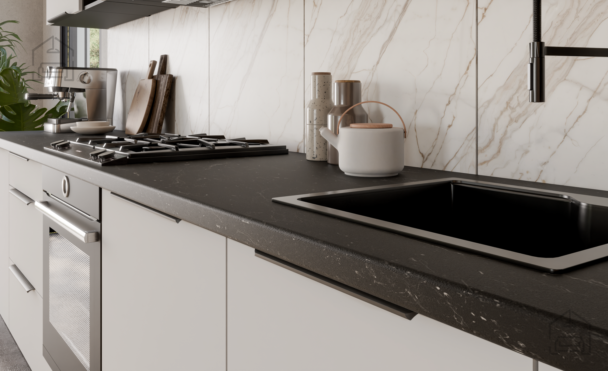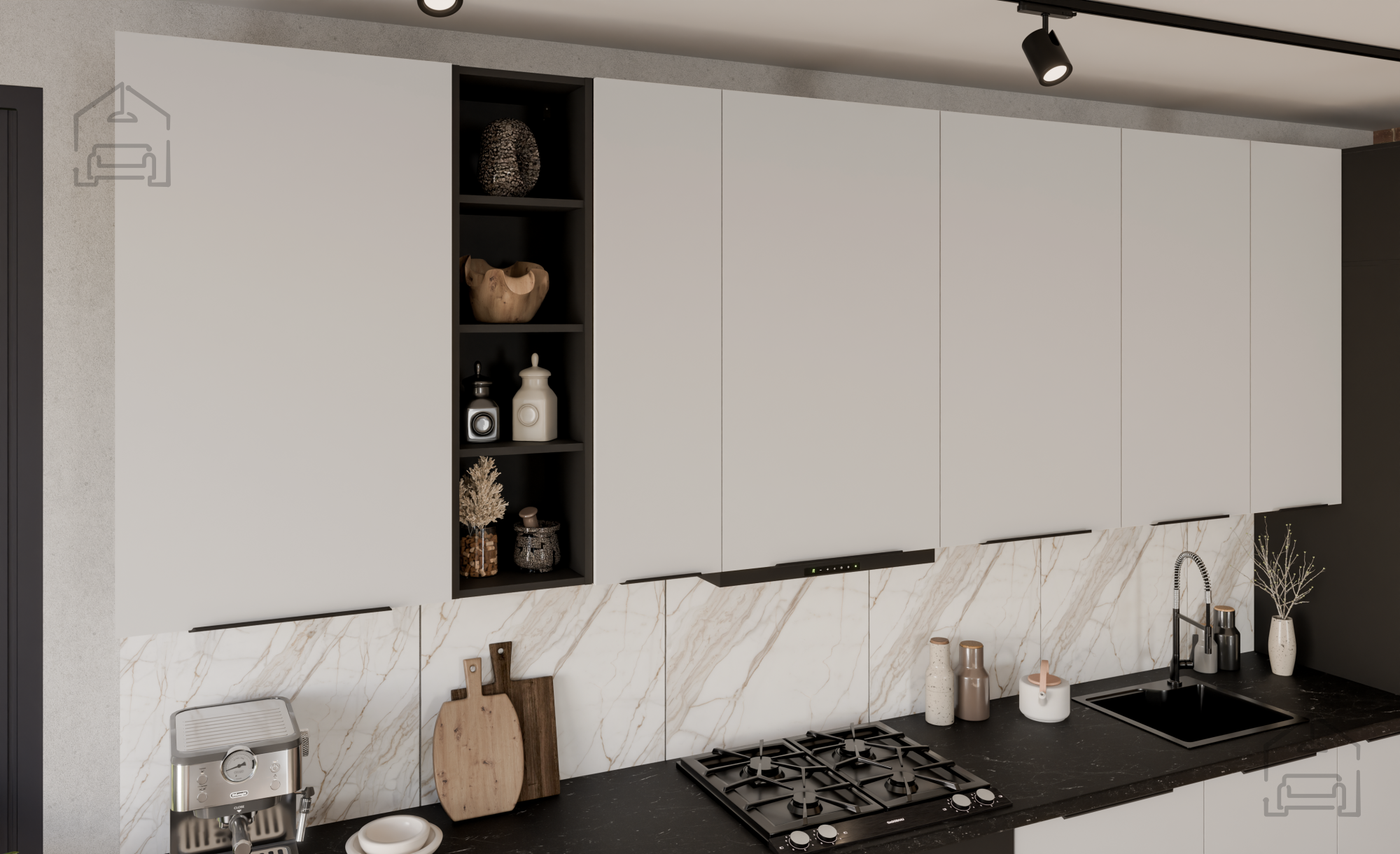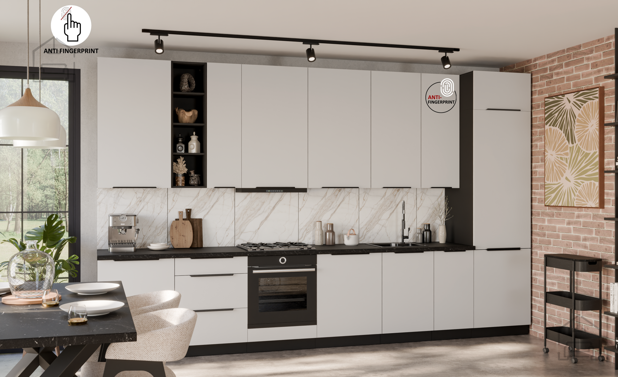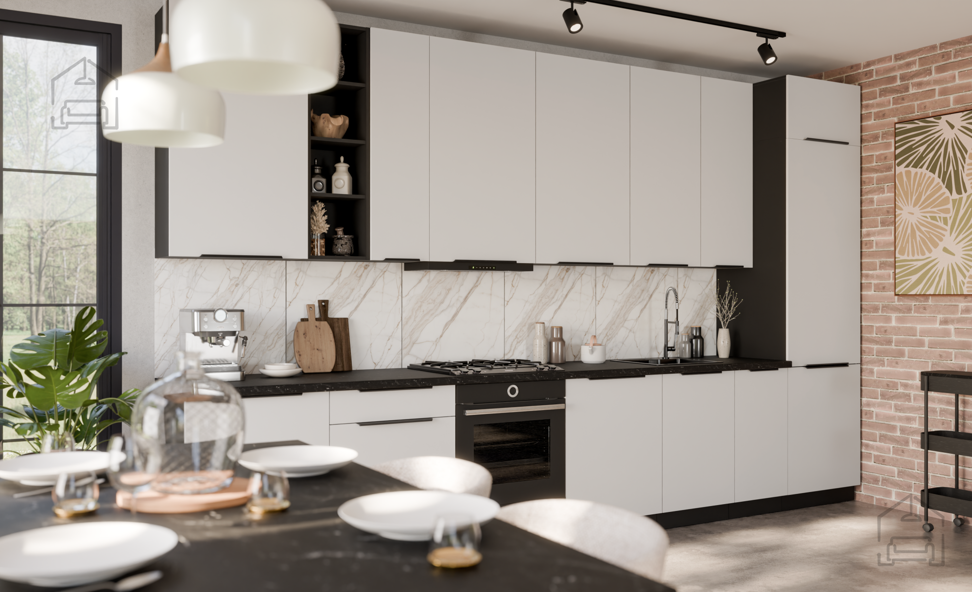 Barvna kombinacija belih in črnih površin doda prostoru prefinjen kontrast. Bela barva optično poveča prostor in ga naredi svetlejšega, črna pa vnaša sodoben, eleganten pridih. Takšen dizajn je primeren tako za manjše kot večje kuhinje, saj omogoča kombiniranje z različnimi tipi talnih in stenskih oblog.