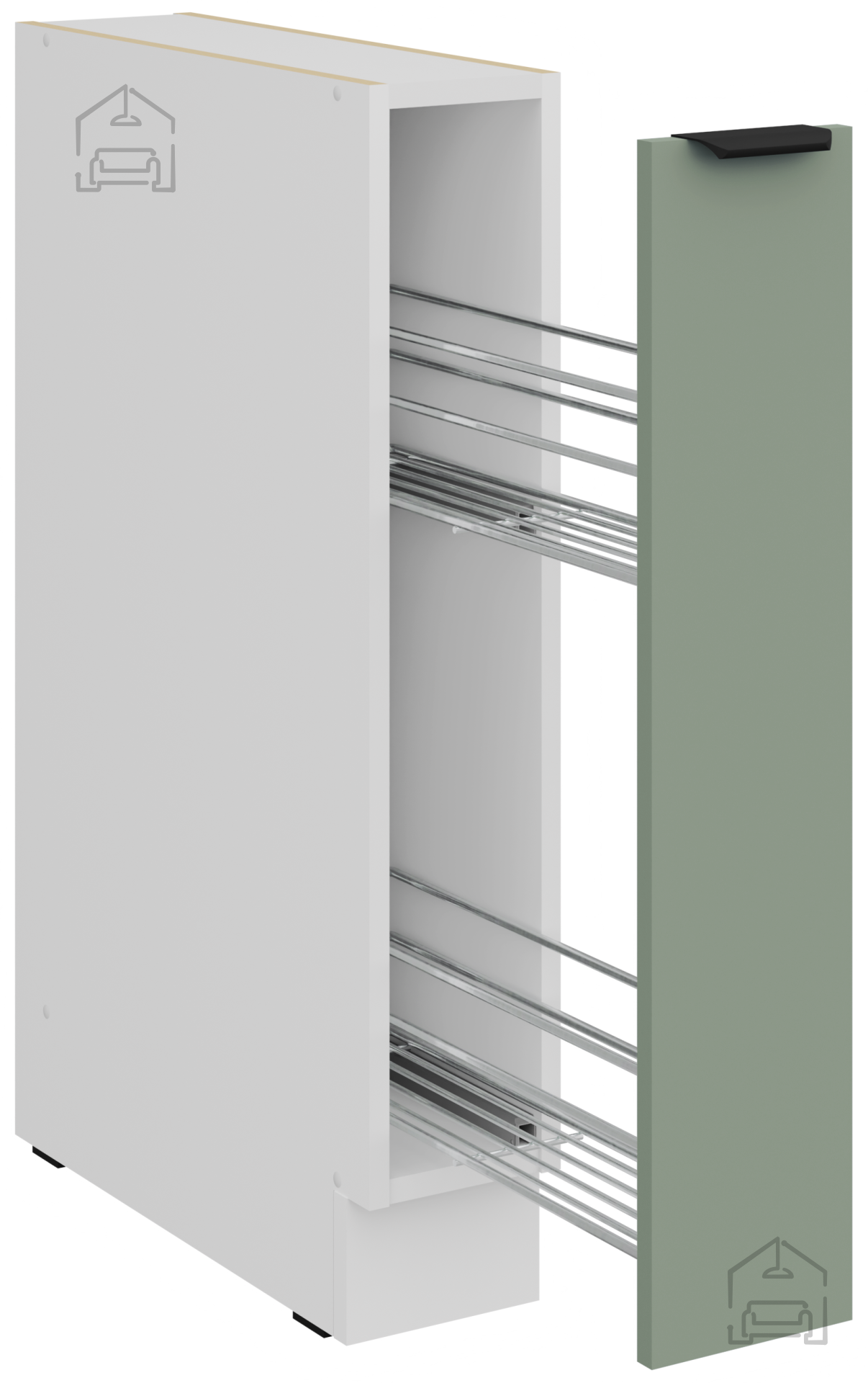 Osnova kuhinjskega sestava je okvir iz iverala, kar zagotavlja konstrukcijsko stabilnost in odpornost proti vsakodnevnim obremenitvam. Površina iz laminirane plošče debeline 16 mm je odporna na praske, madeže in toploto, kar jo naredi primerno za intenzivno kuhinjsko uporabo. Vse fronte in predali so opremljeni s sistemom za tiho zapiranje, ki preprečuje nenadne udarce in omogoča mehko zapiranje vratc. Ta mehanizem ne prispeva le k udobju, temveč tudi k daljši življenjski dobi okovja.