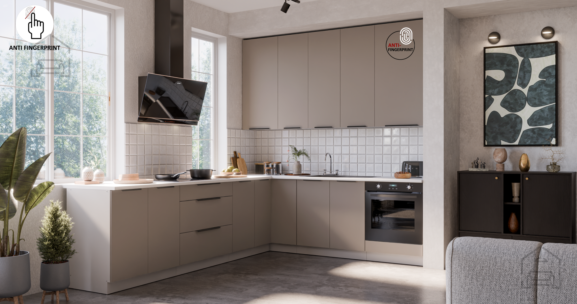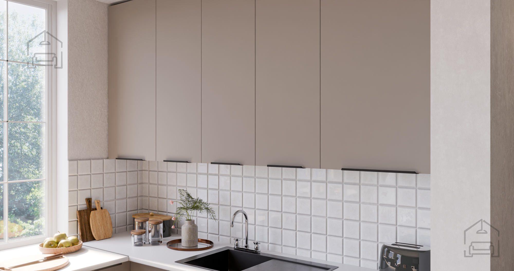 Barvna kombinacija sandgrau/bela (peščeno siva in bela) ustvarja svetel, zračen vtis, hkrati pa dodaja občutek topline in čistosti. Takšna zasnova omogoča enostavno kombiniranje z različnimi vrstami dekorja, talnih oblog in dodatkov. Bela barva vizualno poveča prostor in ustvarja občutek urejenosti, medtem ko peščeno sivi toni dodajo sodoben pridih in eleganco. Ročaji edge UA‑HEXA v črno‑aluminijasti izvedbi so minimalistični, a hkrati markantni, saj združujejo estetiko in praktičnost. Razmik ročajev znaša od 64 mm do 320 mm, kar omogoča udobno uporabo vseh vrat in predalov.