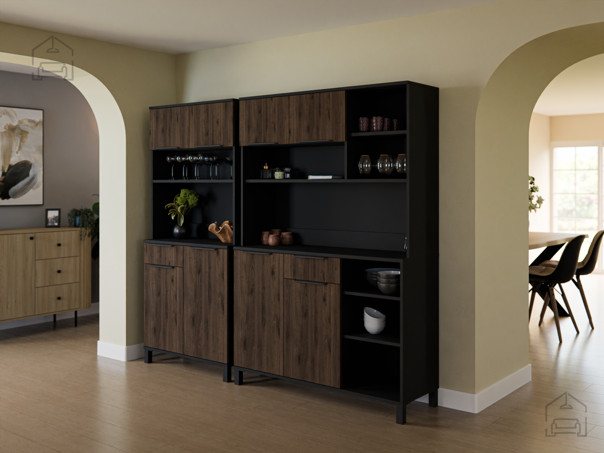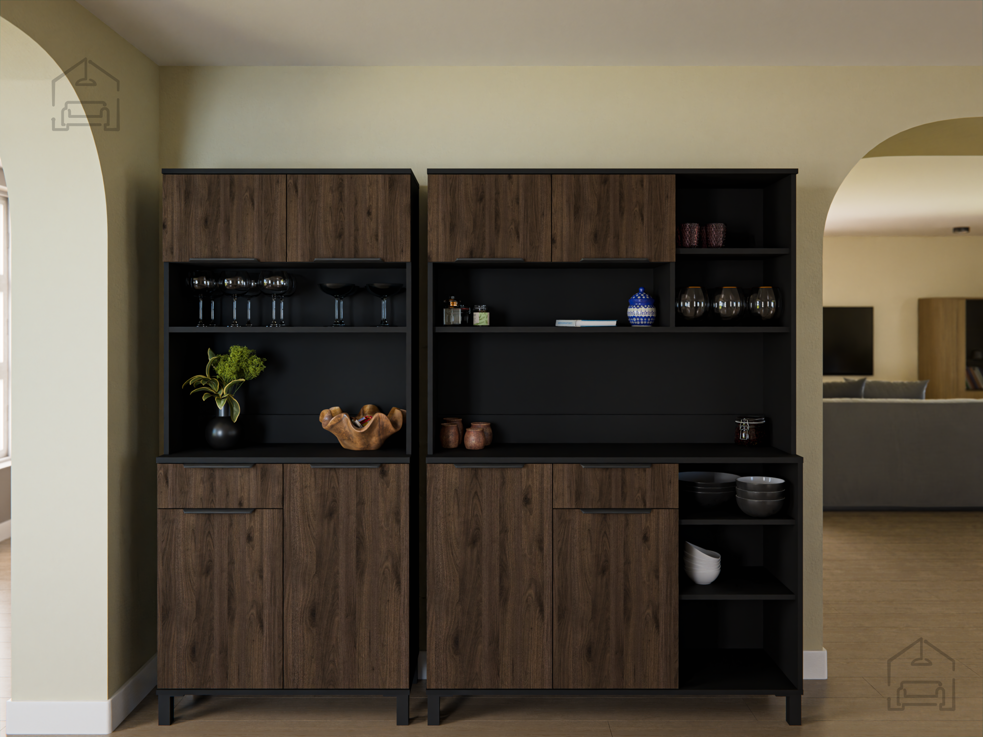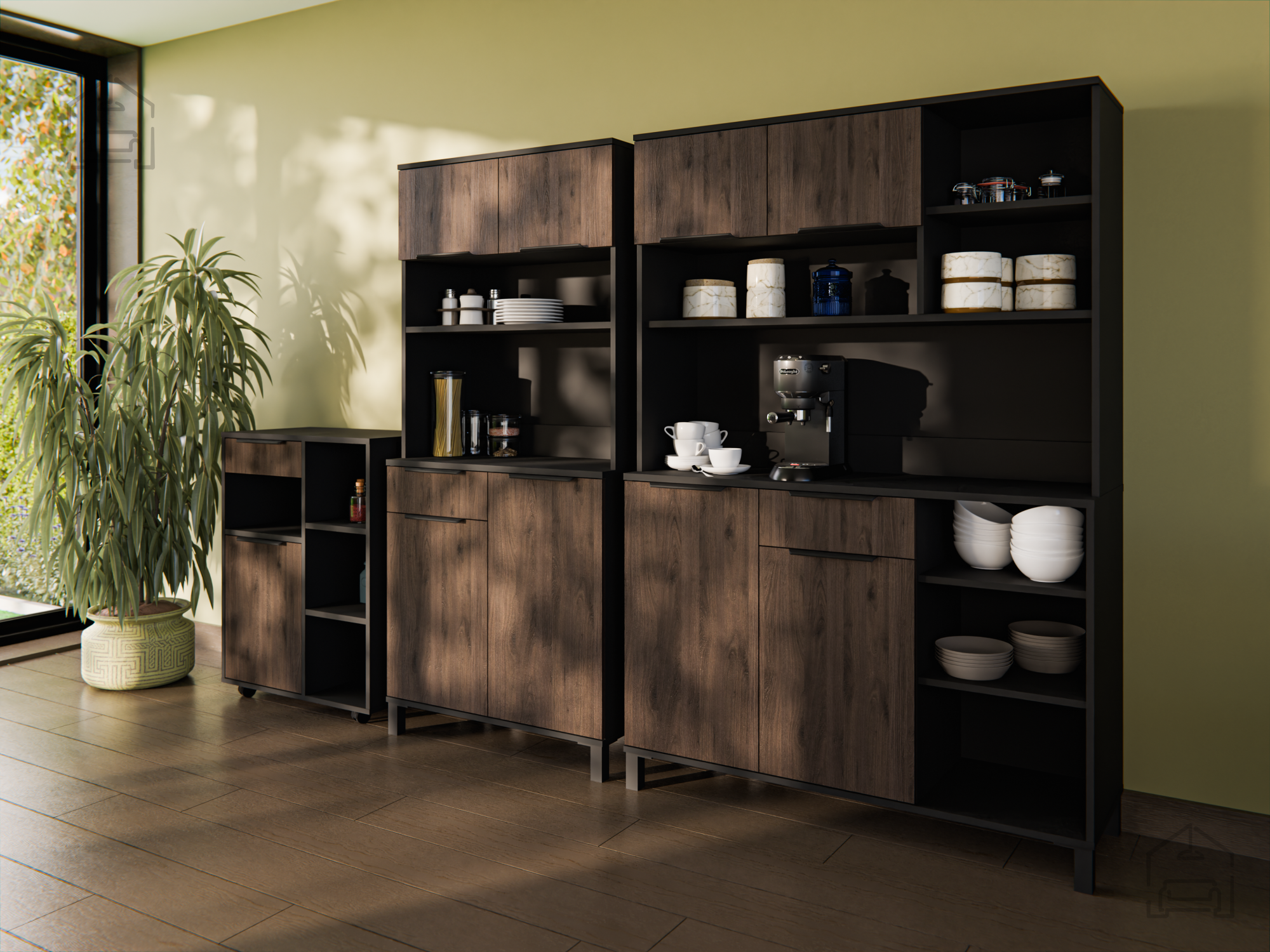 Kuhinjski sestav Monza je sodoben in funkcionalen komplet, izdelan v tovarni Stolarz-Lempert na Poljskem. Kombinacija trpežne laminirane plošče debeline 16 mm in elegantne barvne izvedbe oreh okapi/črna daje kuhinji prefinjen videz, ki se lepo ujema z različnimi stili notranje opreme – od klasičnih do modernih. Sestav je zasnovan tako, da ponuja učinkovito razporeditev elementov in omogoča praktično uporabo prostora.