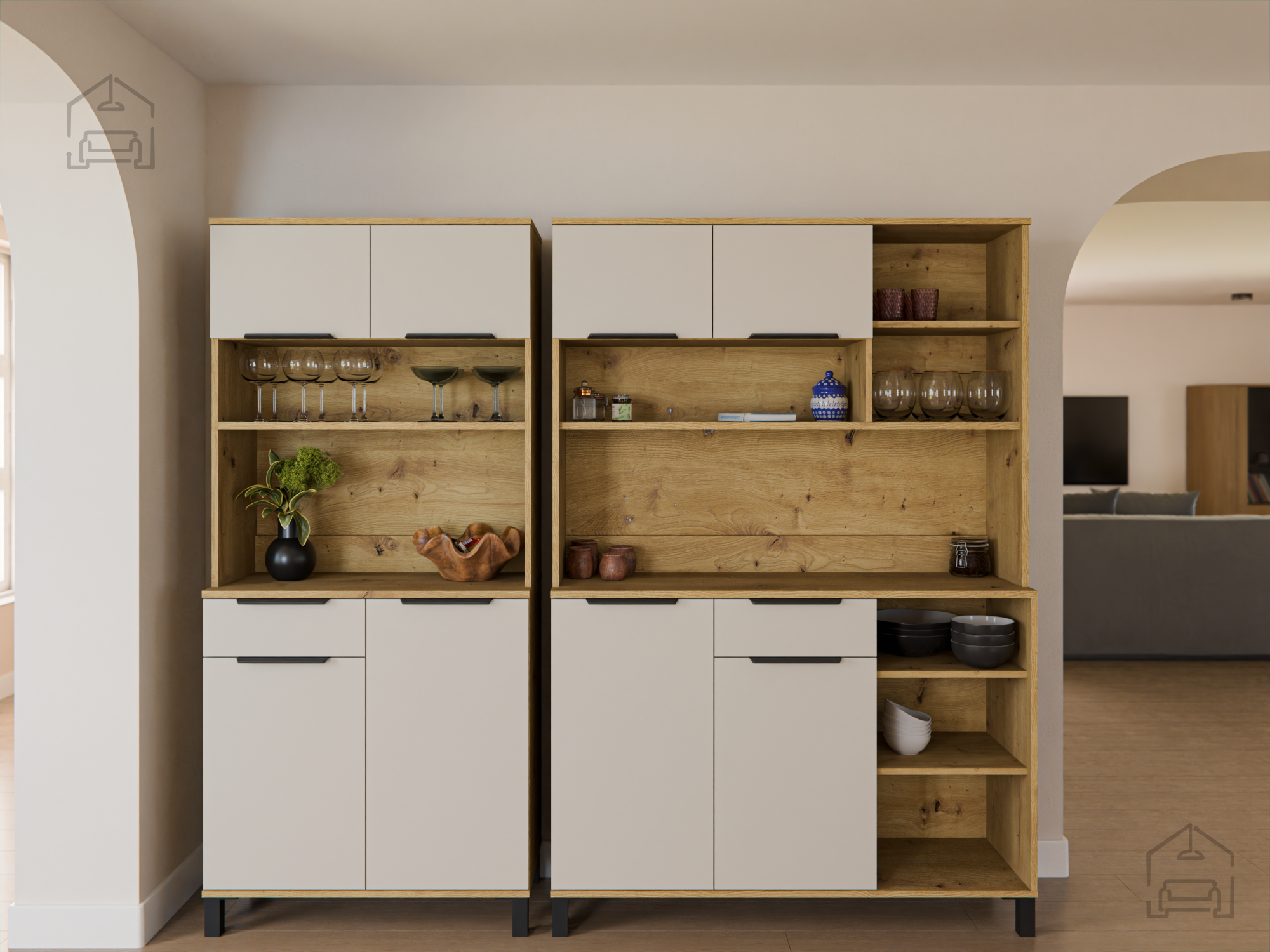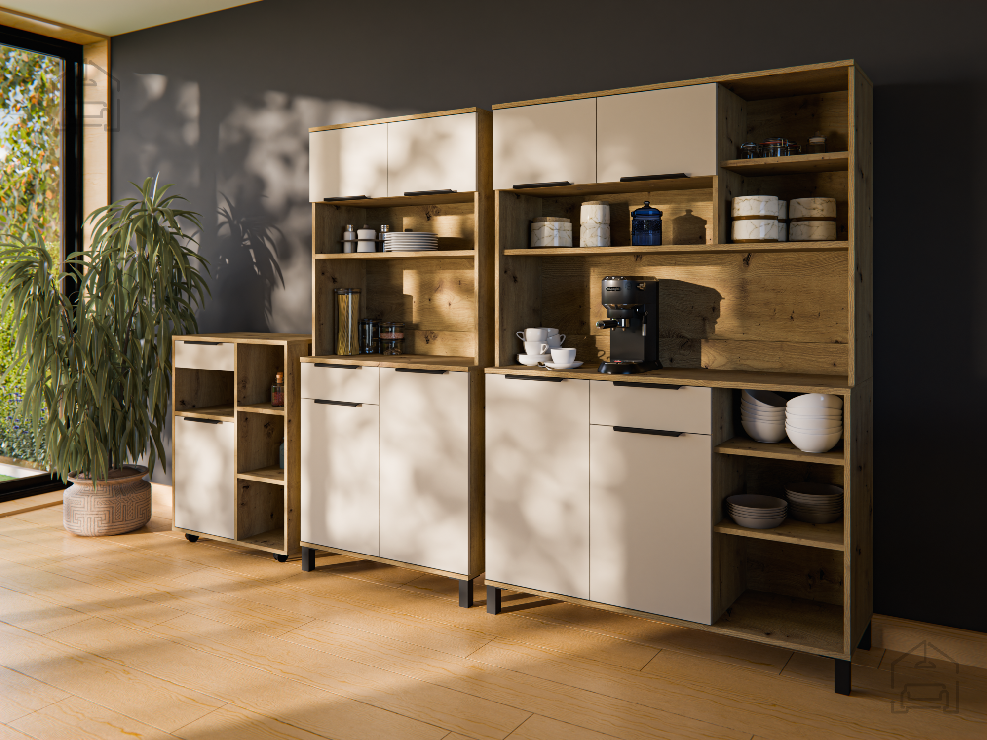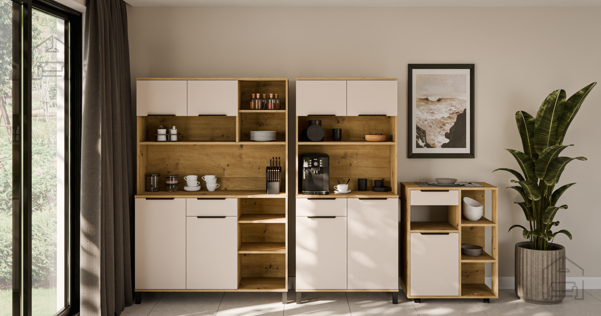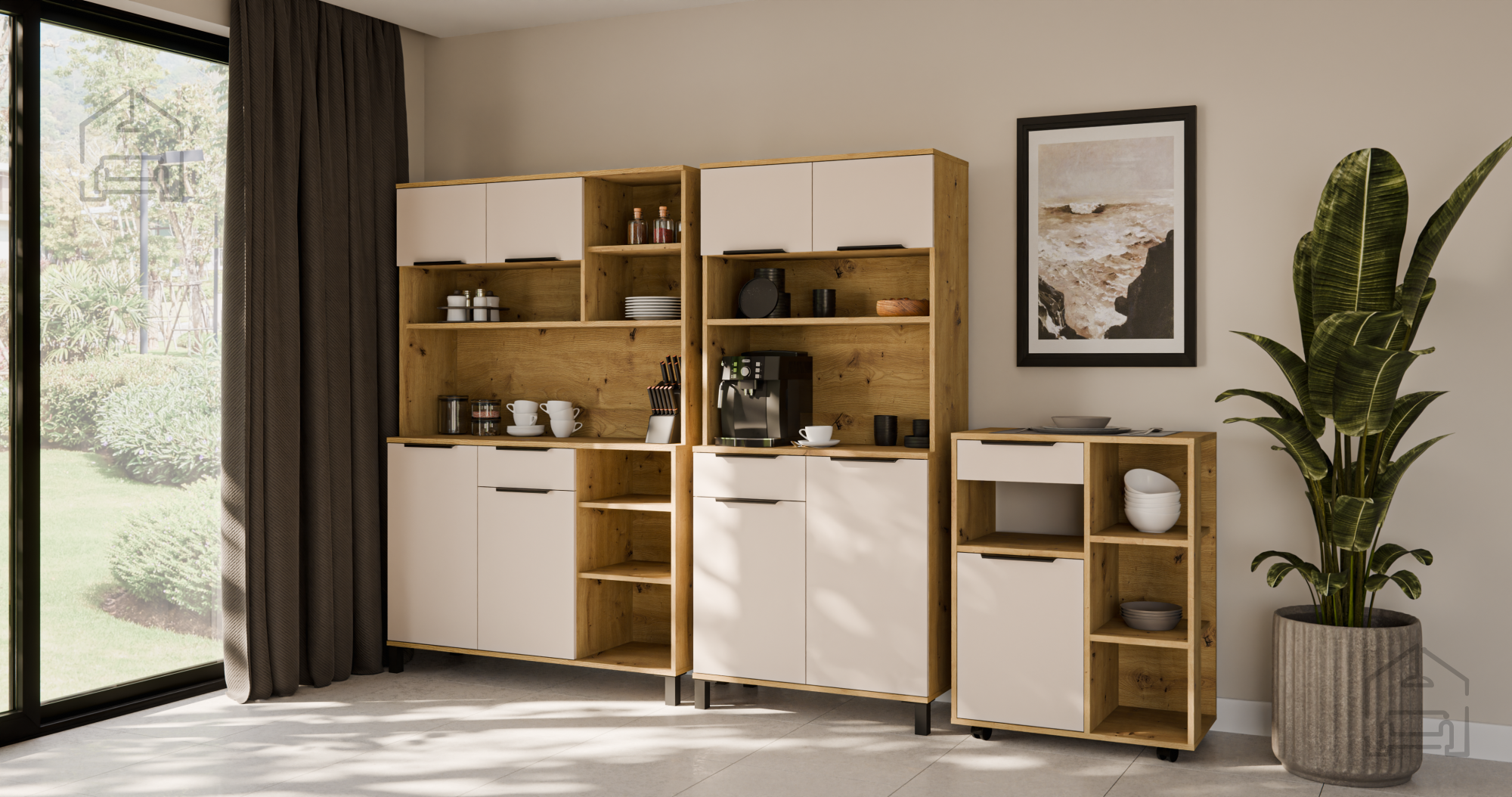 Solea je zasnovan kot kredenca oziroma manjši kuhinjski sestav, ki omogoča učinkovito organizacijo prostora. Čeprav so dimenzije izdelka navedene kot 0x0x0 cm, je namenjen uporabi kot kompakten element, primeren za manjše kuhinje, jedilnice ali celo dnevne prostore. Okvir je izdelan iz iverala, kar povečuje stabilnost konstrukcije in zagotavlja dolgo življenjsko dobo. Zaradi premišljene razporeditve polic in zaprtih omaric ponuja dovolj prostora za shranjevanje posode, jedilnega pribora, kozarcev in drugih kuhinjskih pripomočkov.