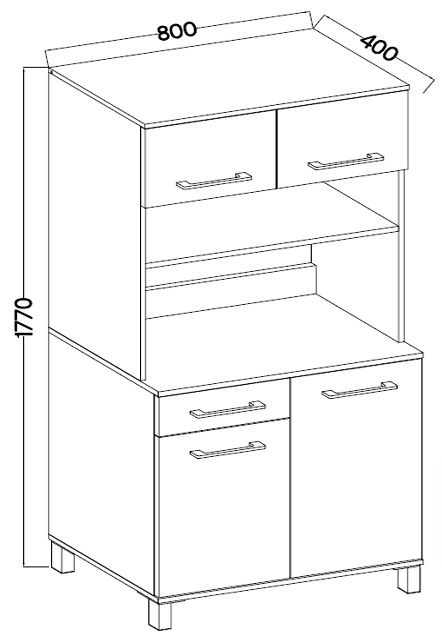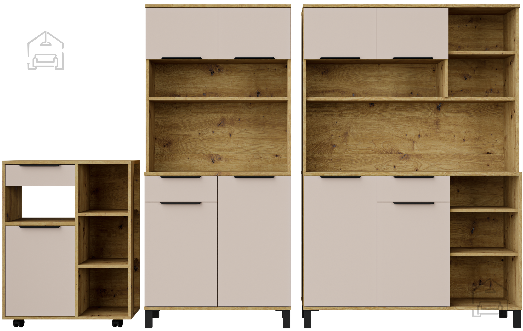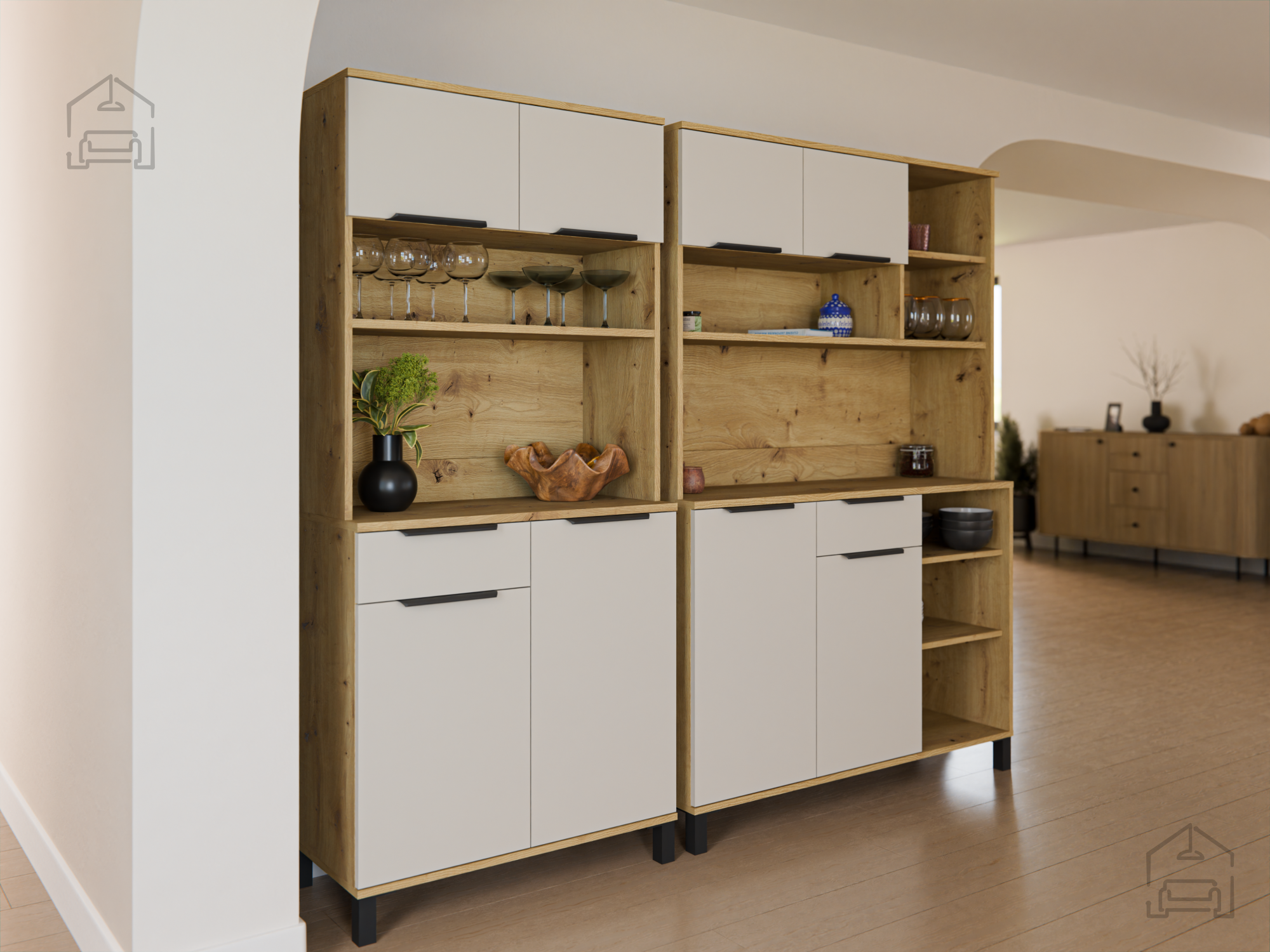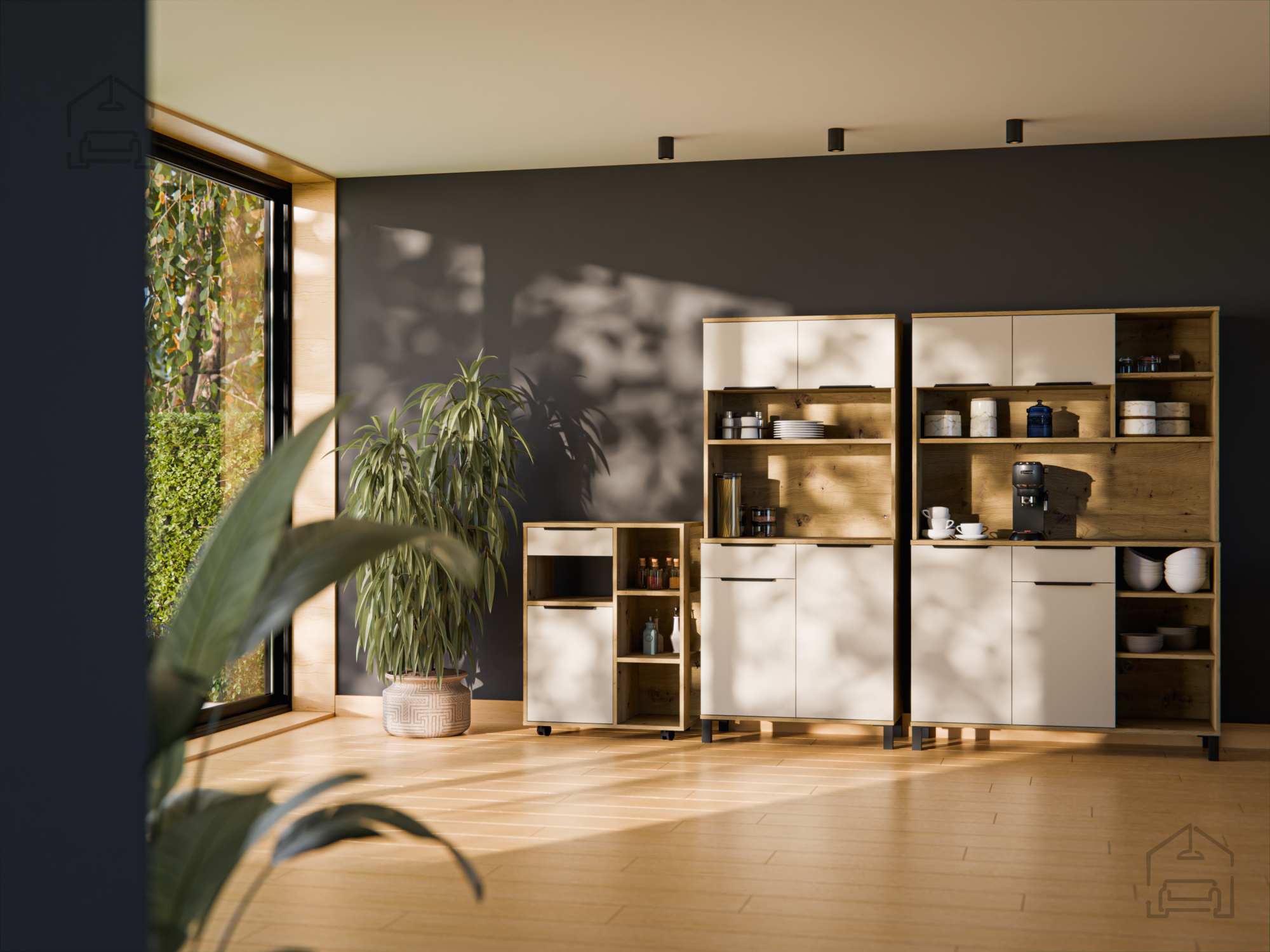 Solea je zasnovan kot kredenca oziroma manjši kuhinjski sestav, ki omogoča učinkovito organizacijo prostora. Čeprav so dimenzije izdelka navedene kot 0x0x0 cm, je namenjen uporabi kot kompakten element, primeren za manjše kuhinje, jedilnice ali celo dnevne prostore. Okvir je izdelan iz iverala, kar povečuje stabilnost konstrukcije in zagotavlja dolgo življenjsko dobo. Zaradi premišljene razporeditve polic in zaprtih omaric ponuja dovolj prostora za shranjevanje posode, jedilnega pribora, kozarcev in drugih kuhinjskih pripomočkov.