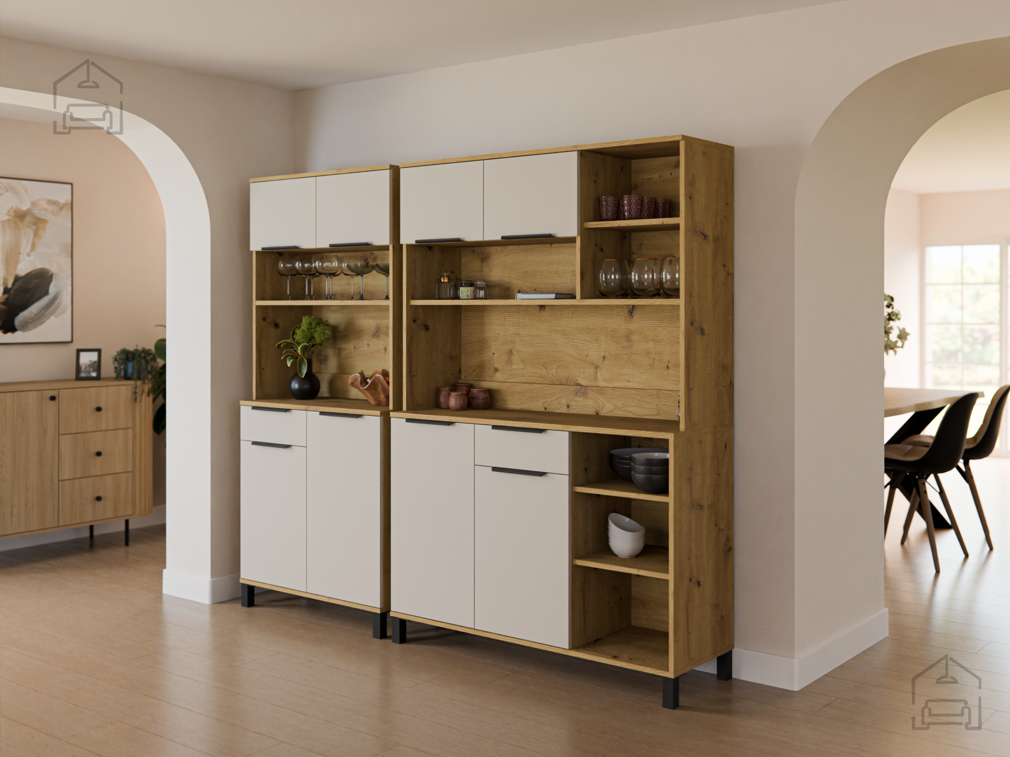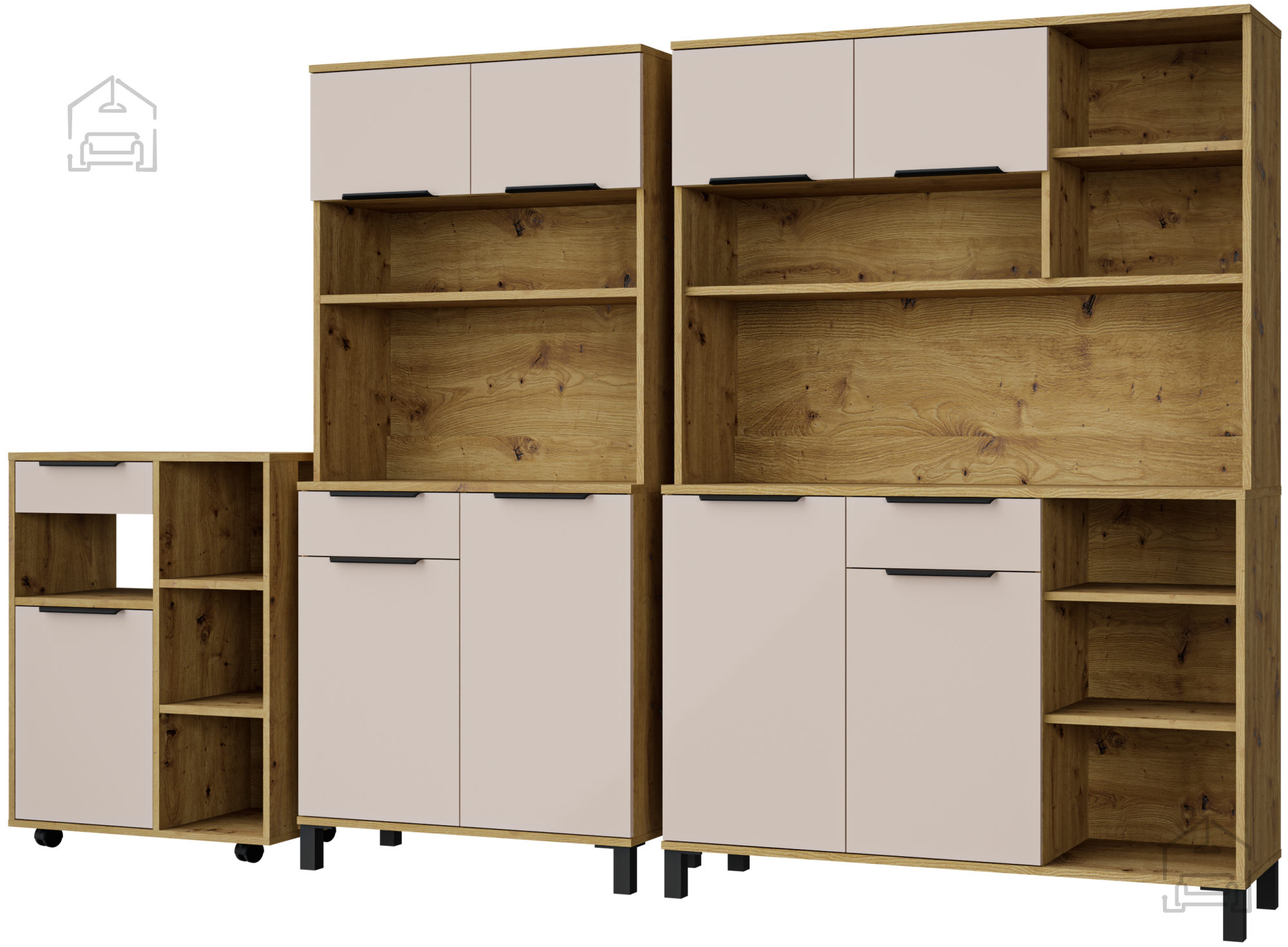 Kuhinjski sestav Solea je eleganten in funkcionalen kos pohištva, zasnovan za sodobne kuhinje, kjer se prepletata estetika in praktičnost. Kombinacija barv kašmir in artisan hrast ustvarja prijeten, topel videz, ki poudari naravne tone lesa in se lepo ujema z različnimi notranjimi slogi. Izdelan je v priznani tovarni Stolarz-Lempert na Poljskem, kar zagotavlja kakovostno izdelavo in natančno pozornost do detajlov. Ta kredenca je primeren za tiste, ki cenijo urejen prostor in iščejo pohištvo, ki združuje lepoto in uporabnost v enem kosu.